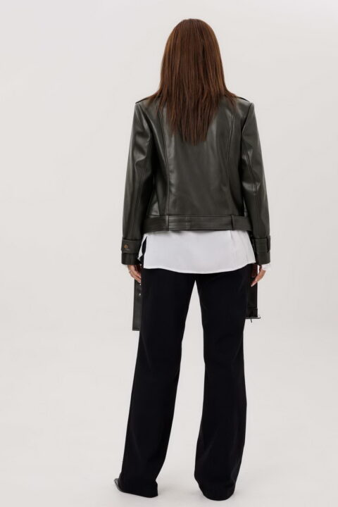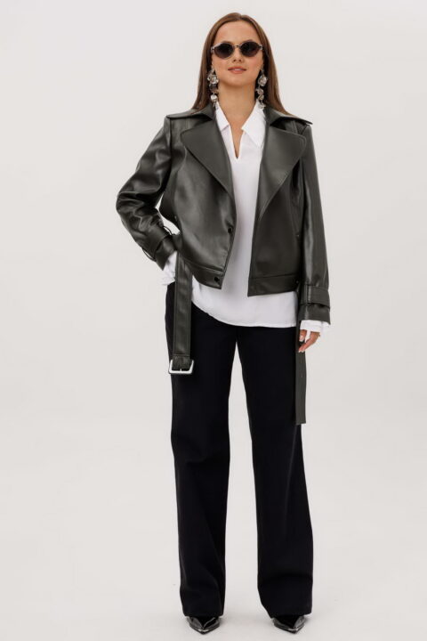 Описание: Жакет женский, укороченная, прямого силуэта на подкладке, выполнена из качественной экокожи. Застёжка двубортная на кнопки. По переду рельефы от плеча до низа и прорезные карманы с листочкой. Спинка с рельефами от плеча до низа. По низу куртки приточная планка со шлёвками, в которые продет пояс с пряжкой. Воротник отложной на стойке. Рукава двух шовные втачные, по низу паты продеты в шлёвки на кнопках.