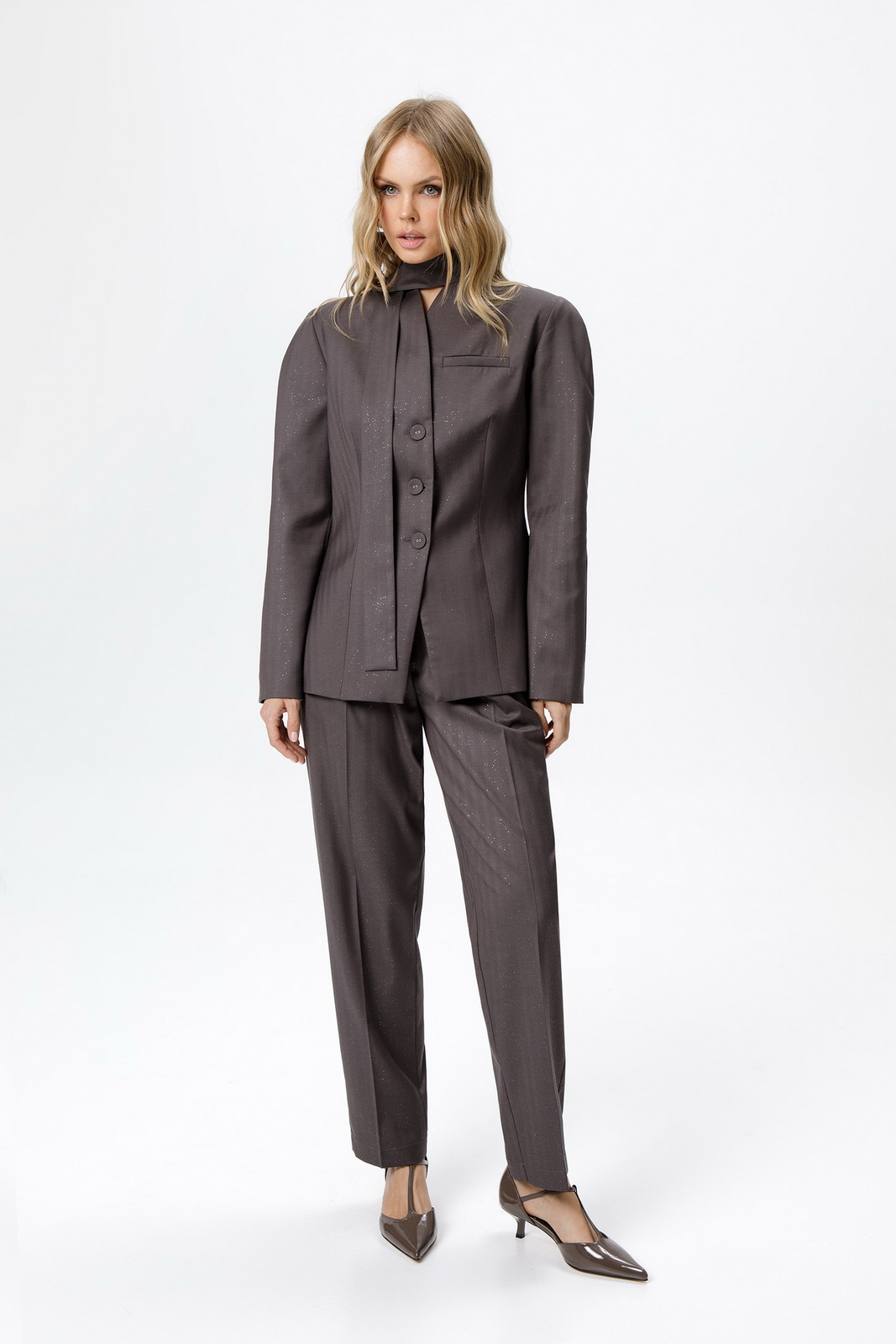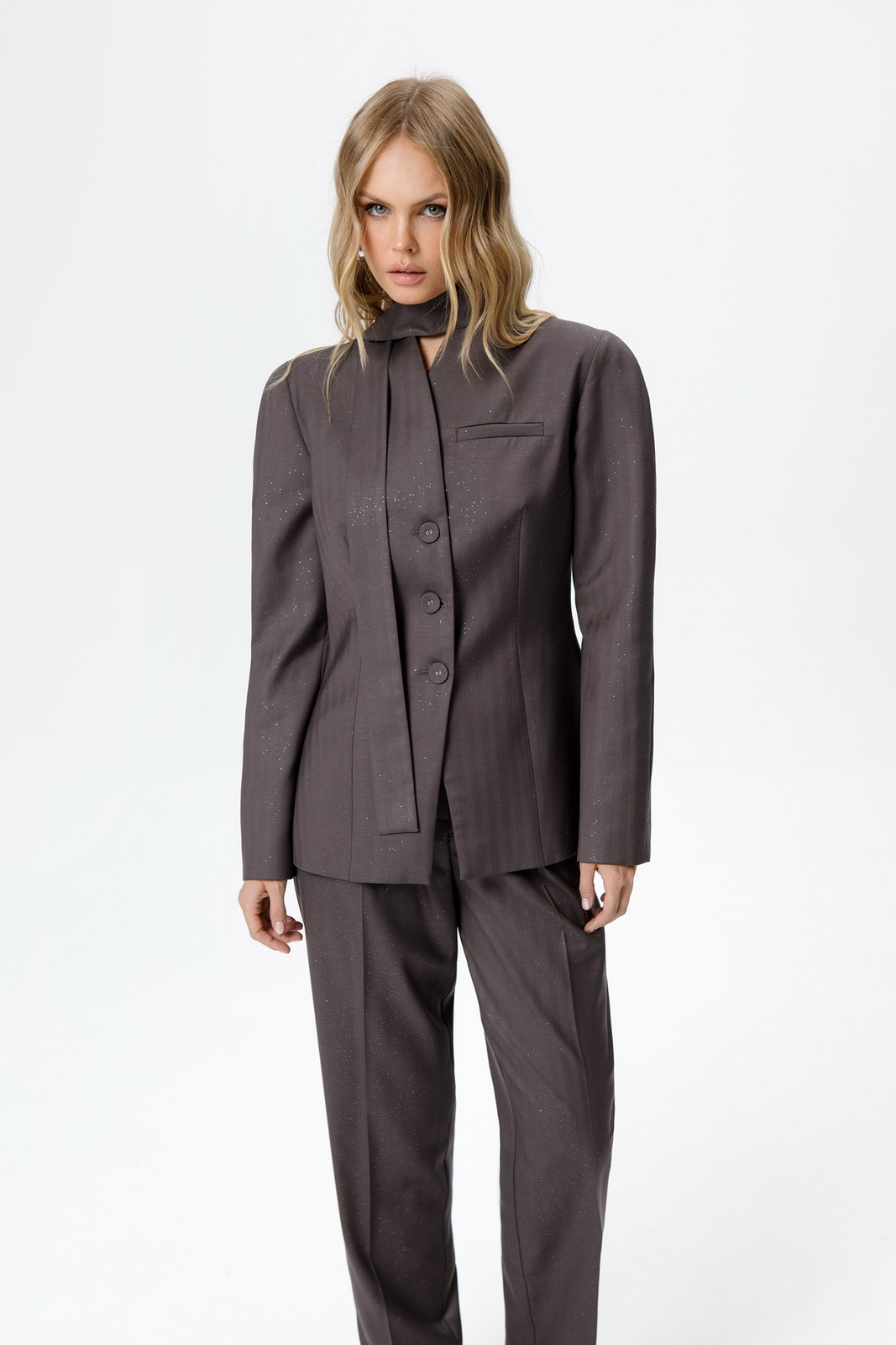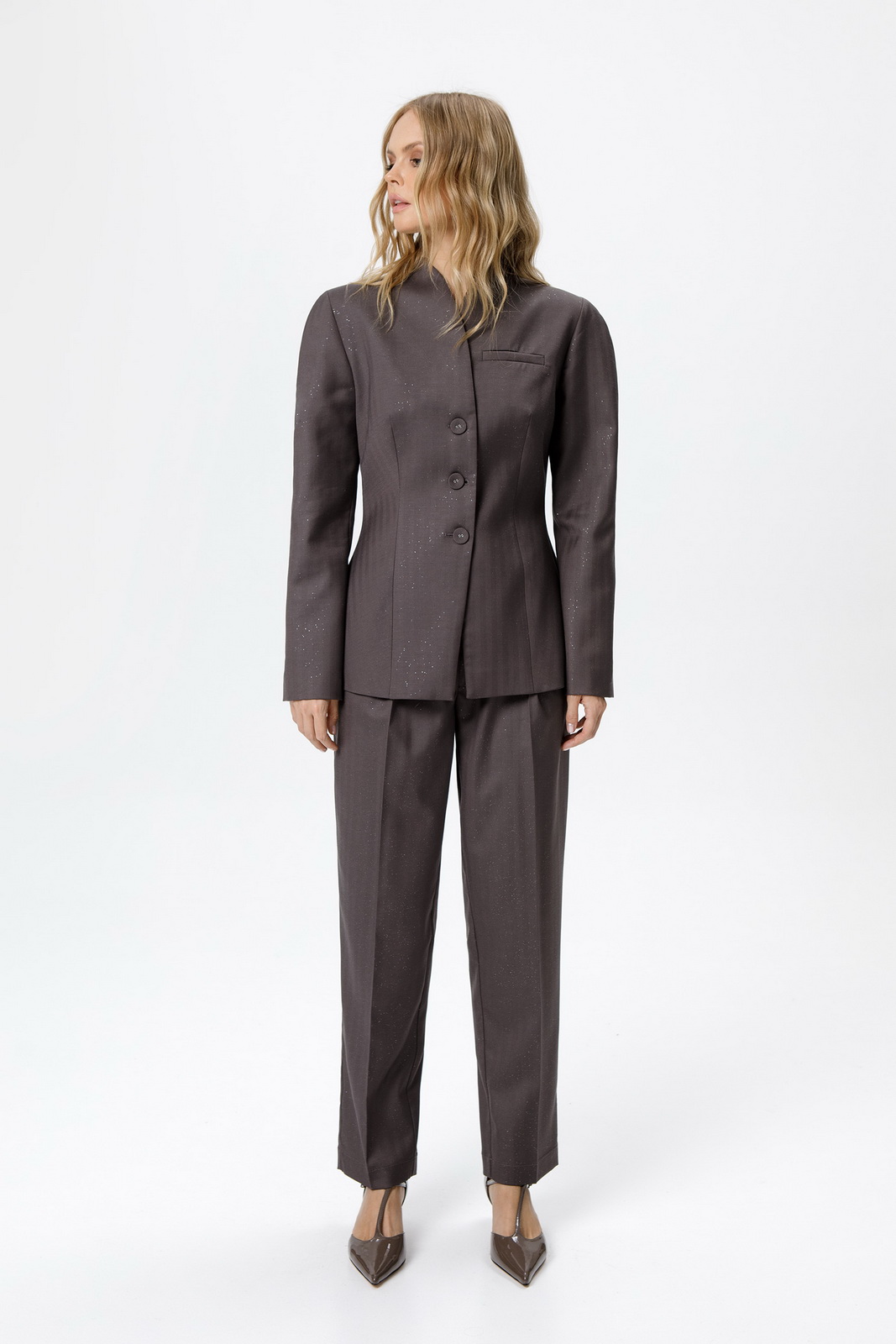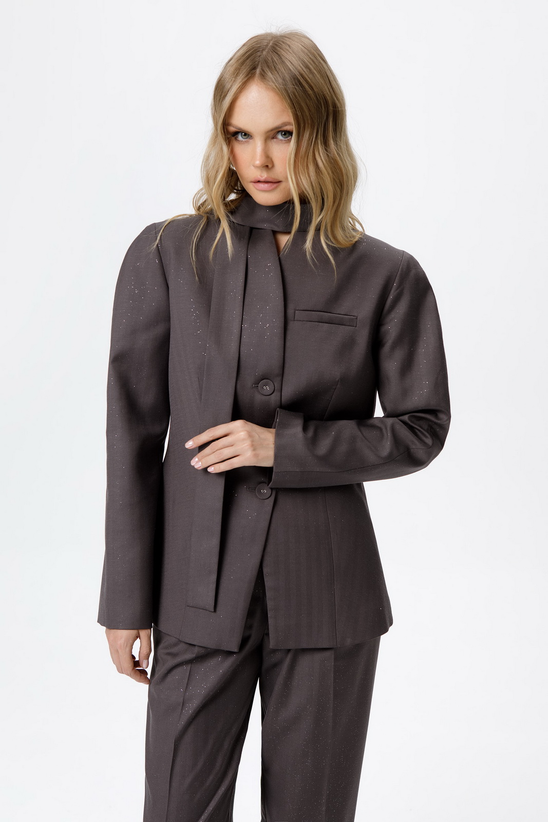Описание: Приталенный жакет с акцентными плечами и воротником-стойкой.