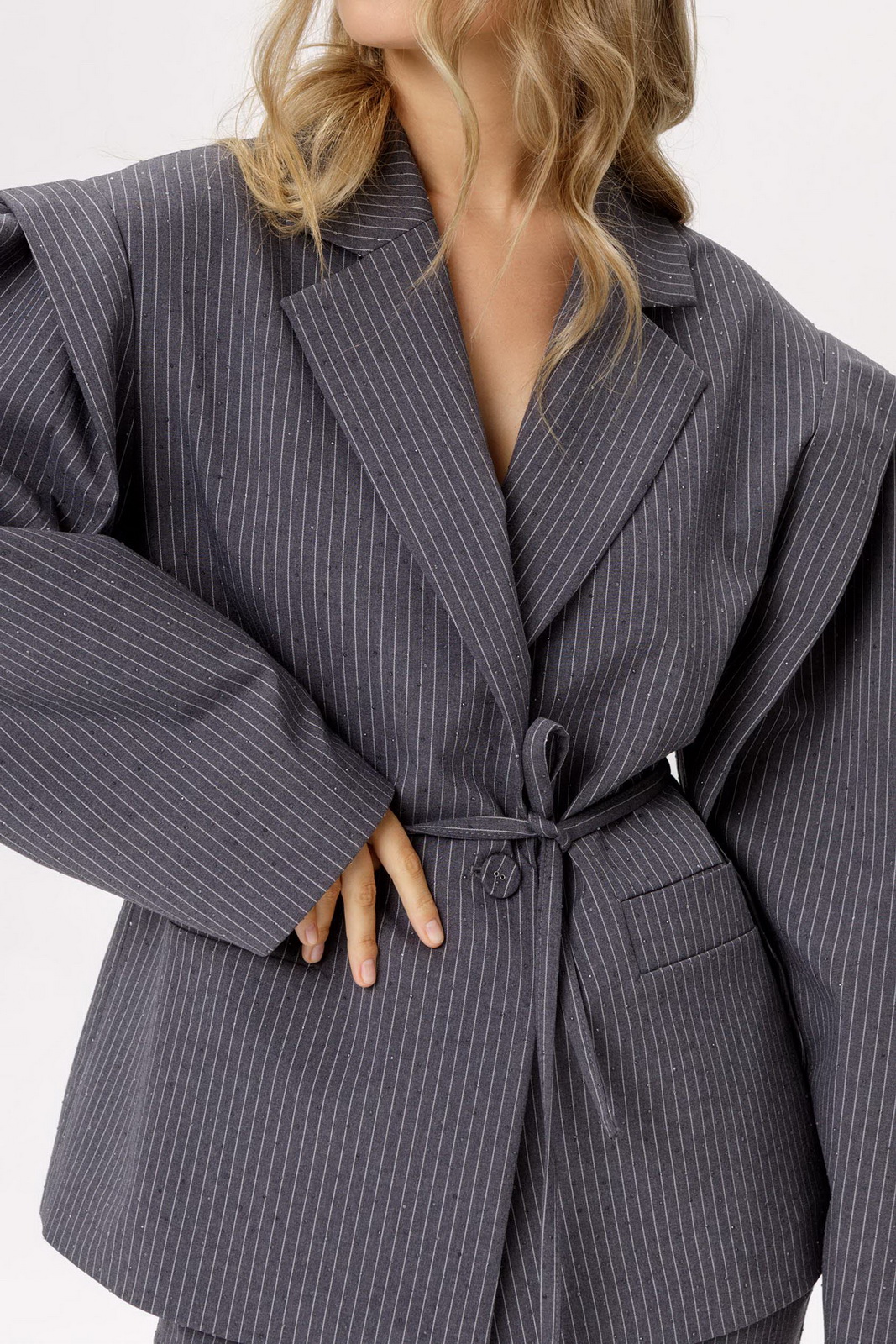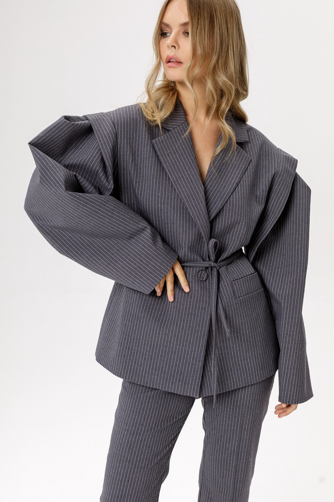Детали: жакет прямого силуэта, удлинённая линия плеча, втачной одношовный рукав с ассиметричными складками, функциональные карманы, центральная застёжка на петлю и пуговицу, жакет на подкладке, съемный пояс.