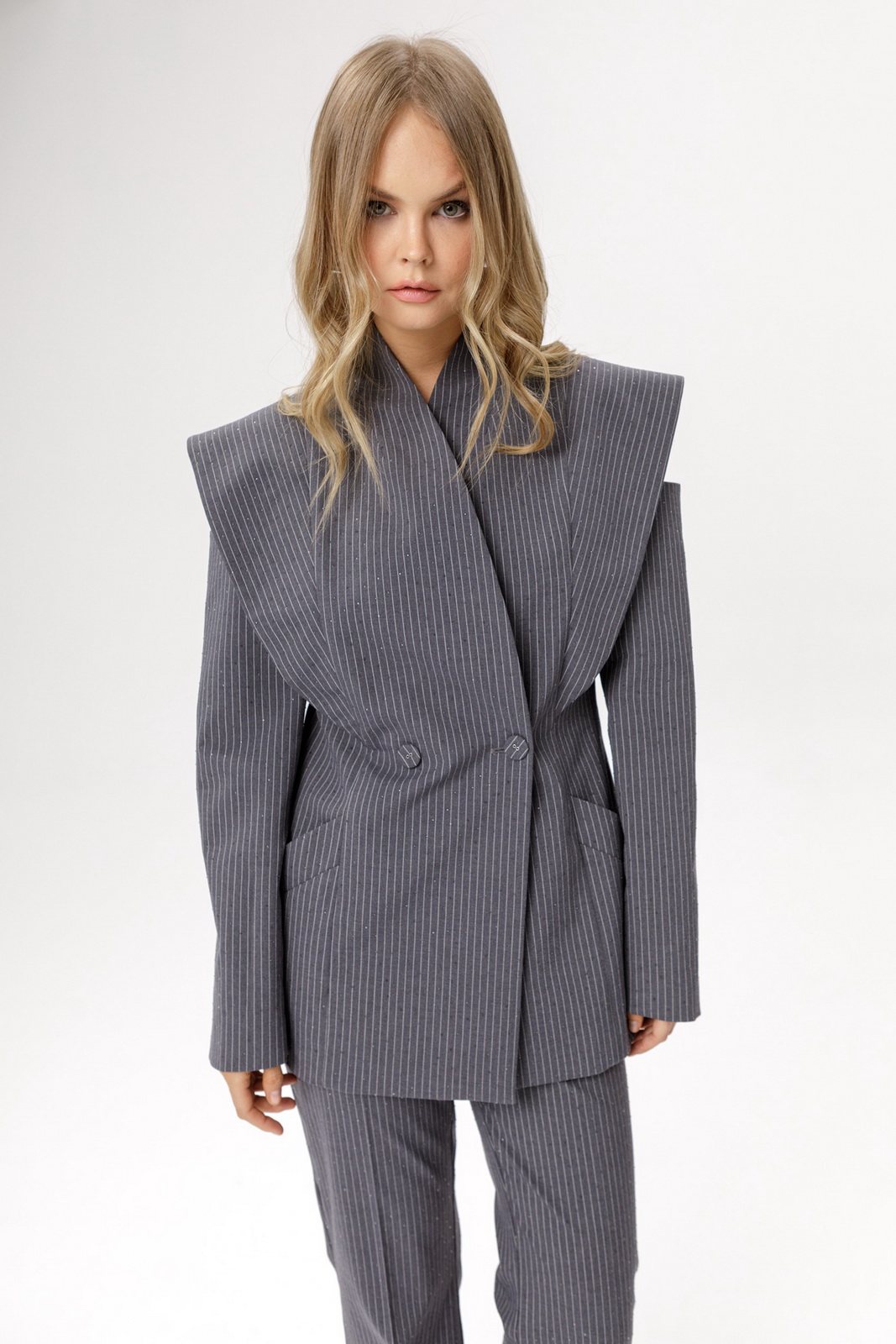 Детали: полуприлегающий силуэт, цельнокроеный воротник-стойка, двубортная застёжка на петли и пуговицы, рельефные швы переда и спинки с декоративным элементом, рукава длинные с вырезами по верху, функциональные карманы, жакет на подкладке.