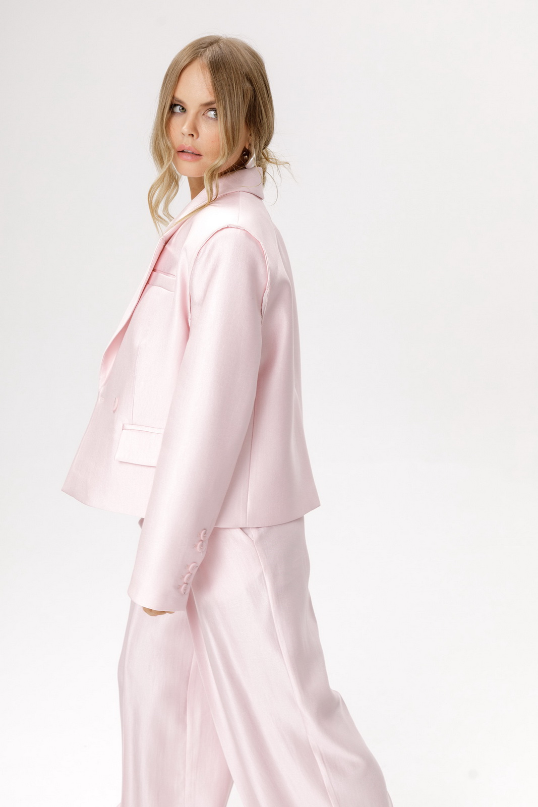 Детали: жакет прямого силуэта, пиджачный воротник, двубортная застежка на две петли и пуговицы, функциональные карманы, спинка с фигурной кокеткой, рукава втачные, жакет на подкладке.
