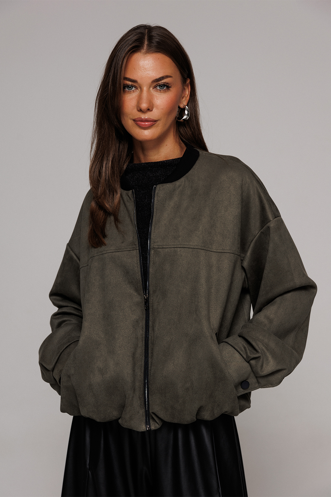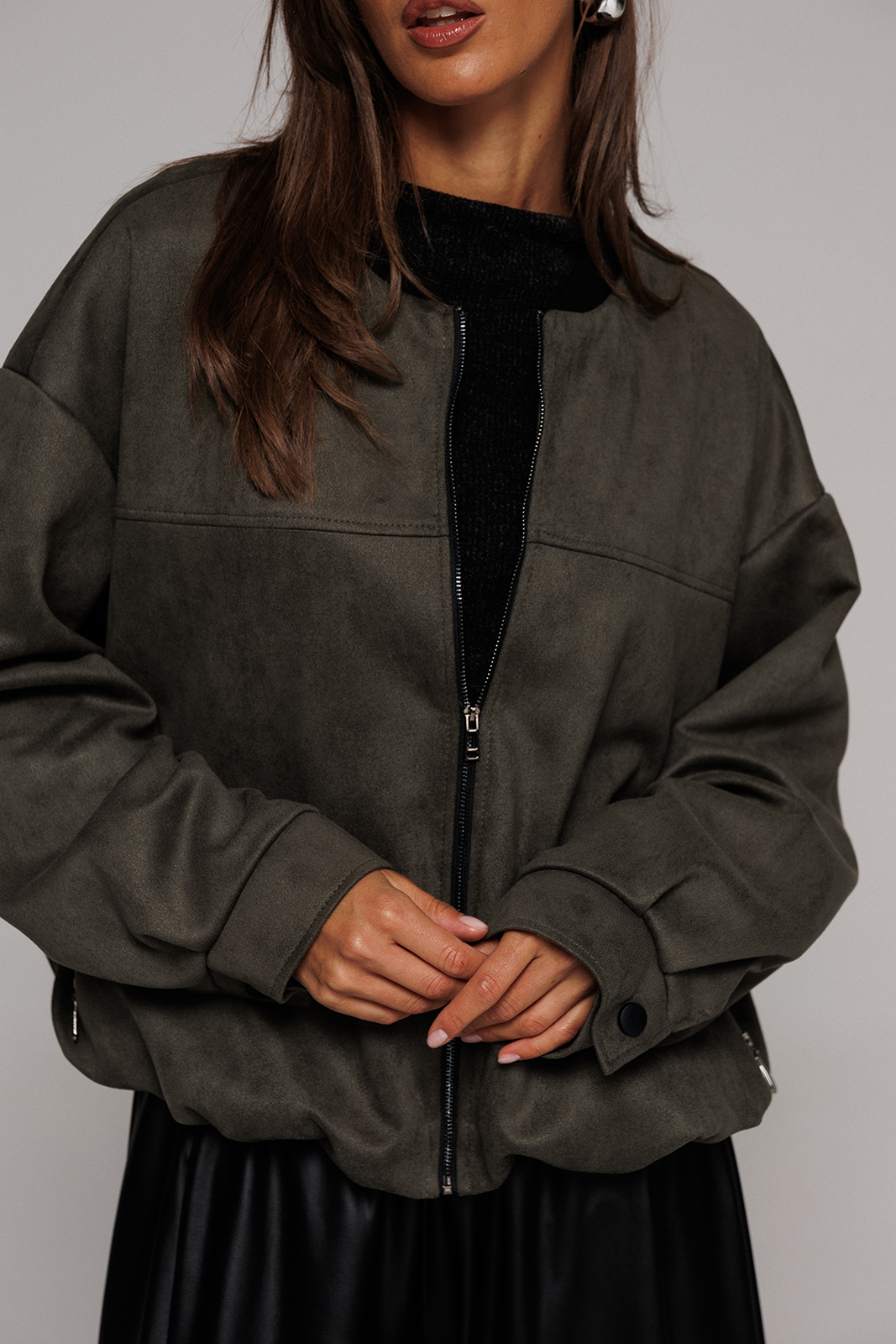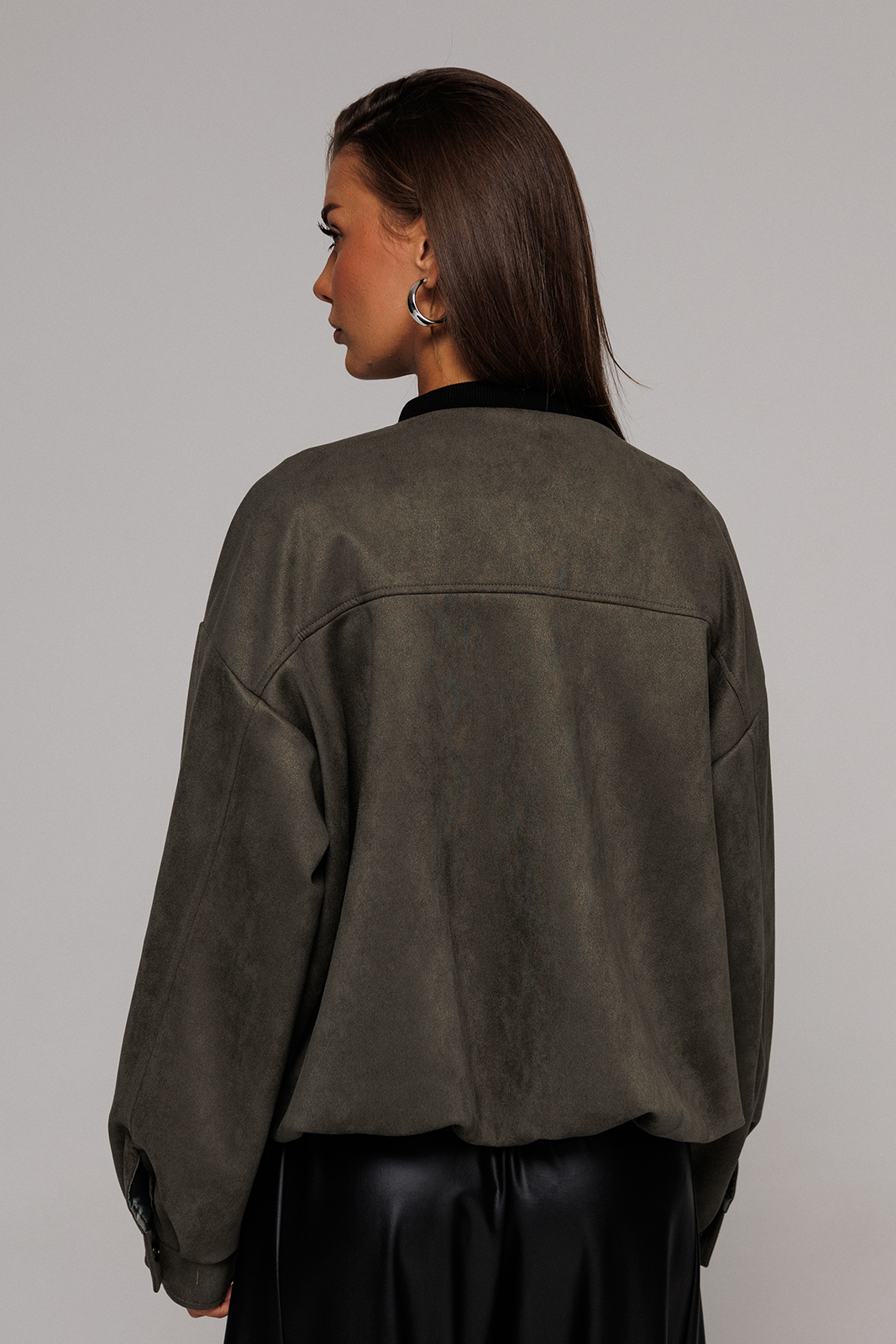 Описание: Жакет-бомбер из искусственной замши свободного силуэта со спущенной линией плеча. Рукав втачной двухшовнный, внизу со складками, притачной манжетой с застежкой на кнопку. Полочка с застежкой на тесьму молнию, с кокеткой и карманами с застежкой на молнию. Синка с кокеткой. По горловине планка из довяза. Низ жакета-бомбера со сборкой. Изделие на подкладке.