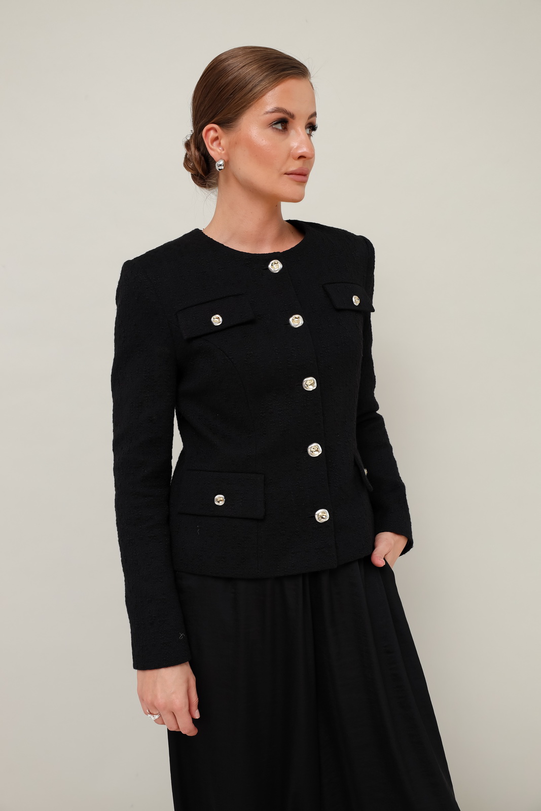 Описание: Жакет полуприлегающего силуэта, выполнен из структурной ткани. Округлый вырез горловины. Застежка центральная на петли и пуговицы. Спереди обработаны декоративные клапаны с пуговицами. Рукава втачные двухшовные. Спинка со средним швом и рельефами. Жакет на подкладке.