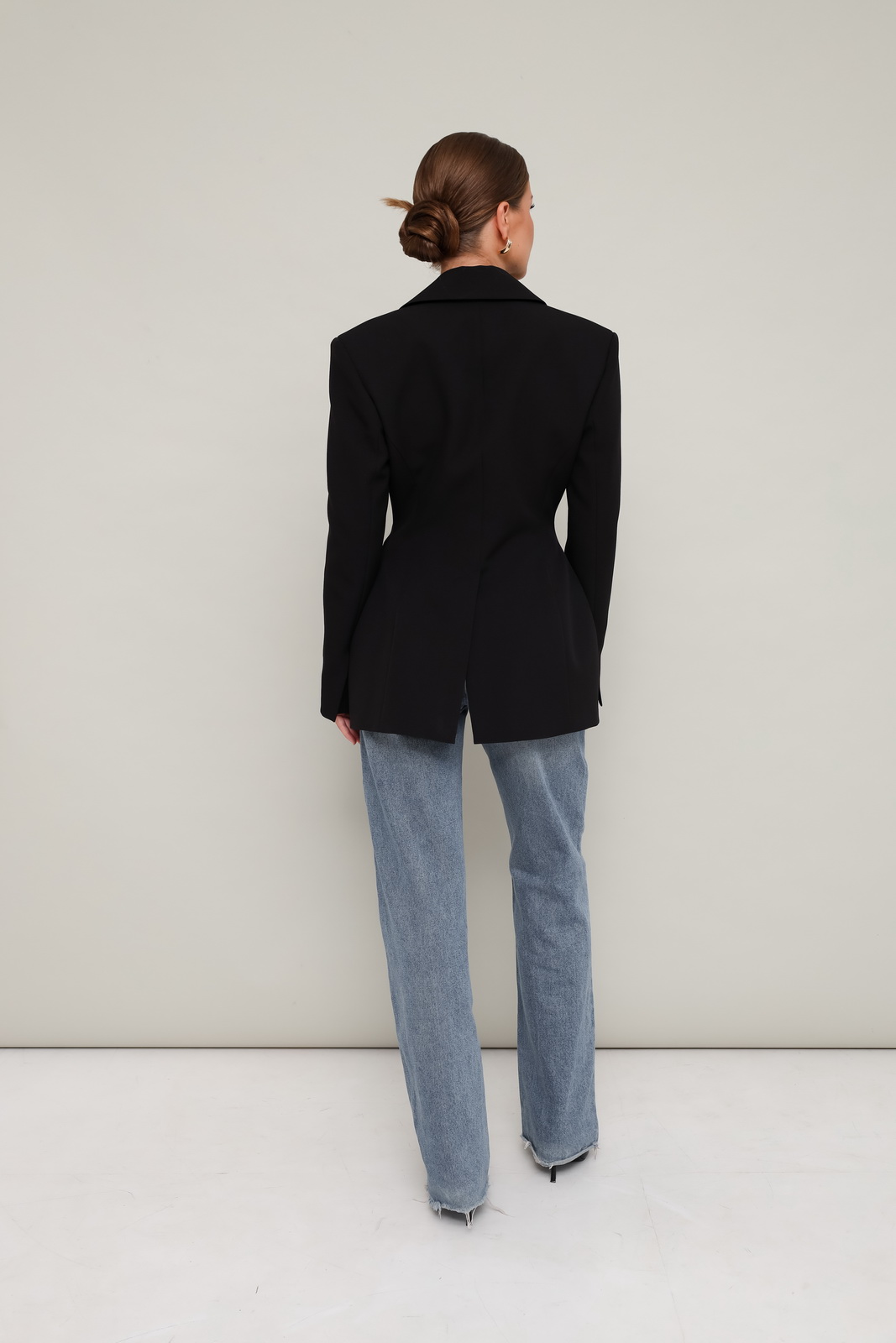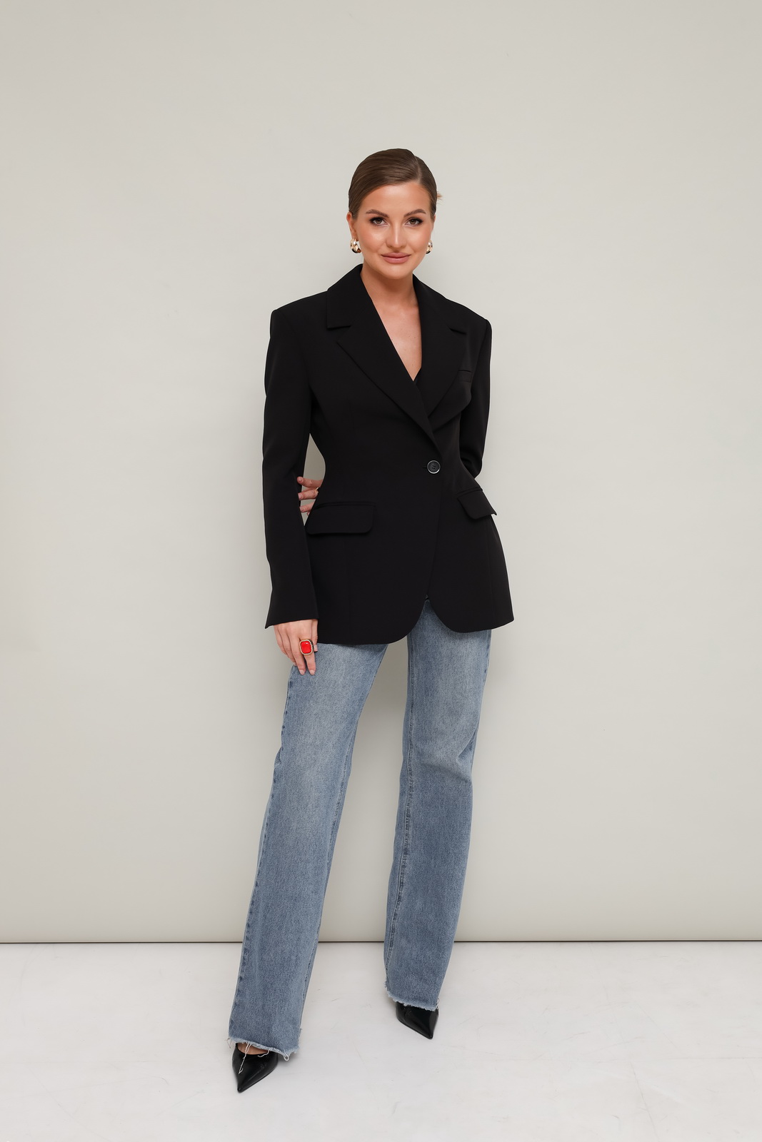 Описание: Силуэтный жакет с подчеркнутой линией талии. Смещенная застежка на петлю и пуговицу. Воротник пиджачного типа с отложными лацканами, край борта скругленный по низу жакета. Спереди обработаны прорезные карманы в рамку с клапанами и нагрудный прорезной карман с листочкой. Рукава втачные, двухшовные с отлетнымм шлицами. Спинка с рельефами и средним швом, переходящим в шлицу. Изделие на подкладке.