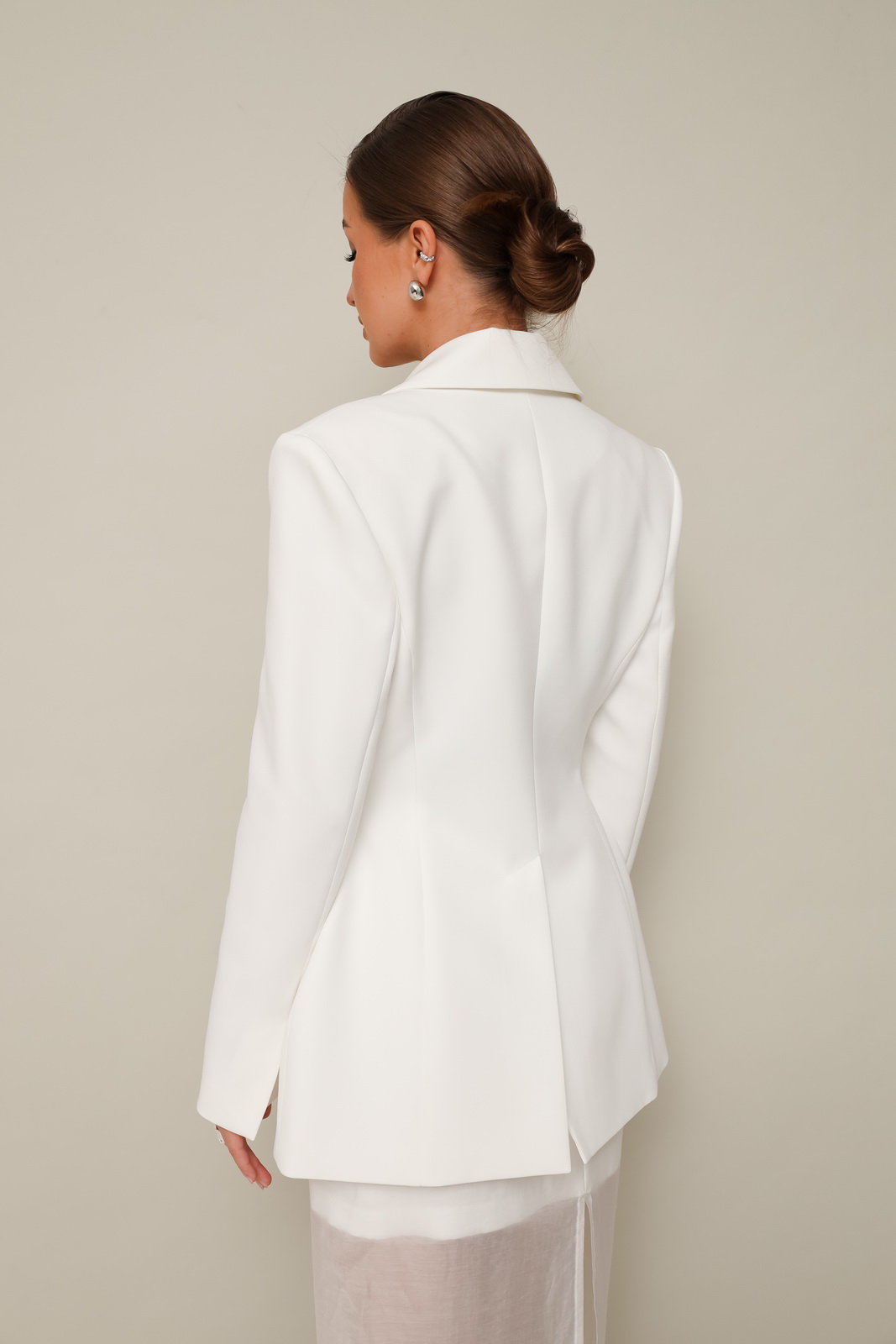 Описание: Силуэтный жакет с подчеркнутой линией талии. Смещенная застежка на петлю и пуговицу. Воротник пиджачного типа с отложными лацканами, край борта скругленный по низу жакета. Спереди обработаны прорезные карманы в рамку с клапанами и нагрудный прорезной карман с листочкой. Рукава втачные, двухшовные с отлетнымм шлицами. Спинка с рельефами и средним швом, переходящим в шлицу. Изделие на подкладке.