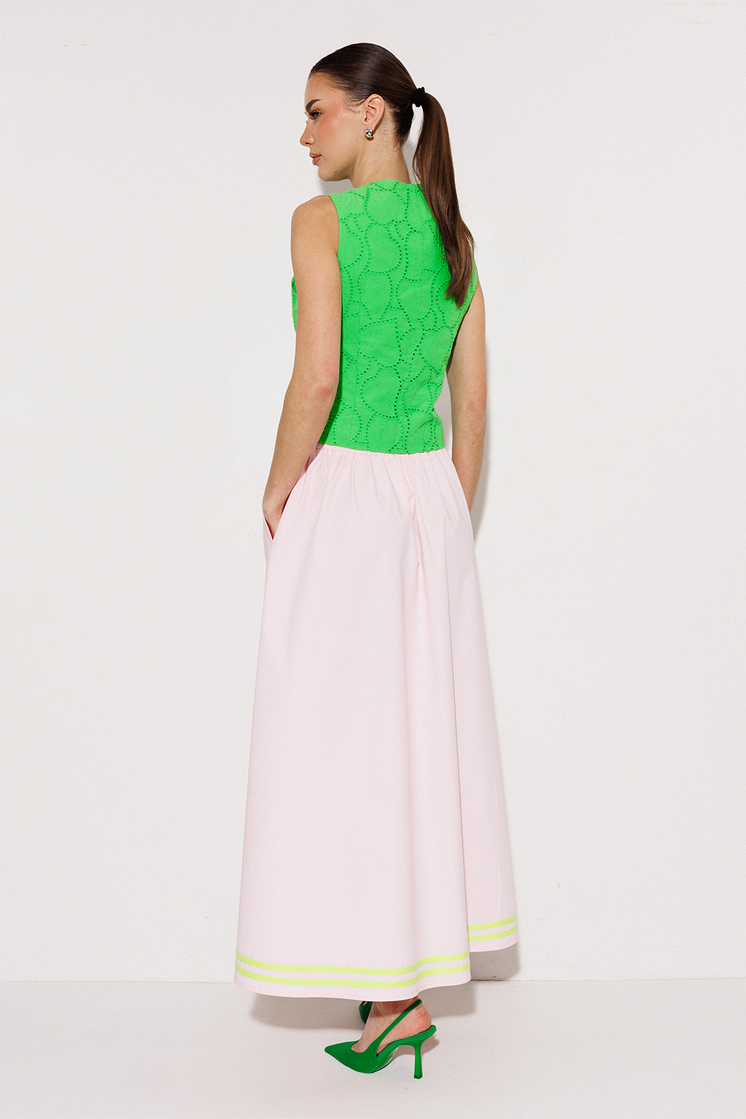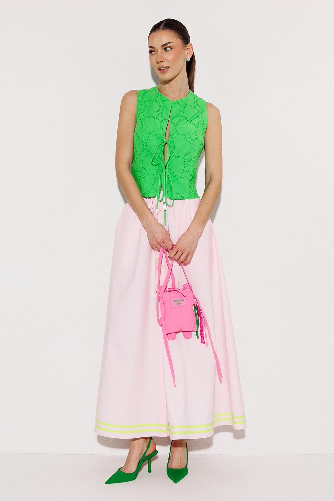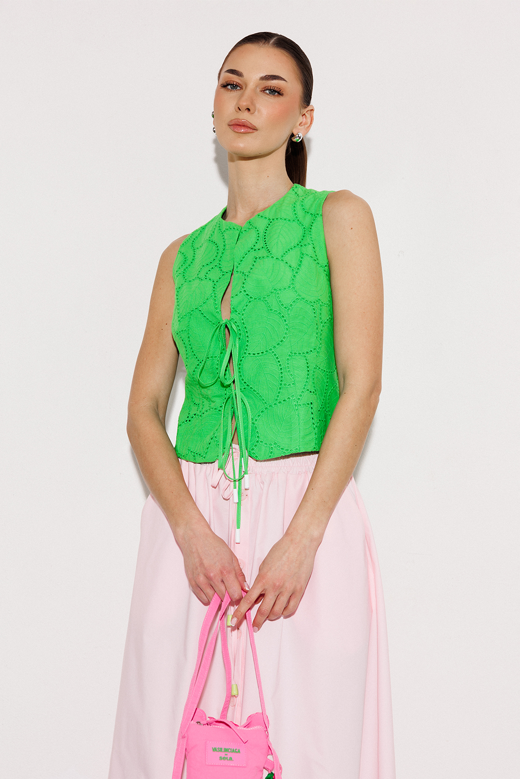 Описание: Жилет из ажурного шитья полуприлегающего силуэта без рукавов. Полочка с центральной застежкой на завязки и крючок, с 2-мя вертикальными вытачками от низа для лучшего прилегания изделия. Спинка с вертикальной вытачкой от низа и центральным швом. Жилет на подкладке из хлопка.
