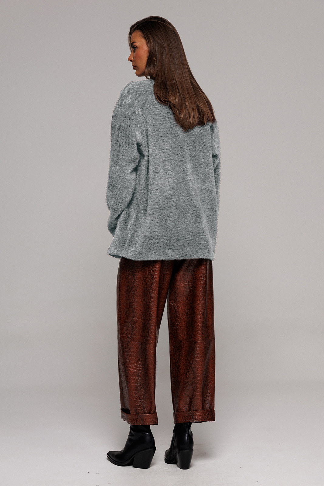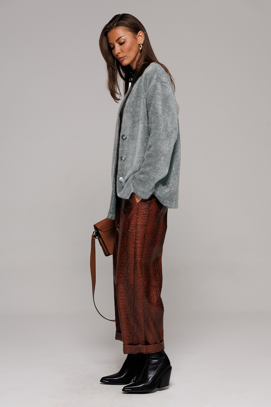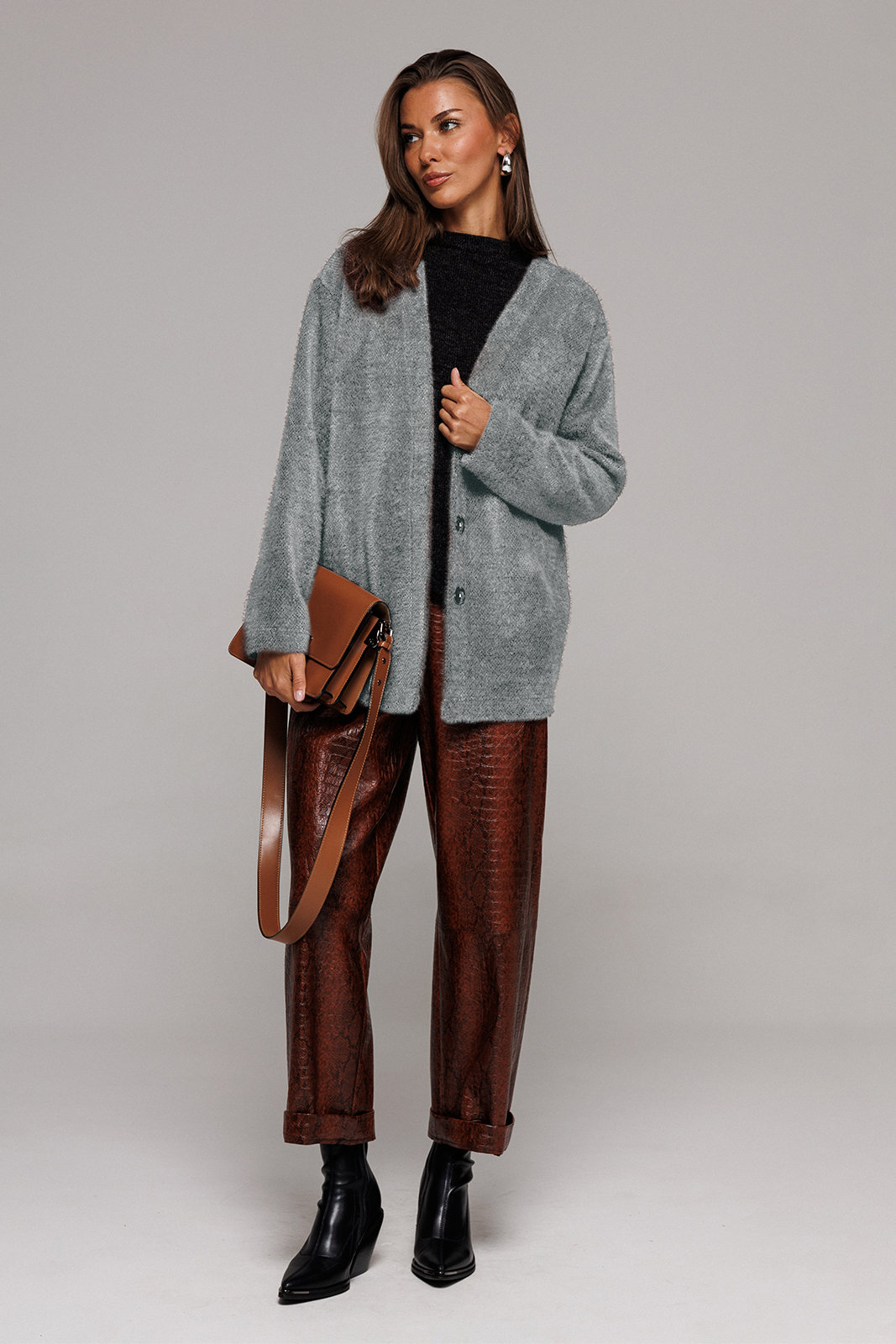 Описание: Кардиган из трикотажного полотна, свободного силуэта, слегка заужен к низу, со спущенной линией плеча и втачным рукавом. Полочка с V-образным вырезом и центральной застежкой на пришивные кнопки. Без подкладки.