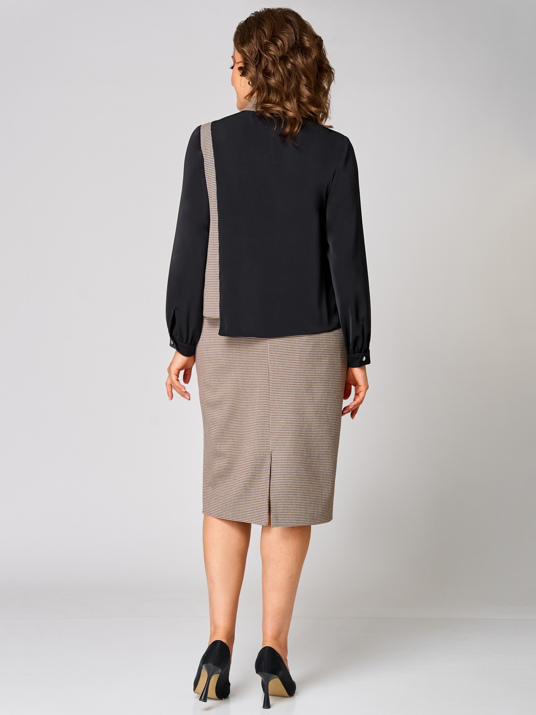 Описание: Комплект женский2-ух предметный, состоящий из блузки и юбки. Блузка прямого силуэта с фигурным низом из двух разных фактур тканей. Воротник отложной на стойке. По переду нагрудные вытачки и потайная застёжка на петли пуговицы перходящаа в складку. По правой верхнй части переда пришивное украшение . Рукав втачной длинный со сборкой по низу, на манжете. Манжет с застёжкой на петлю и одну пуговицу. Юбка прямого силуэта, на подкладке с притачным поясом, по бокам резинка. Застёжка по спинке на молнию, в среднем шве юбки разрез. Длина блузки 61см, длина рукава 59см, длина юбки 71см.