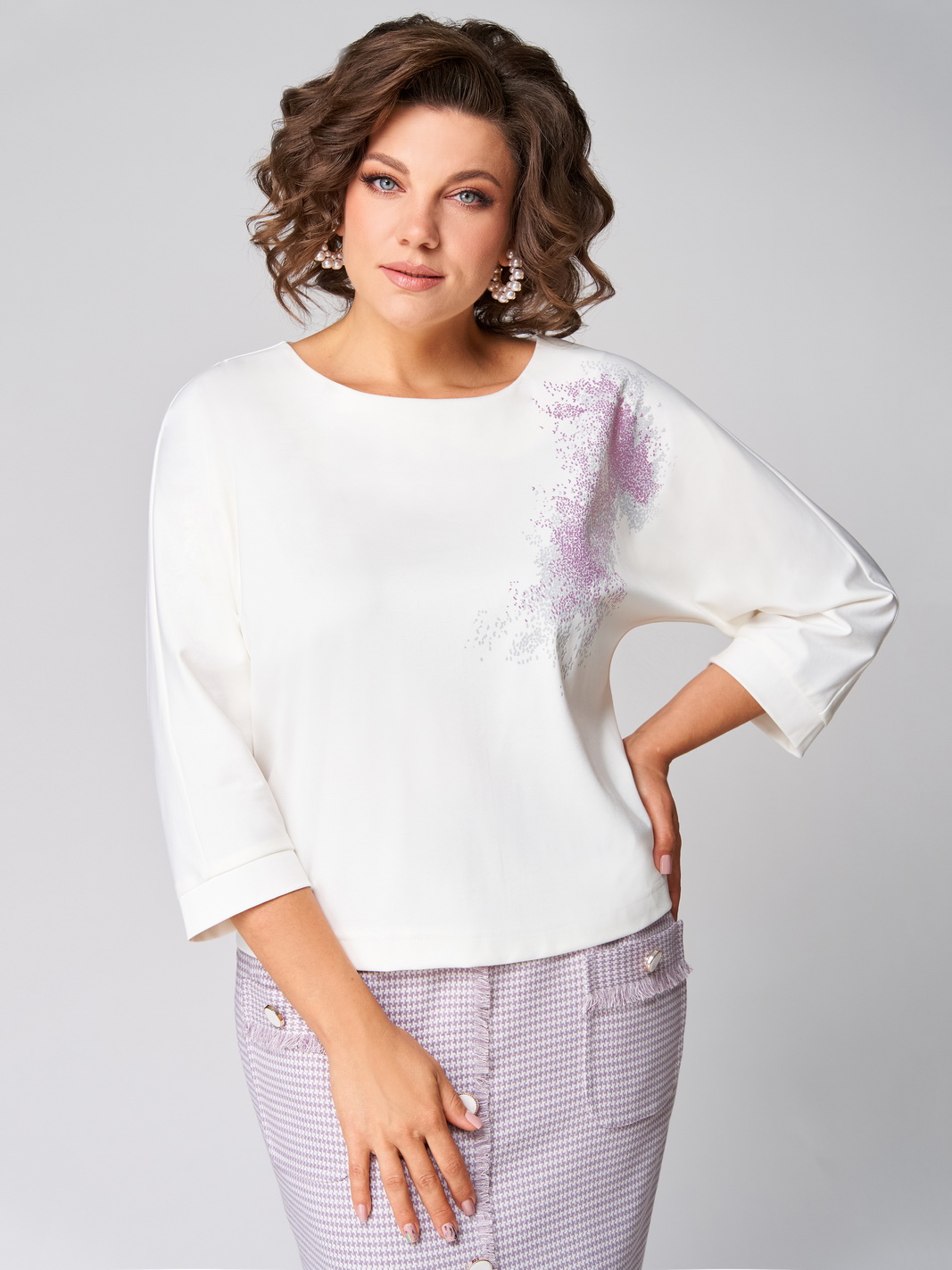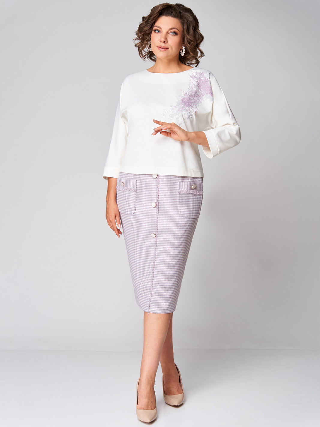 Описание: Комплект состоит из туники и юбки. Туника трикотажная прямого силуэта со спущенной линией плеча. По левой части переда декоративная печать. Рукав одношовный укороченный с манжетой по низу. Длина туники см, длина рукава см.Юбка, слегка зауженная к низу, по переду накладные карманы и декоративная отделка с пуговицами. Юбка на подкладке, по верху притачной пояс с резинками по бокам. Застежка в среднем шве заднего полотнища на потайную -молнию с петлей и пуговицей.