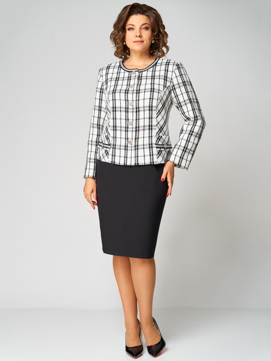 Описание: Красивый и стильный комплект в элегантном сочетании однотонной юбки и жакета. Жакет слегка приталенного силуэта на подкладке без воротника с застежкой на 5 петель и пуговиц. По переду жакета клапаны с декоративной тесьмой и пуговицей. Так же декоративная тесьма по горловине переда. Рукав втачной двухшовный. Спинка со средним швом и талиевыми вытачками. Юбка прямая, слегка зауженная к низу, на подкладке с притачным поясом, для максимального комфорта в поясе по бокам предусмотрена резинка. По спинке в среднем шве разрез и застёжка на молнию.