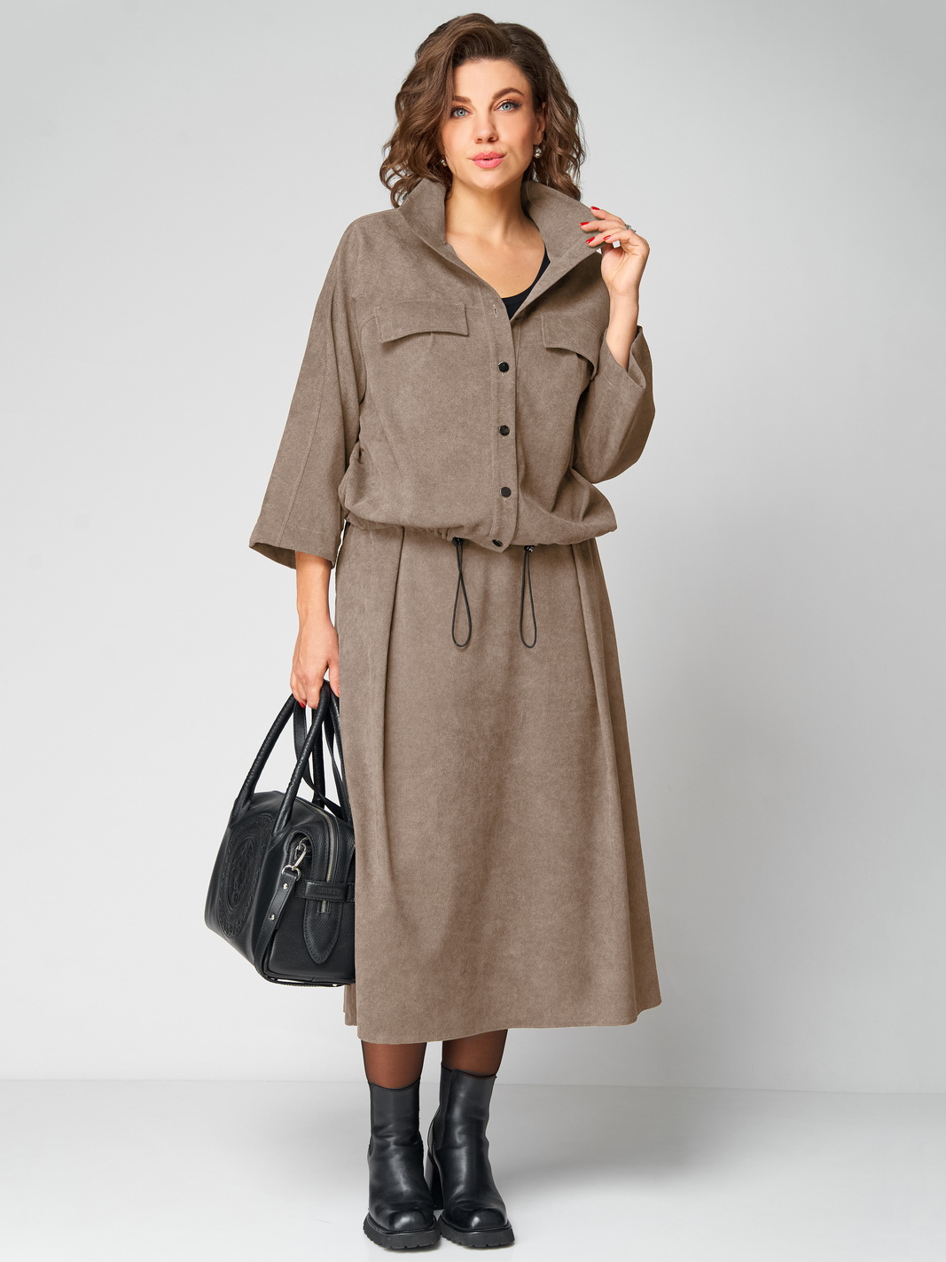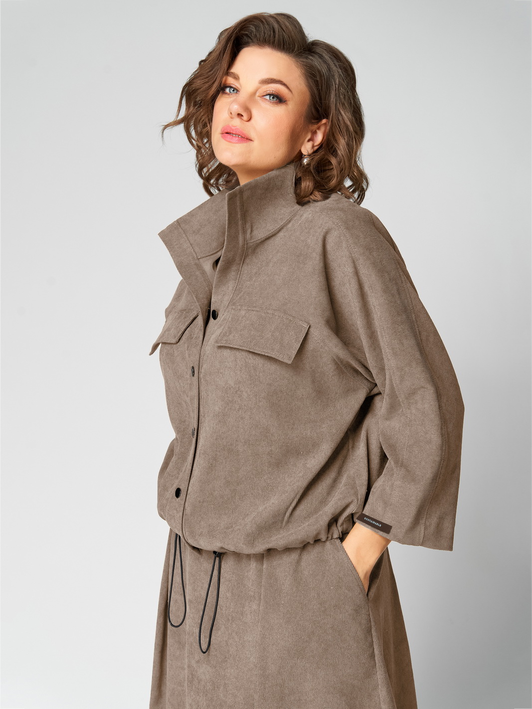 Описание: Комплект женский 2-ух предметный, состоящий из жакета и юбки. Жакет со спущенной линией плеча и цельнокроеным рукавом. По переду отрезная кокетка, воротник- стойка, рукава и планки. По переду настрочены нагрудные клапаны. Синка со средним швом. На левом рукаве о низу настрочена нашивка. Центральная застежка по планкам на 5 пуговиц и петель. Низ жакета можно регулировать с помощью эластичного шнура и фиксатора. Жакет без подкалки. Юбка на широкой обтачке А- силуэта, на подкладке. По переднему и заднему полотнищу заложены складки. По бокам расположены наклонные карманы. Застежка сзади на потайную тесьму-молнию.