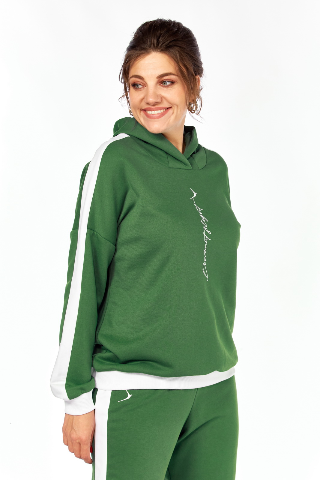 Кофта прямого силуэта со спущенным плечом , рукав втачной одношовный с притачным манжетом, по низу изделия притачной пояс. Горловина обработана бейкой. По плечевому шву и рукаву лампас из отделочной ткани. Брюки прямые,верхний срез обработан поясом с резинкой и шнуром. По боковым швам лампас из отделочной ткани.