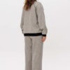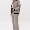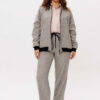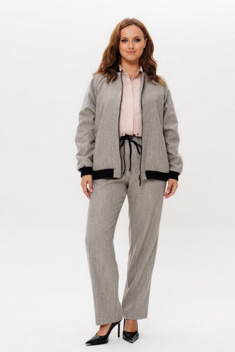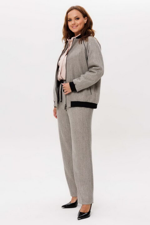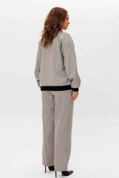 Описание: Костюм женский, состоящий из бомбера и брюк. Бомбер свободного силуэта, застежка на центральную тесьму-молнию, по переду обработаны прорезные карманы с кантом. Рукава-реглан. Горловина, рукава и низ изделия обработаны отделочной тканью. Бомбер на подкладке. Брюки слегка заужены к низу, пояс на резинке. Боковые карманы с отделочным кантом.
