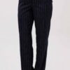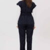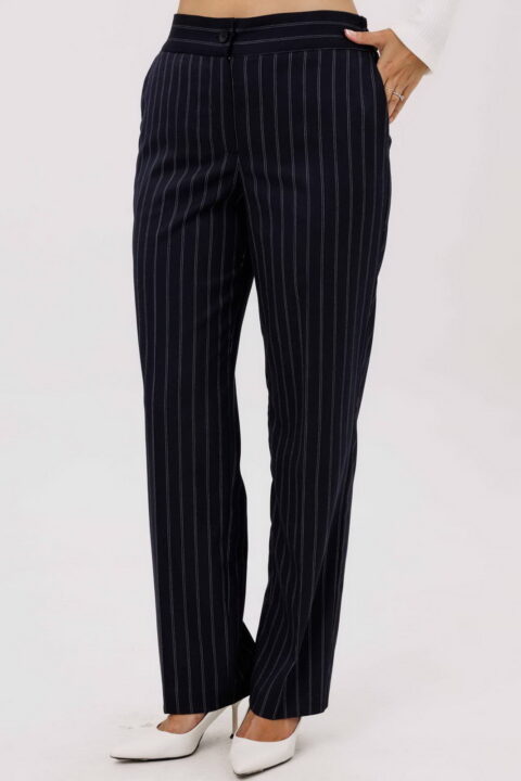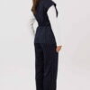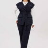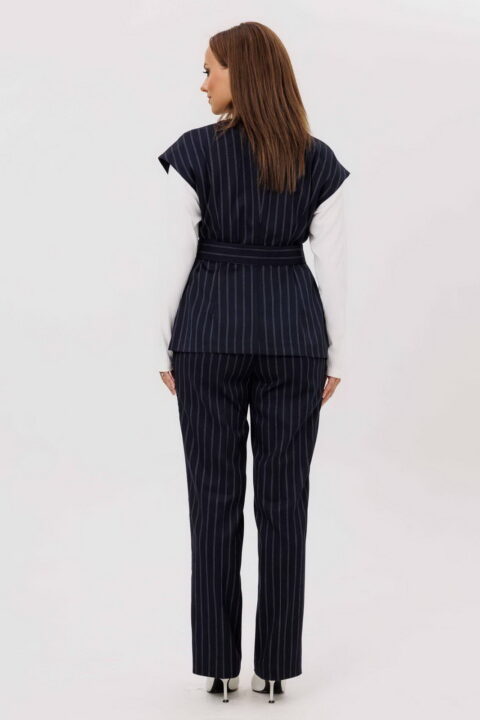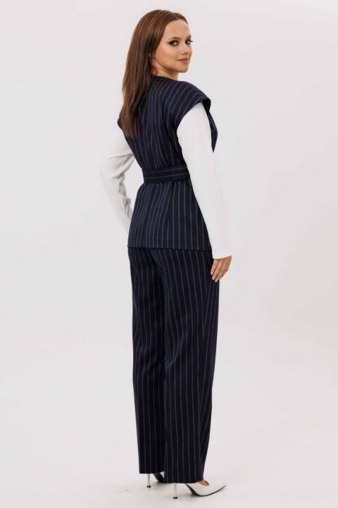 Описание: Костюм женский, состоящий из жилета и брюк. Жилет полуприлегающего силуэта, без подкладки. Плечо спущенное.Вырез V – образный, с воротником стойкой. По переду иммитация карманов с клапаном. Центральная застежка на пришивные кнопки. Спинка со средним швом и вытачками. Брюки прямого силуэта, слегка зауженные к низу. Пояс частично на резинке (по бокам), с шлевками для ремня. Застежка на гульфик с молнией и пуговицей. По бокам карманы с косым входом. Материал костюма костюмный, средней плотности, с гладкой фактурой. Без подкладки. Дополняет модель широкий пояс.