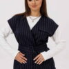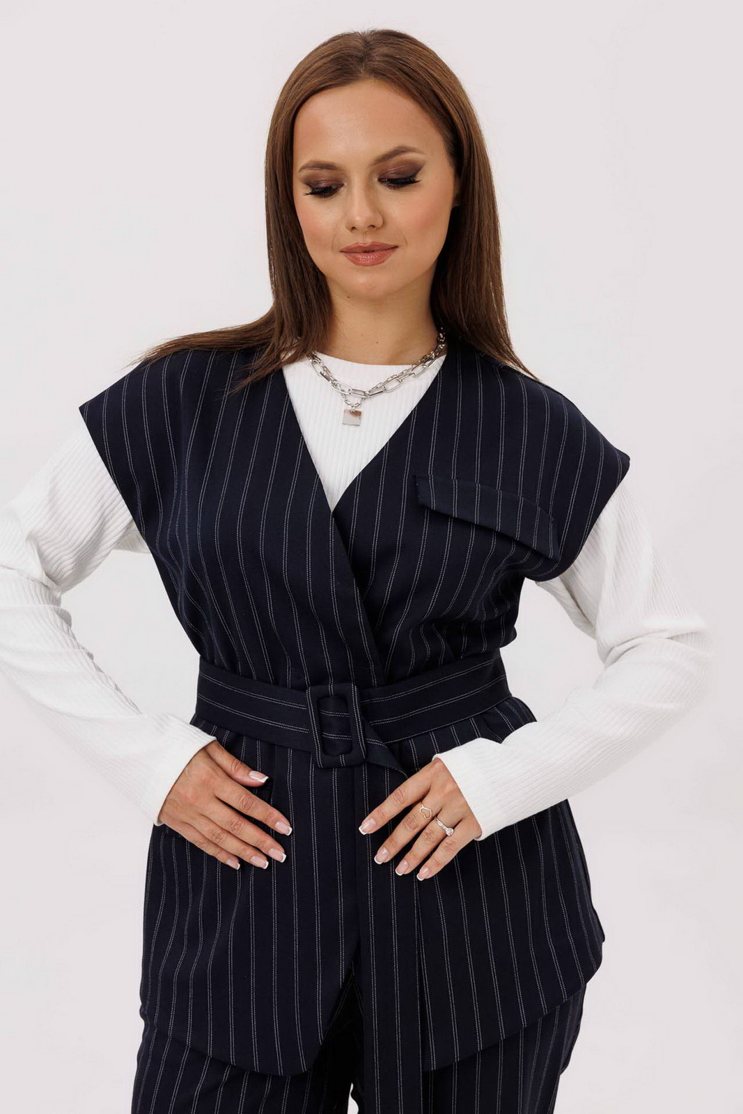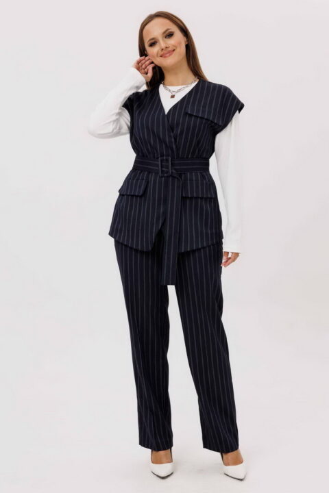 Описание: Комплект женский, состоящий из жилета и брюк. Жилет полуприлегающего силуэта, без подкладки. Плечо спущенное.Вырез V – образный, с воротником стойкой. По переду иммитация карманов с клапаном. Центральная застежка на пришивные кнопки. Спинка со средним швом и вытачками. Джемпер без вытачек. Рукава втачные, одношовные, длинные. Ткань в рубчик. Прямой крой. Брюки прямого силуэта, слегка зауженные к низу. Пояс частично на резинке (по бокам), с шлевками для ремня. Застежка на гульфик с молнией и пуговицей. По бокам карманы с косым входом. Материал костюма костюмный, средней плотности, с гладкой фактурой. Без подкладки. Дополняет модель широкий пояс.