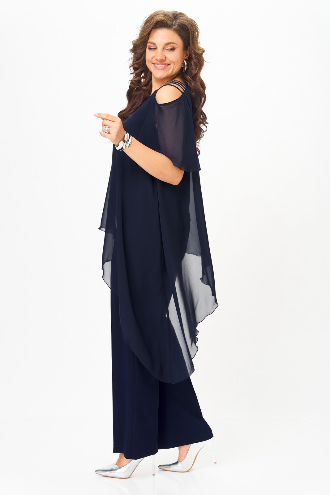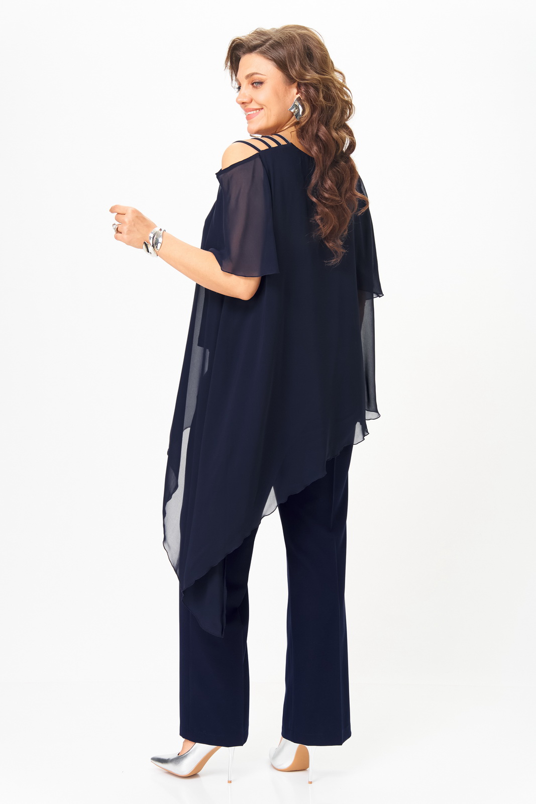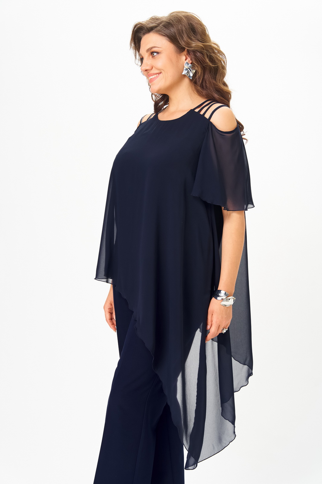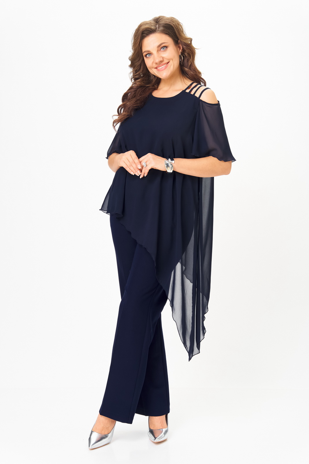 Описание: Комплект состоит из туники и брюк. Туника двухслойная, выполнена из однотонного полупрозрачного струящегося шифона (верхняя часть) и трикотажного однотонного полотна (нижняя часть). Брюки выполнены из костюмной однотонной ткани. Ткань брюк имеет механическое растяжение благодаря содержанию в ней эластана. Брючный костюм идеальный вариант на торжественные мероприятия.
