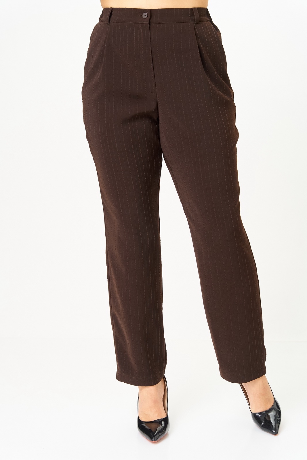 Брюки классические, полной длины. В области бедер полуприлегающие, в колене и по низу прямые. По передним половинкам обработаны складки по линии талии и наклонные карманы. По задним половинкам обработаны талиевые вытачки.