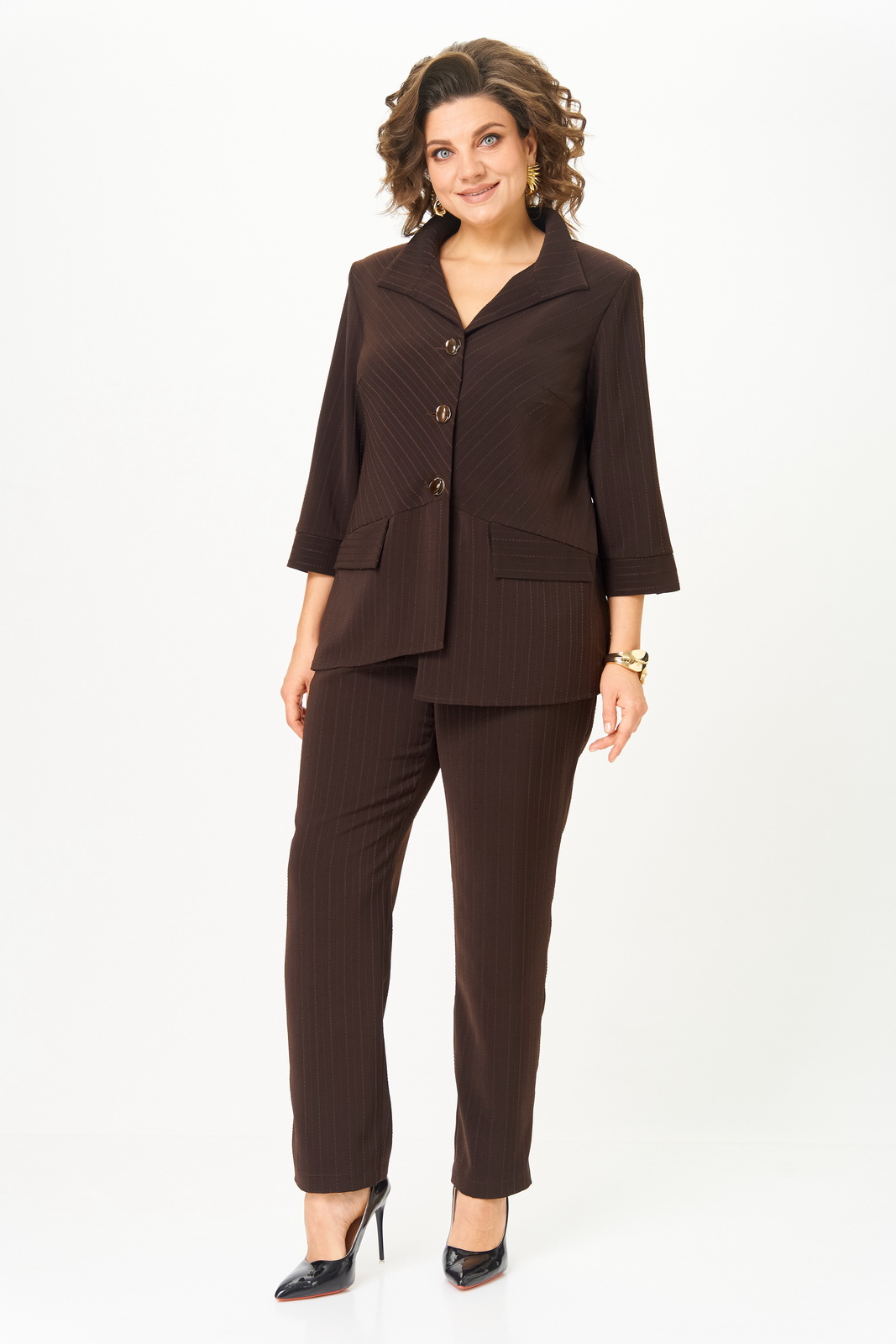 Описание: Костюм состоящий из жакета и брюк, выполнен из костюмной ткани в полоску.