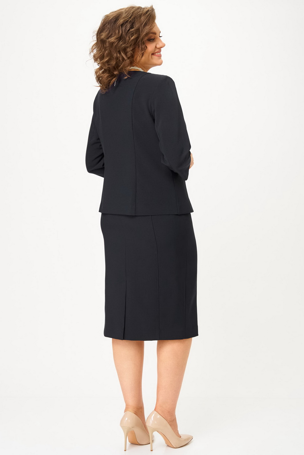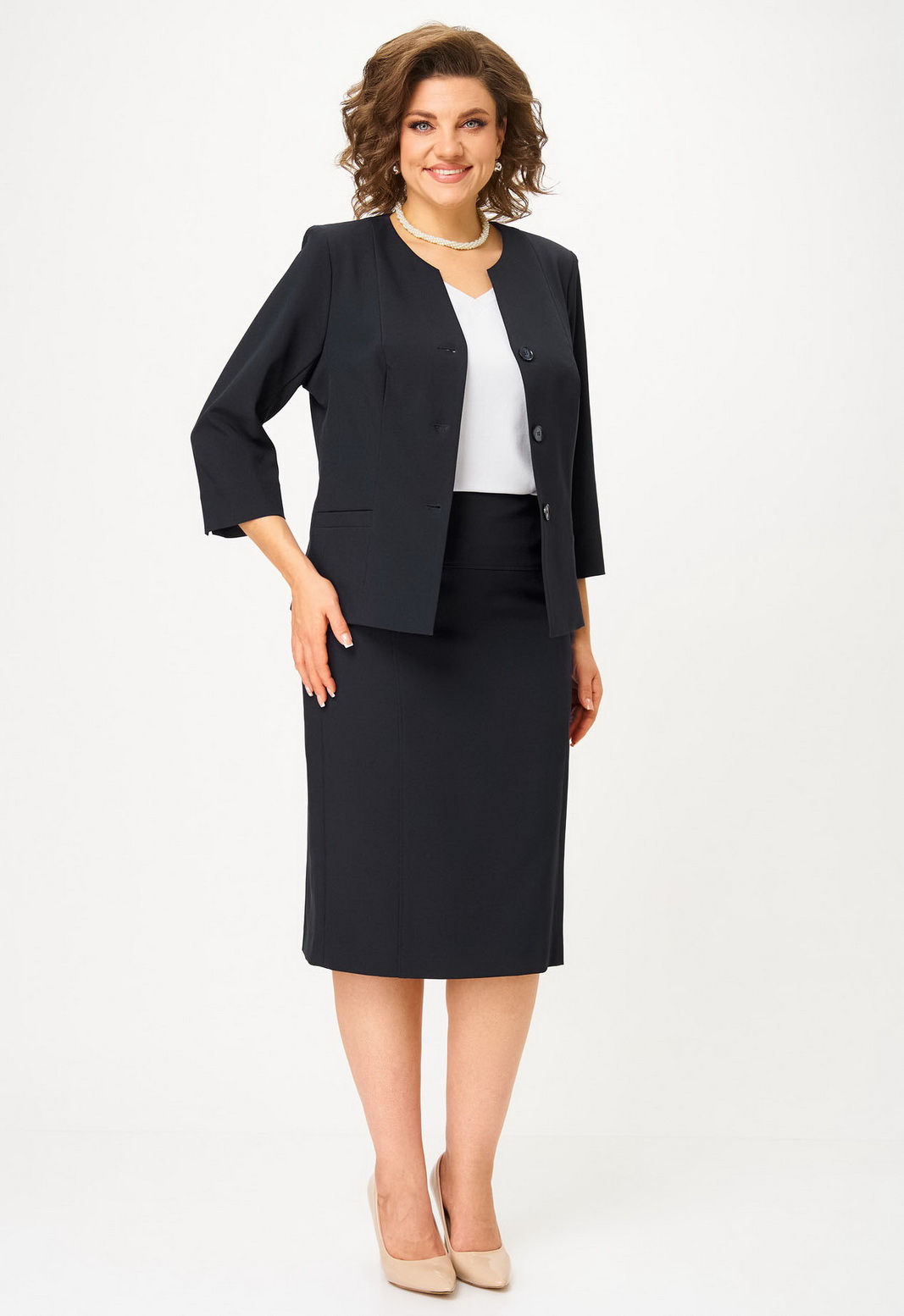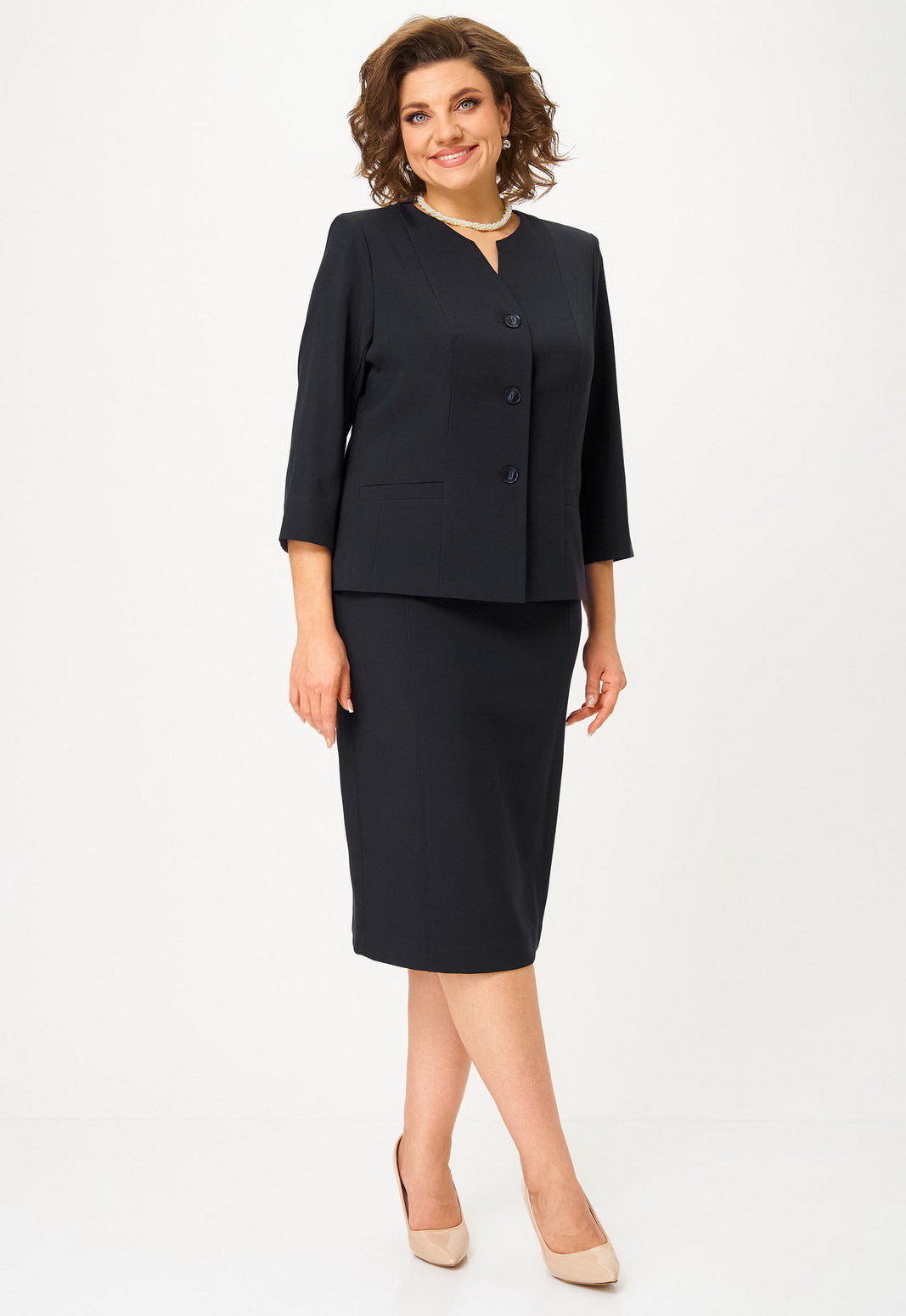 Описание: Женский комплект 2-х предметный состоит из жакета и юбки. Жакет классический,с V-образным вырезом, полуприлегающего силуэта с центральной бортовой застежкой на петли-пуговицы. Спереди рельефные швы от плечевого шва, отрезной бочок и карман с втачной листочкой. Спинка с рельефами от плечевого шва. Рукав втачной, двухшовный, укороченный. Перед жакета на подкладке. Длина рукава 48 см, длина жакета по спинке 59 см. Юбка прямого силуэта, верхний срез юбки обработан обтачкой, заднее полотнище со средним швом, застегивается на потайную молнию. Шов переходит к низу в шлицу. Юбка по переднему и заднему полотнищу с кокеткой и вертикальными рельефами, швы отстрочены в цвет юбки. Длина по боковому шву 70 см. Юбка на подкладке.