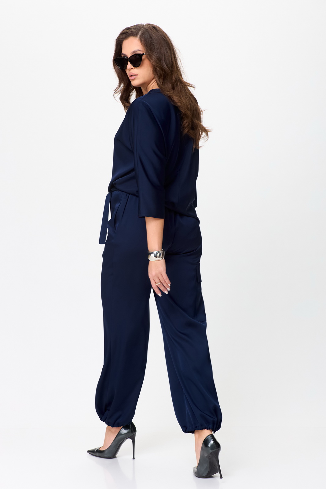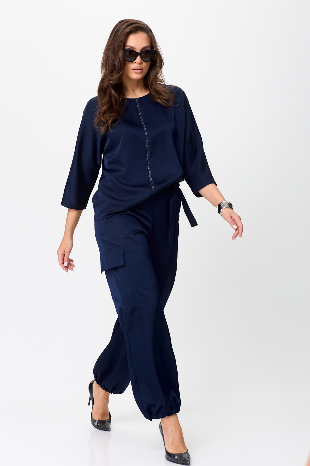 Описание: Комплект: блузон, брюки “карго”. Комплект выполнен из сатина с матовым блеском. Блузон прямого силуэта. Горловина овальная. По центру переда вставлена тонкой полоской отделка. Спинка со средним швом.