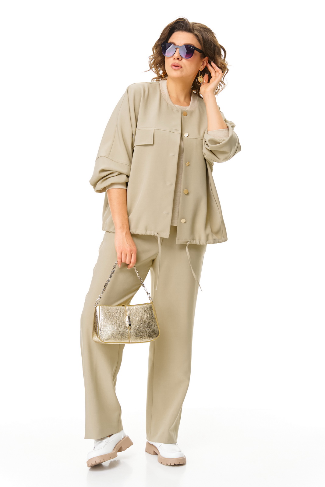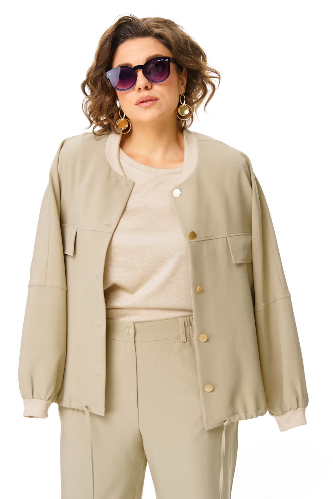 Бомбер свободного силуэта, линия плеча спущена. Застёжка центральная на петли и пуговицы. Горловина и низ рукава обработана трикотажной вставкой. По переду 2 кармана. По низу изделия кулиска. Спинка с горизонтальным подрезом в верхней части , отделка в виде металлической нашивки.