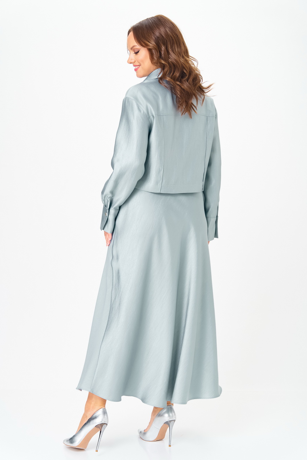 Описание: Костюм состоит из жакета и юбки. Выполнен из костюмной ткани с гладкой поверхностью с матовым блеском.