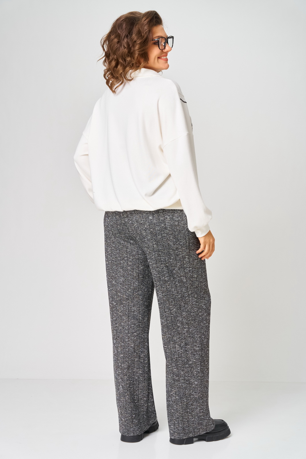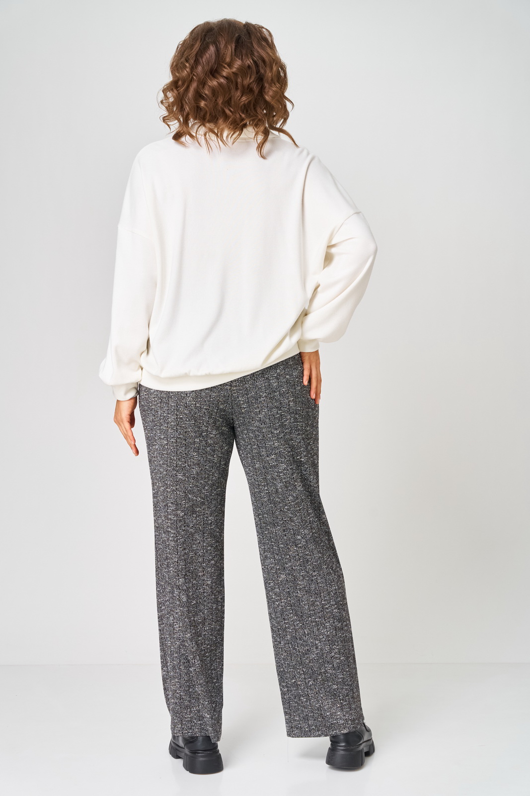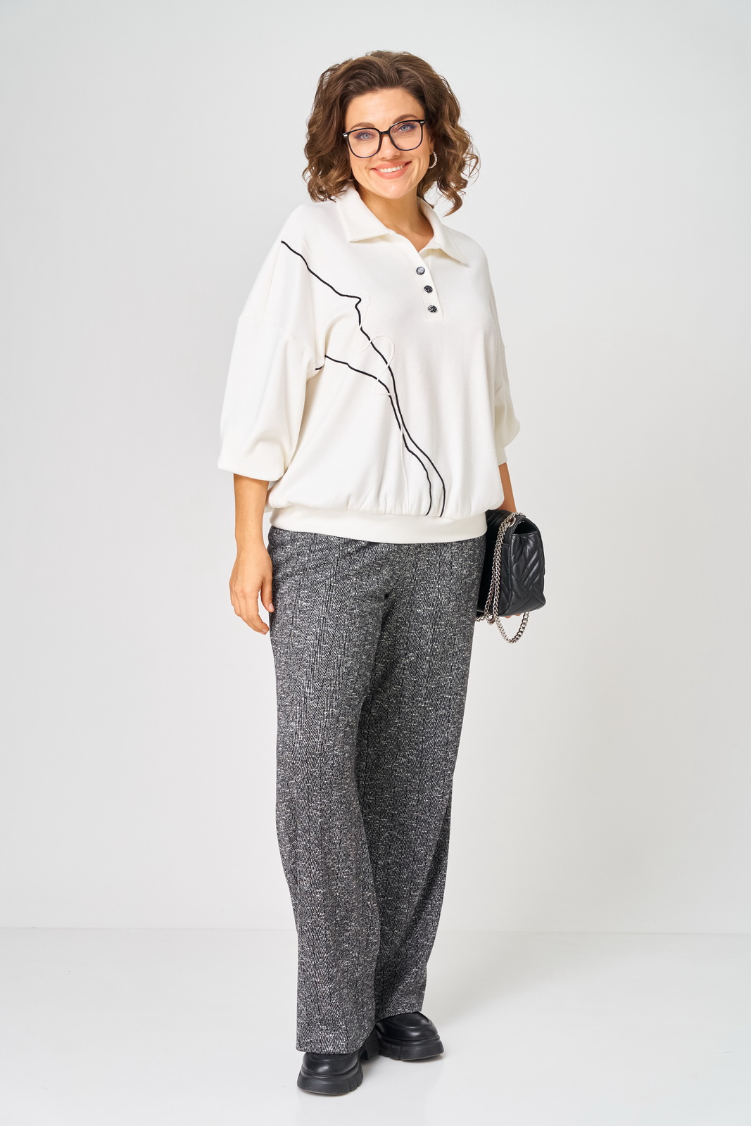 Описание: Комплект джемпер и брюки выполнени из трикотажа. Джемпер типа поло, с воротником рубашечного типа. По переду планка на пуговицах. Линия плеча спущена. По передней планке обработан декор из шнура. Брюки прямые на резинке.