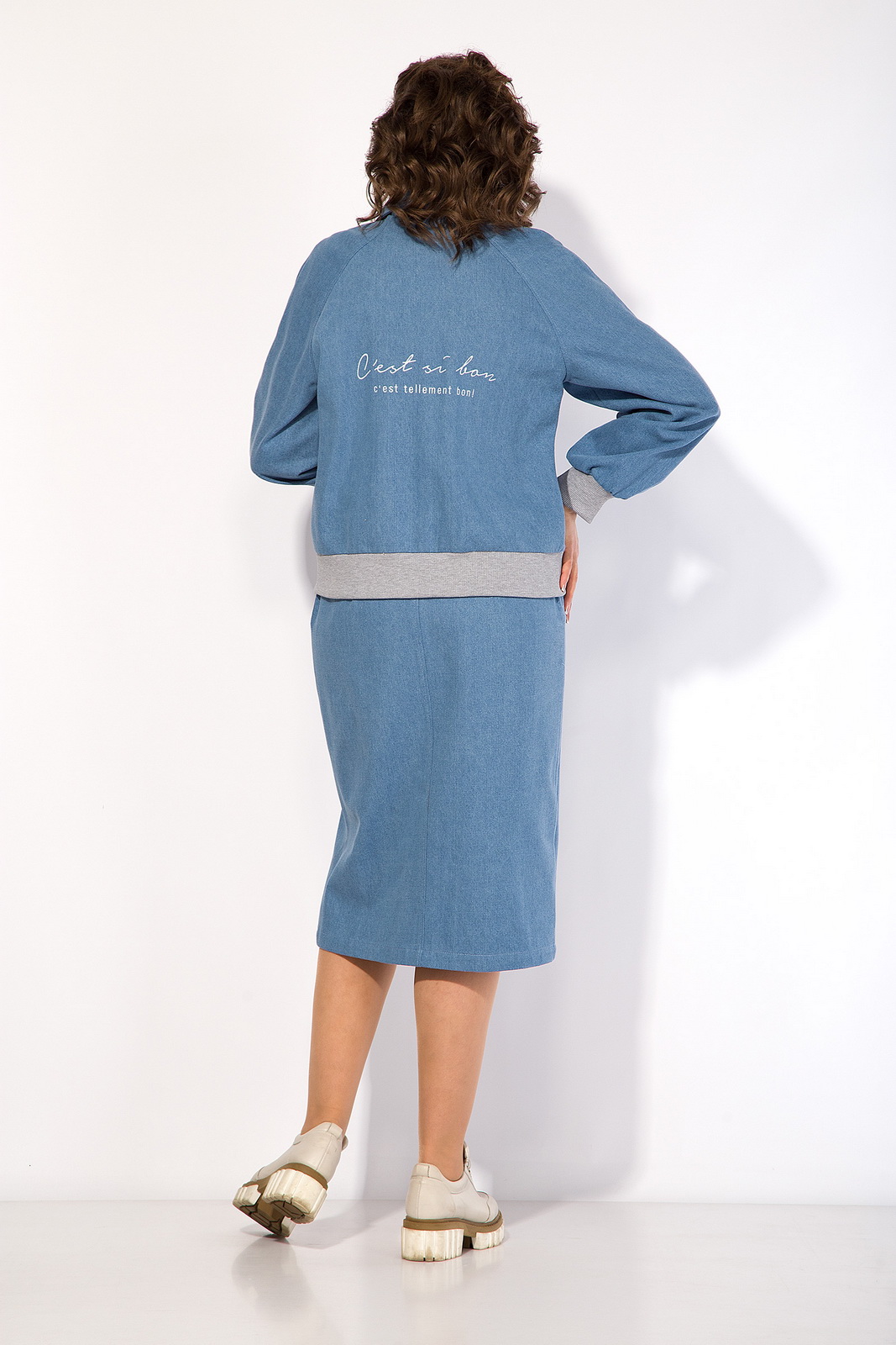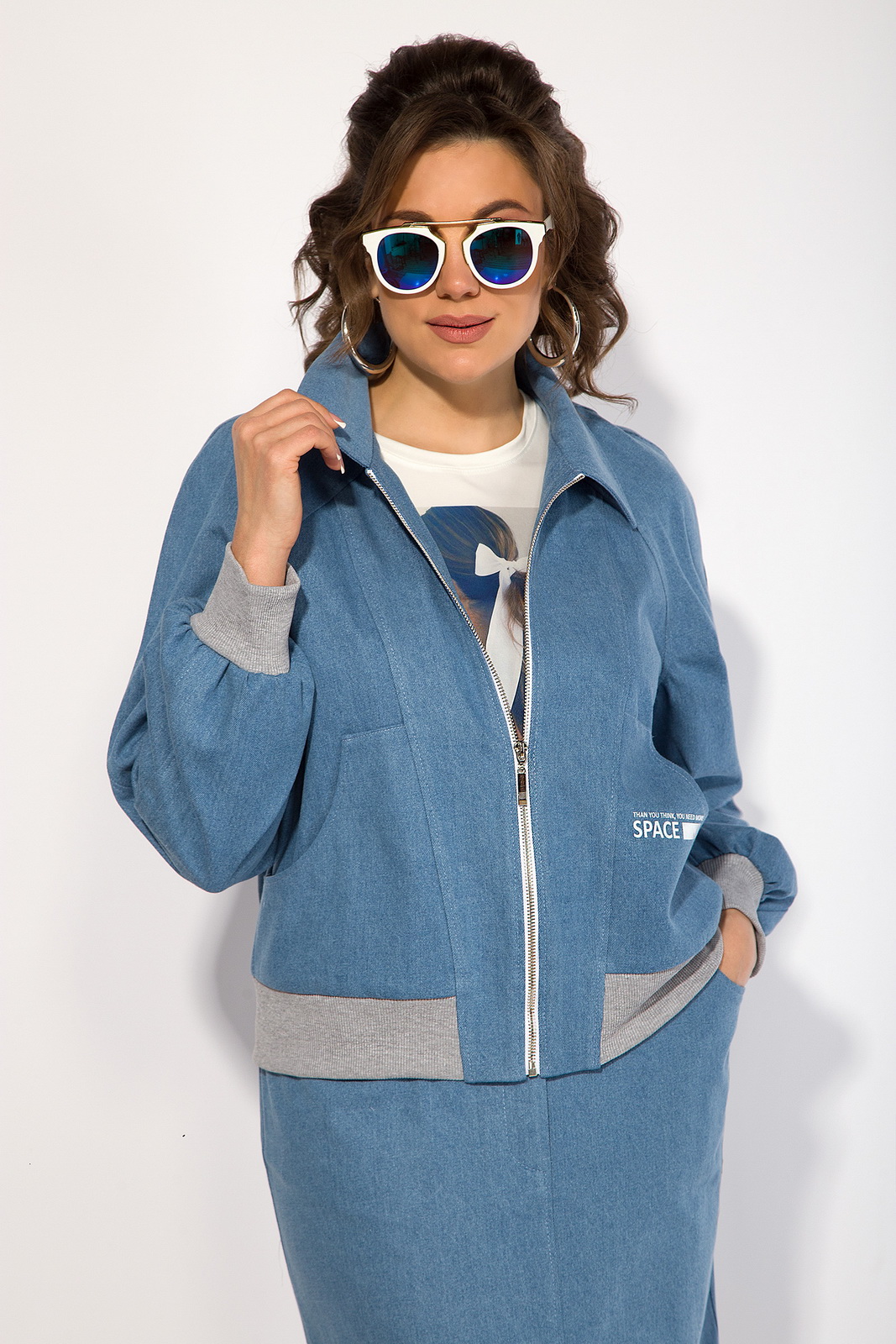 Описание: Эффектный джинсовый костюм, состоящий из жакета и юбки – представляет собой идеальное сочетание комфорта, стиля и универсальности. Жакет по типу бомбера, с рукавом покроя реглан. Воротник отложной, застежка центральная на металлическую молнию. Низ рукава и низ изделия обработаны притачными манжетами из кашкорсе. Спинка с декоративной печатью – накат.