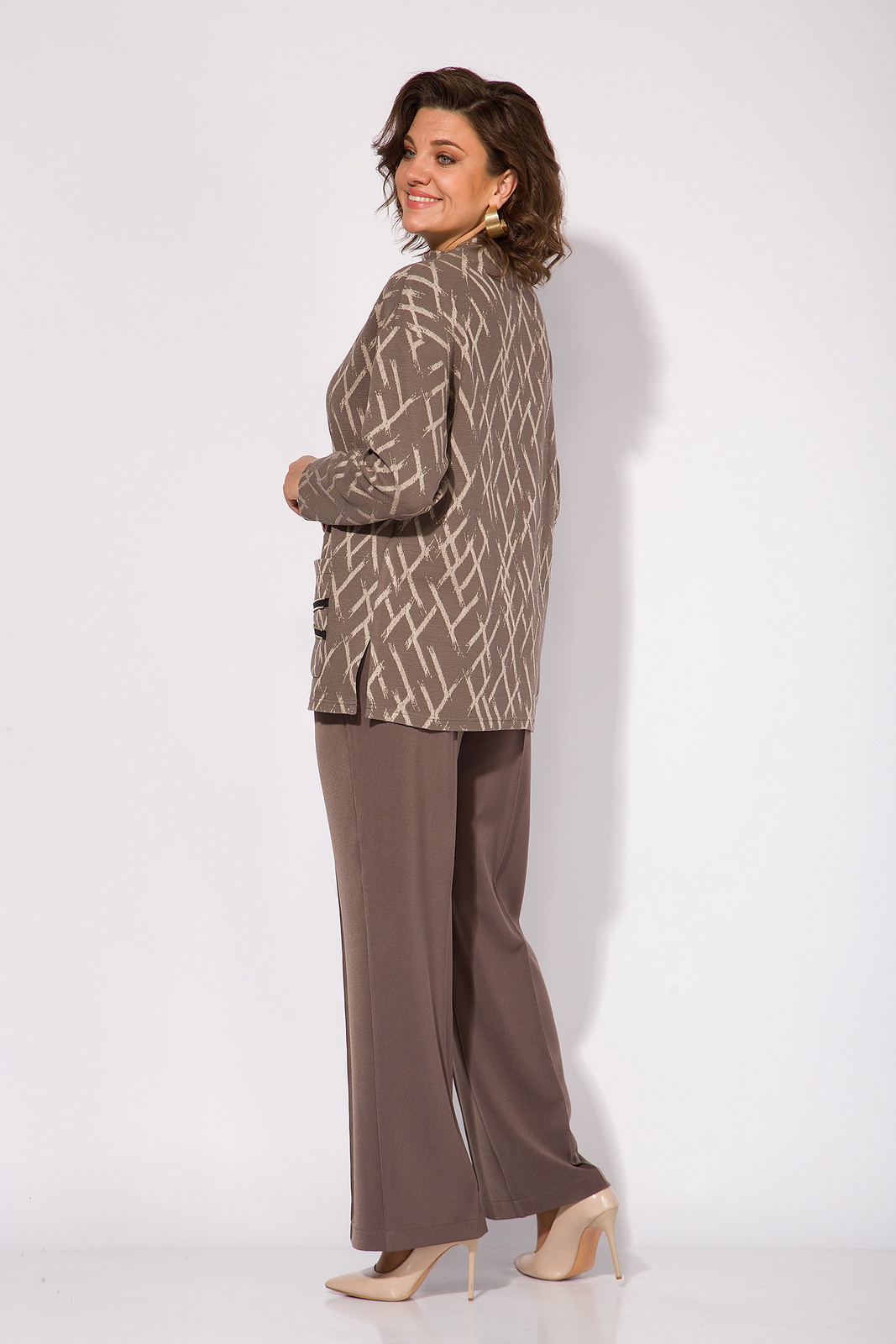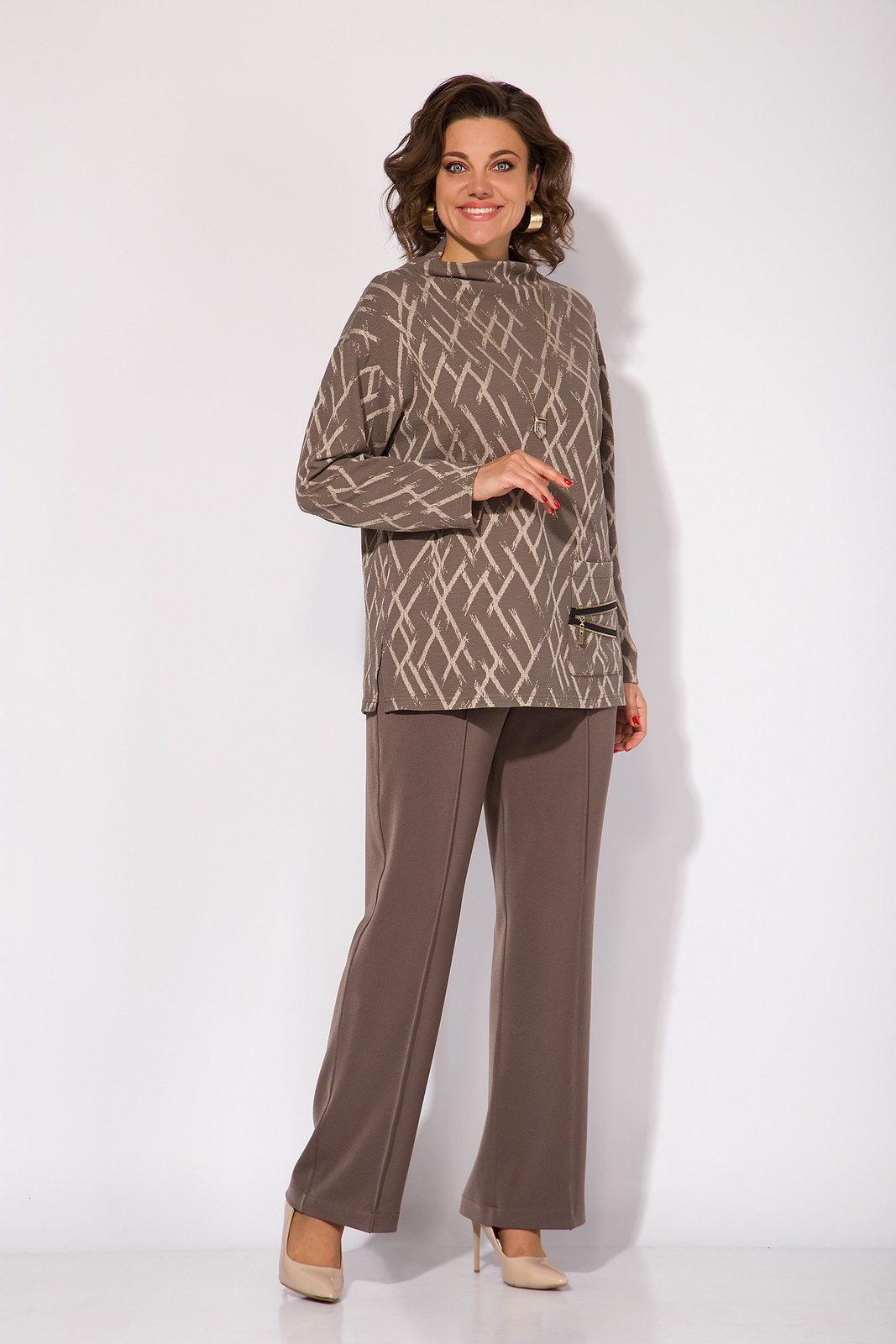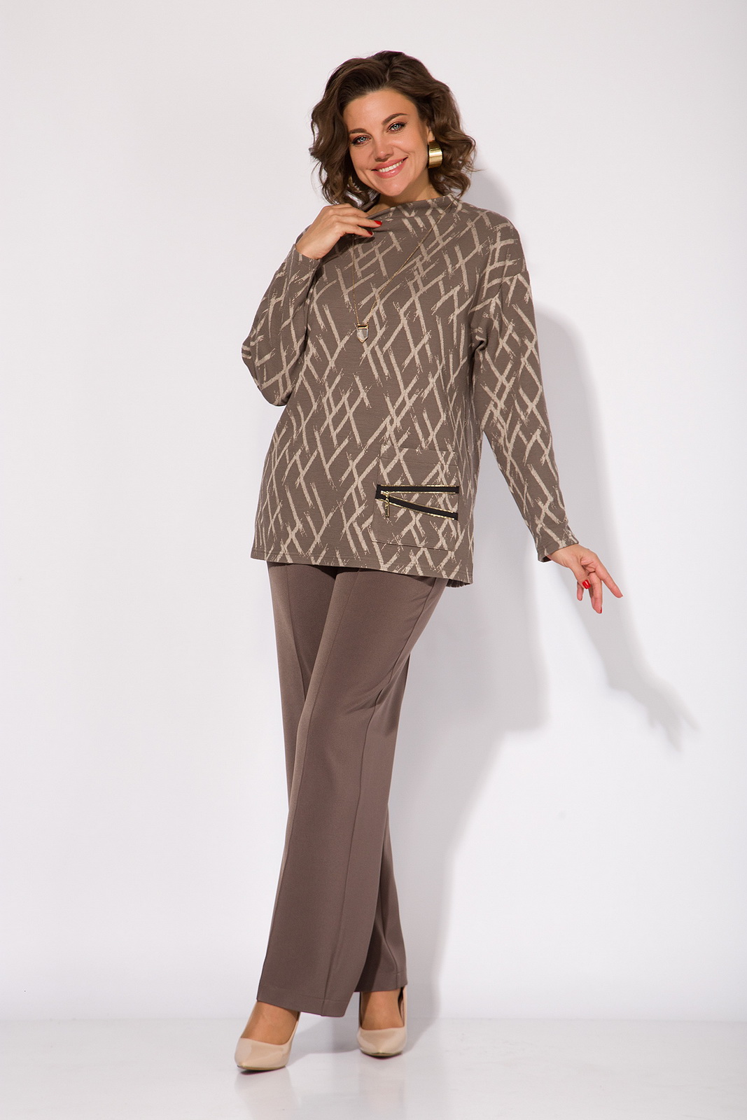 Описание: Эффектный комплект, джемпер и брюки в трендовой расцветке – трюфель. Модель джемпера полуприлегающего силуэта, выполнена из мягкого трикотажа с оригинальным дизайном. Горловина цельнокроеная мягкая стойка. Линия плеча спущена, рукав полной длины. По бокам изделия расположены разрезы. Полочку украшает ассиметричный карман с декором. Брюки в комплекте прямого покроя, средней посадки. Пояс притачной с круговой резинкой. По переду застрочены канты. В брюках имеются боковые карманы. Отличный повседневный комплект на осенне-зимний сезон.