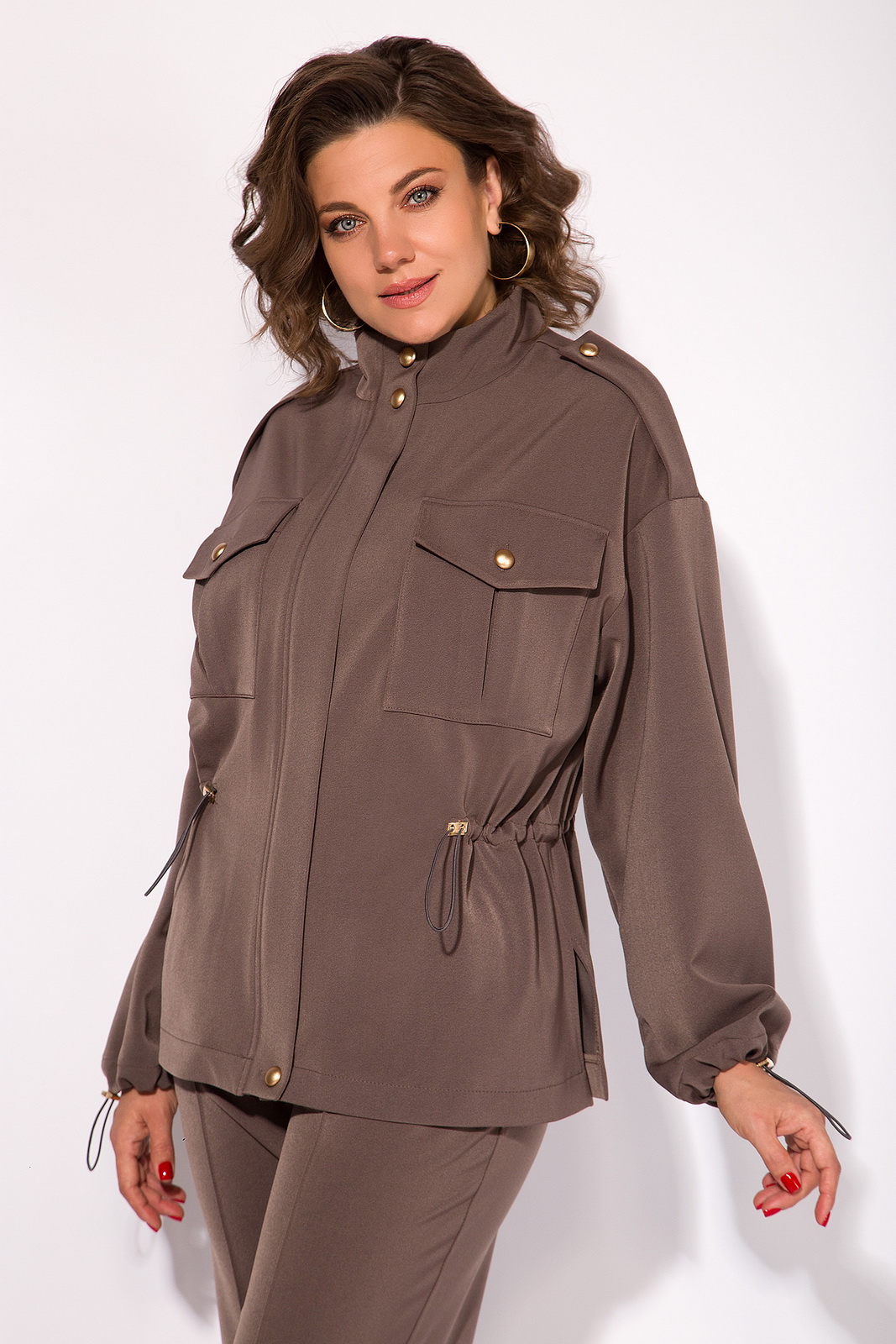 Костюм состоит из жакета и брюк. Жакет полуприталенного силуэта с застежкой на молнию. Воротник стойка. Рукав на спущенной линии плеча полной длины. По талии и низу рукава предусмотрена кулиску с утяжкой. По полочке расположены накладные карманы с клапаном. По бокам предусмотрены разрезы. В комплекте брюки прямого кроя с заутюженными кантами. Брюки на притачном поясе с круговой резинкой по талии. В брюках имеются боковые карманы.