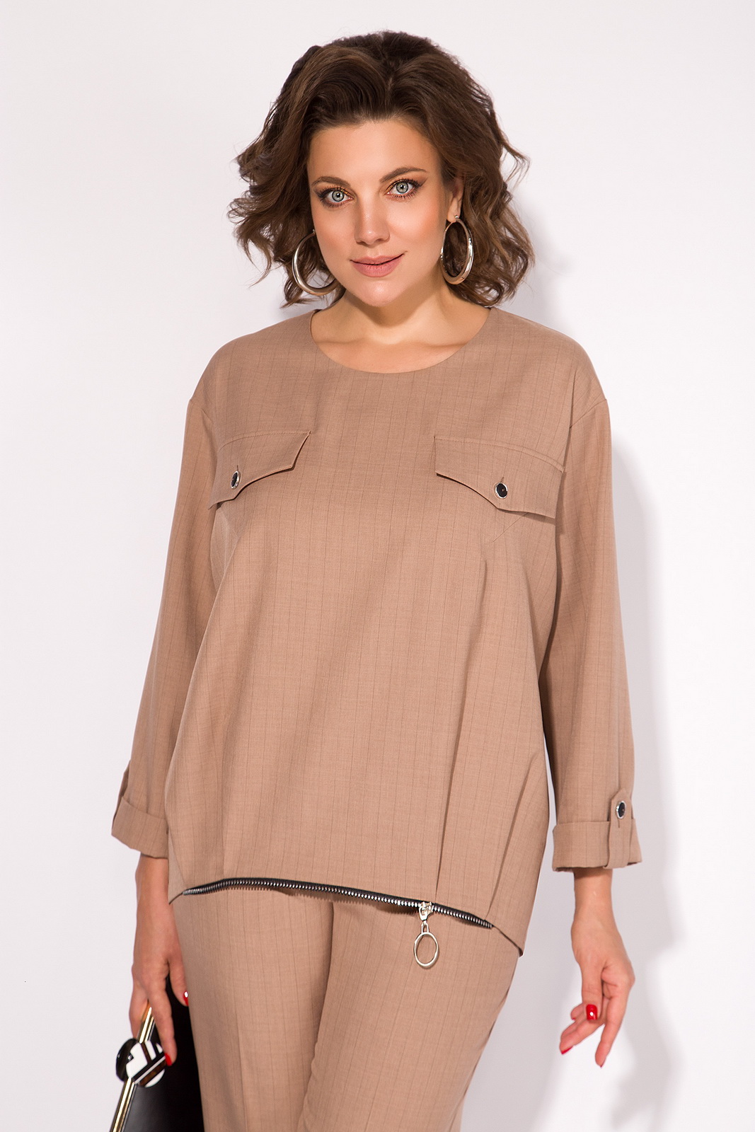 Описание: Изумительный костюм, состоящий из свободного блузона и брюк в продольную полоску, удивляет способностью украшать и эффектно преображать любой женский образ. Блузка прямого силуэта, в стиле оверсайз, со спущенной линией плеча. Вырез горловины округлый. Рукав длиной3/4-ти с цельнокроеной манжетой на пату на спущенном плече. По полочке расположены декоративные клапаны с пуговками. Низ овальной формы, с заложенными складками и декоративным элементом в виде молнии. Брюки прямые на притачном поясе с резинкой с боковыми карманами.