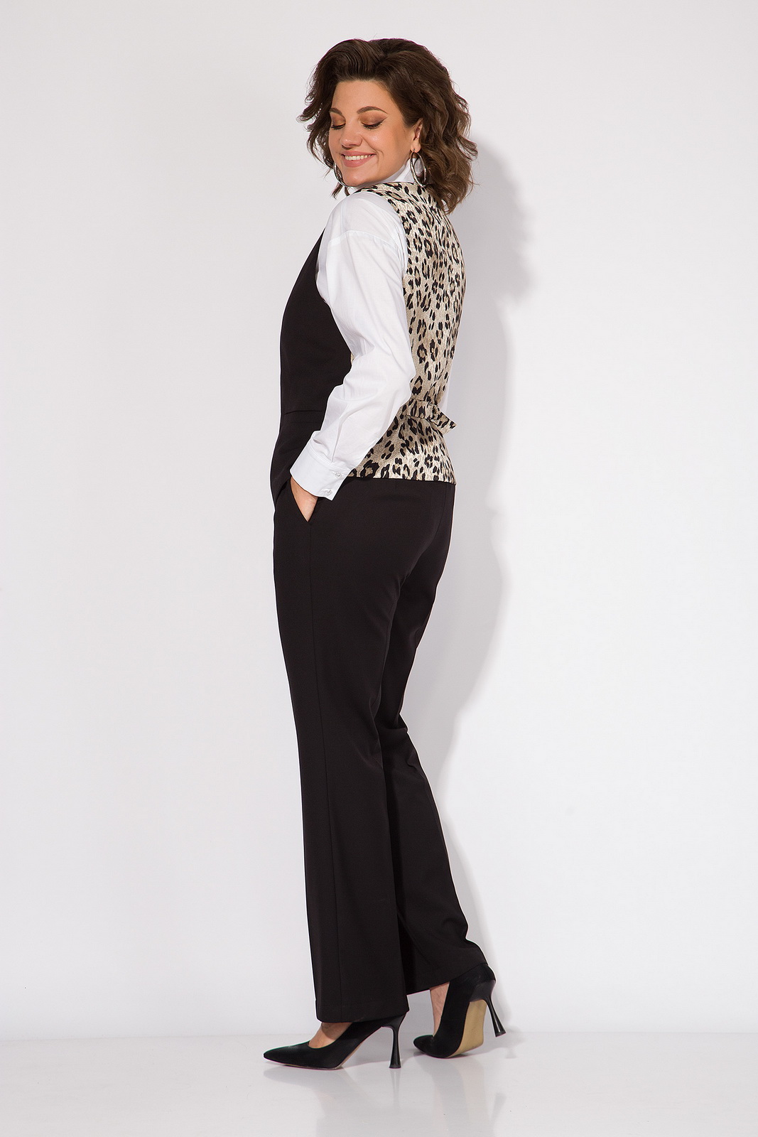 Жилетка полупрниталенного силуэта, с застежкой на пуговицы выполнена из костюмной ткани. По полочке расположены продольные рельефы с прорезными карманами. Спинка выполнена из шелкового сатина с эффектным принтом. Есть хлястик для приталивания. Жилетка на шелковой подкладке. Брюки в костюме со средней посадкой на притачном поясе-кокетке со вставками из отделочной ткани.