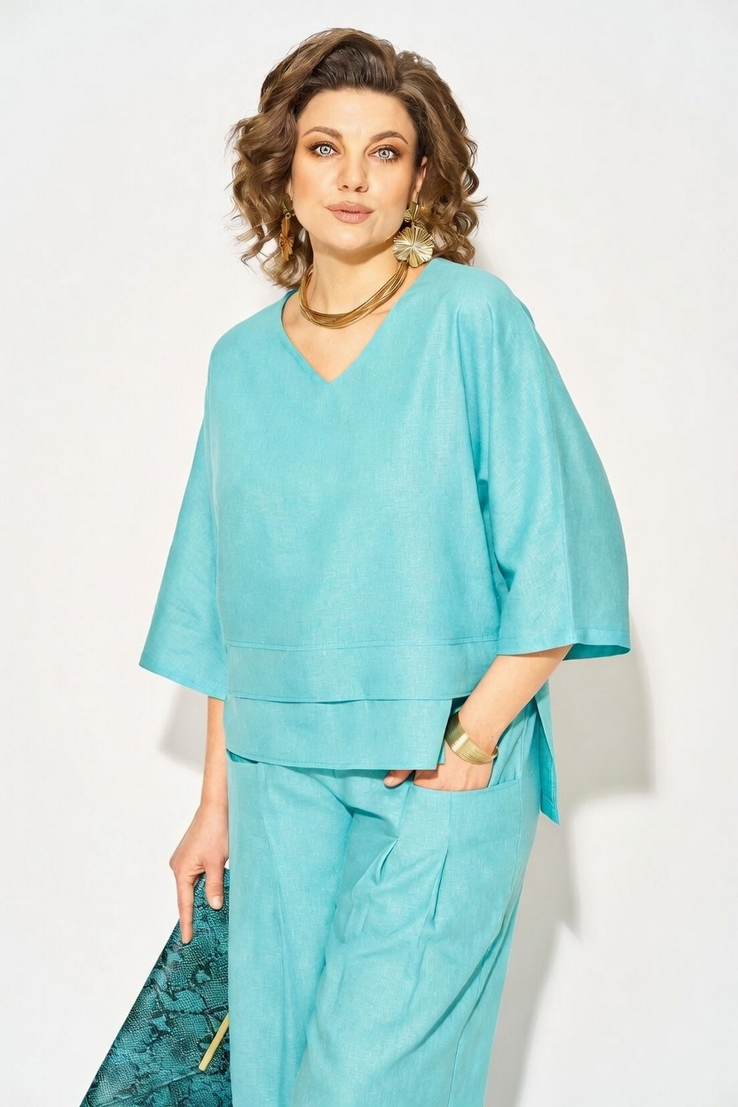 Описание: Оригинальный летний костюм, состоящий из туники и брюк. Модель выполнена из легендарного материала – лен с добавлением хлопка. Модель туники свободного силуэта с цельнокроеным рукавом длиной ¾-ти. Лиф V-образным мысом, что зрительно удлиняет силуэт и притягивает взгляды окружающих. Линия низа ассиметричной формы с декоративными планками. Особое внимание уделено свободным брюкам прямого силуэта, на притачном поясе с резинкой по кругу. Оригинальные карманы с заложенными складками создают комфорт и изящество образу.