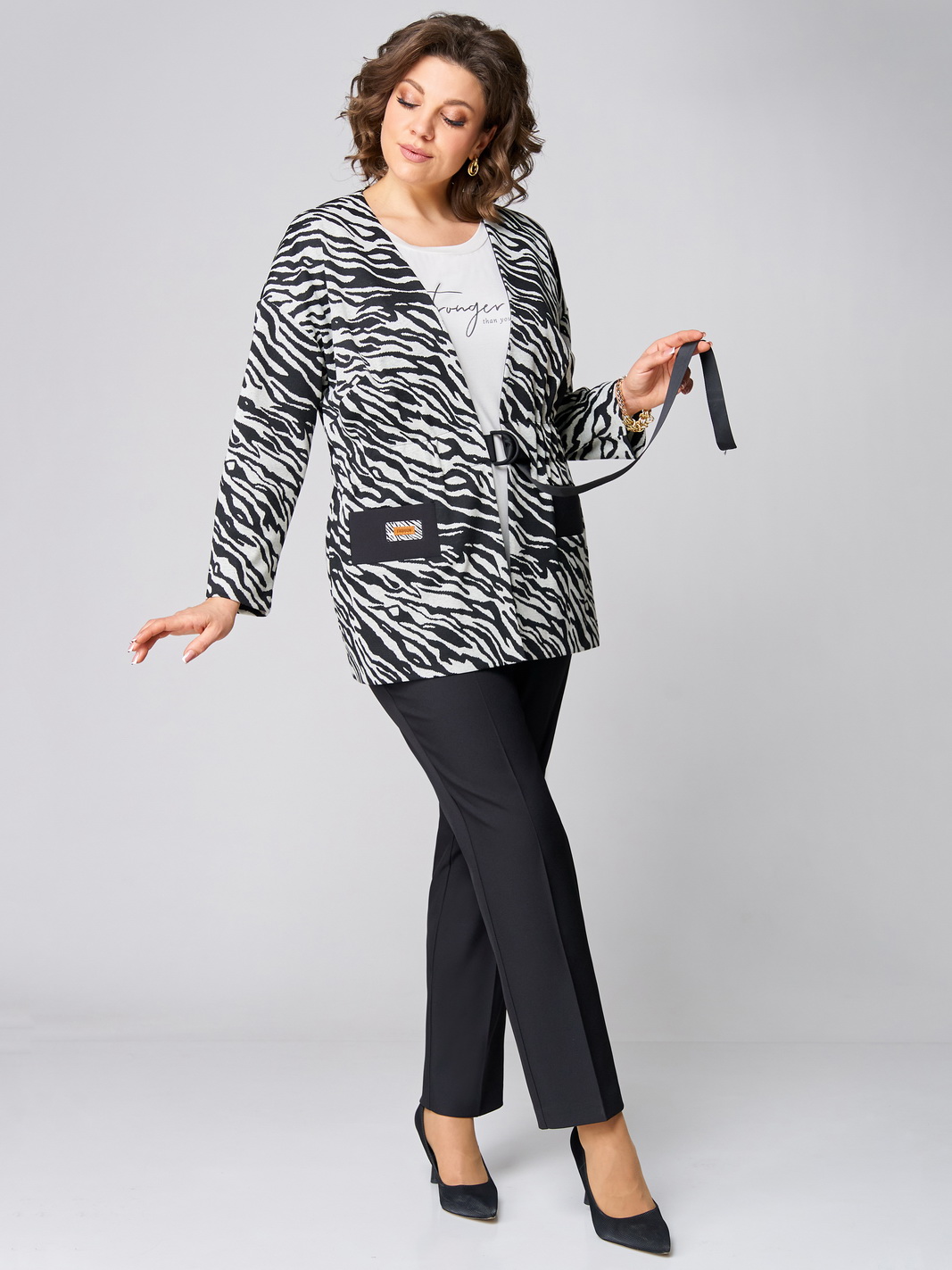 Описание: Комплект женский трехпредметный. Жакет трикотажный без подкладки со спущенной линией плеча, по переду прорезные карманы с широкой листочкой из отделочной ткани. Жакет с поясом по линии талии. Длина жакета 76 см, Длина рукава от горловины 74 см. Блузка трикотажная со спущенной линией плеча, по горловине и рукаву планки. Блузка декорирована печатью выполненной методом шелкографии. Длина блузки 62 см, длина рукава от горловины 26 см. Брюки классические на поясе с резинкой по бокам и карманами по переду. Посадка брюк средняя. Длина брюк 101 см