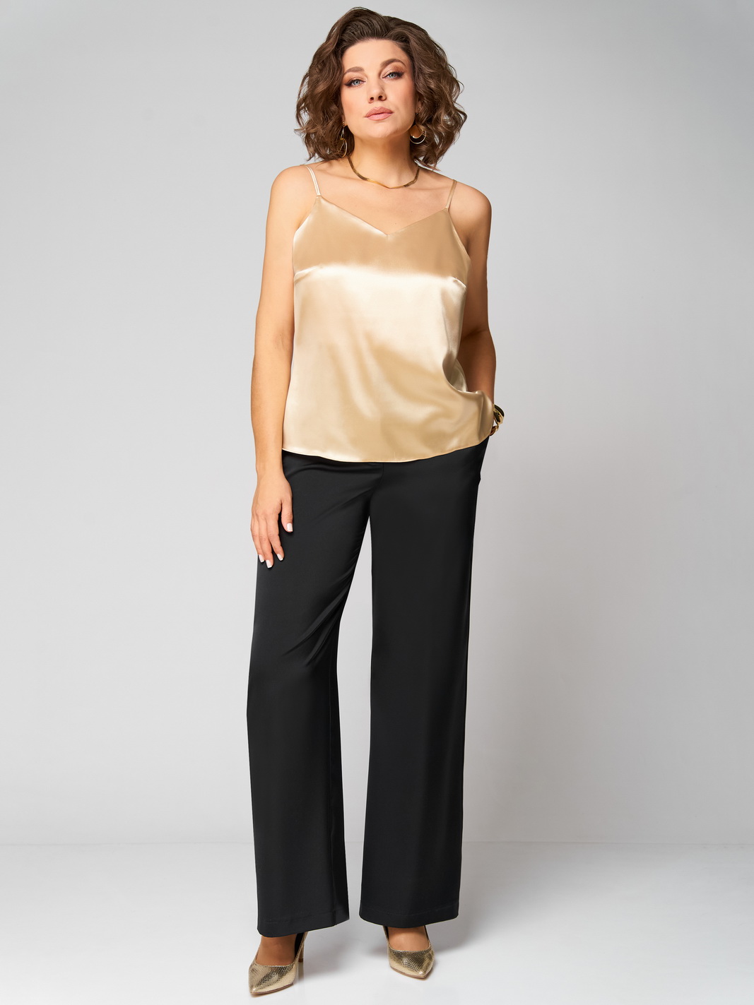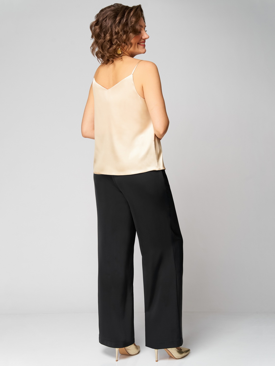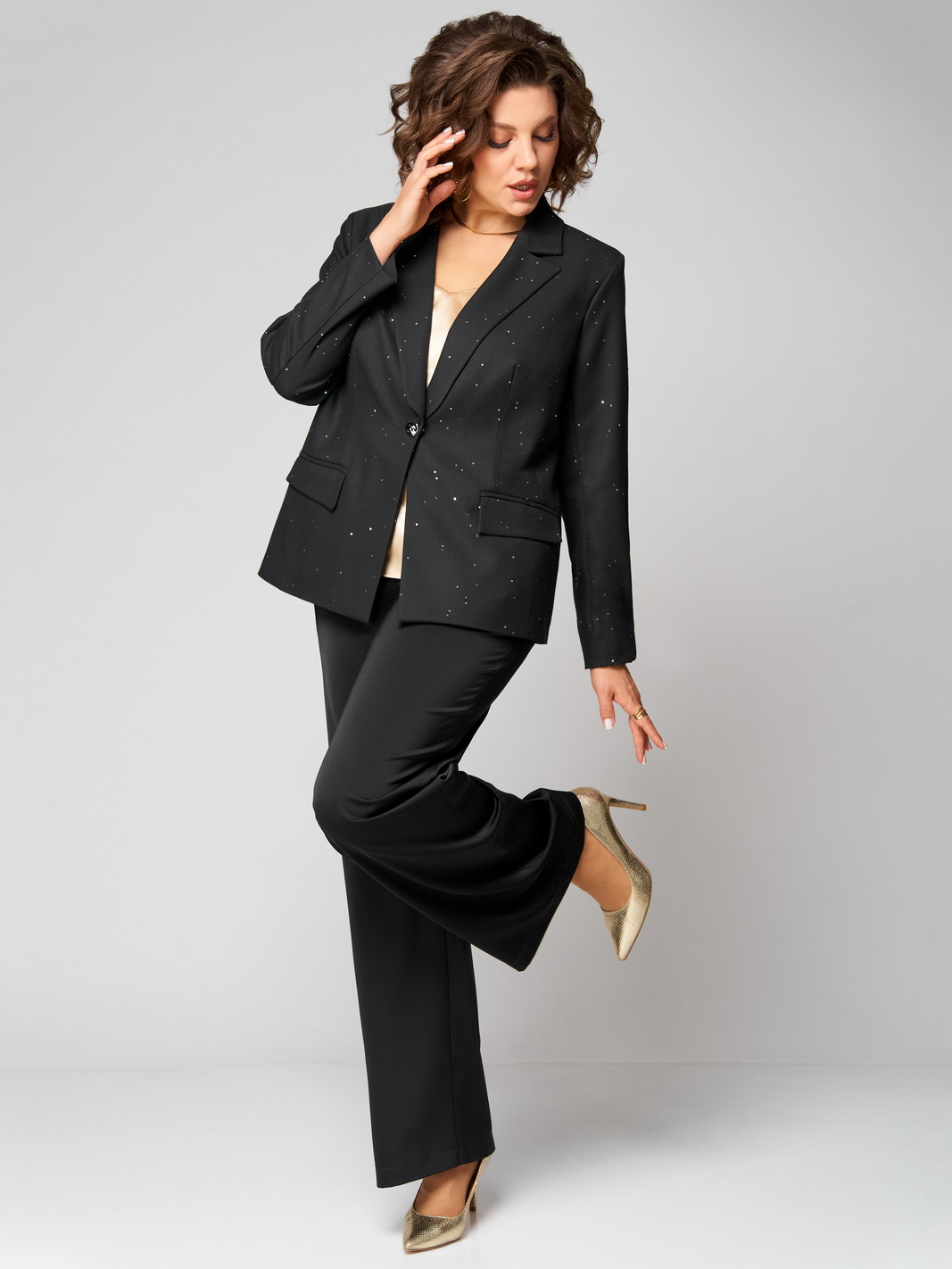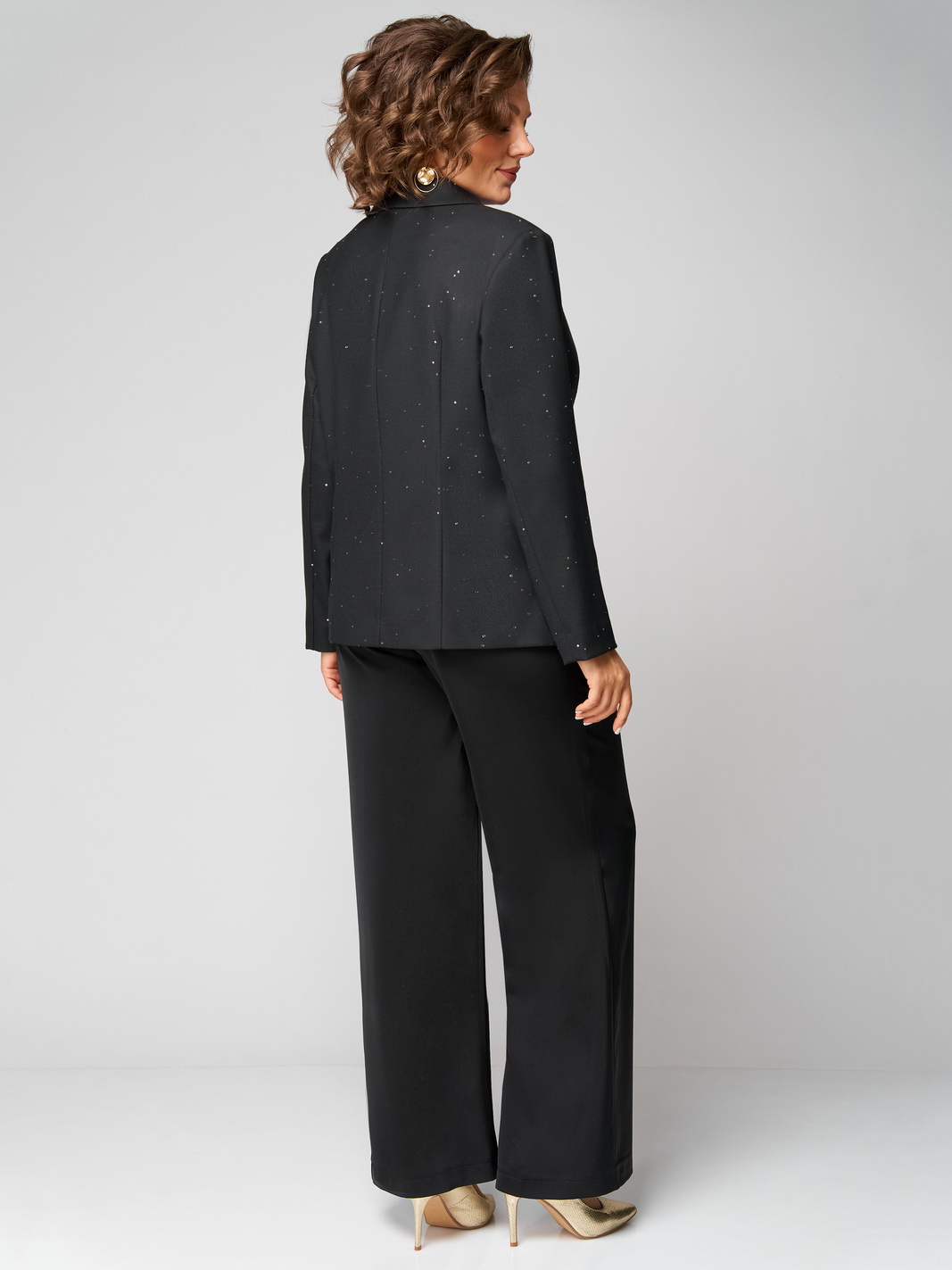 Описание: Стильный, женский двухпредметный комплект, жакет и брюки. Жакет выполнен из поли вискозной ткани в расшитые пайетки, частично на подкладке по переду. Воротник отложной с лацканами. По переду прорезные карманы в раму с клапаном. Застежка однобортная на 1 пуговицу и петлю. Длина жакета по спинке – 65см. Спинка со средним швом и талевыми вытачками. Рукав втачной, двухшовный. Длина рукава – 60 см. Брюки прямые из сатина. Длина брюк по боковому шву без пояса – 103 см. Брюки на поясе, по бокам резинка и косые карманы. Топ на бретелях с V-образным вырезом по переду и спинке. По переду застрочены нагрудные вытачки.