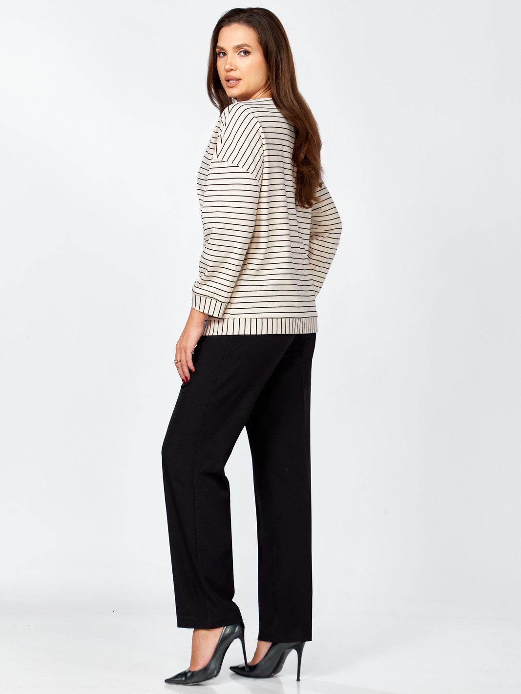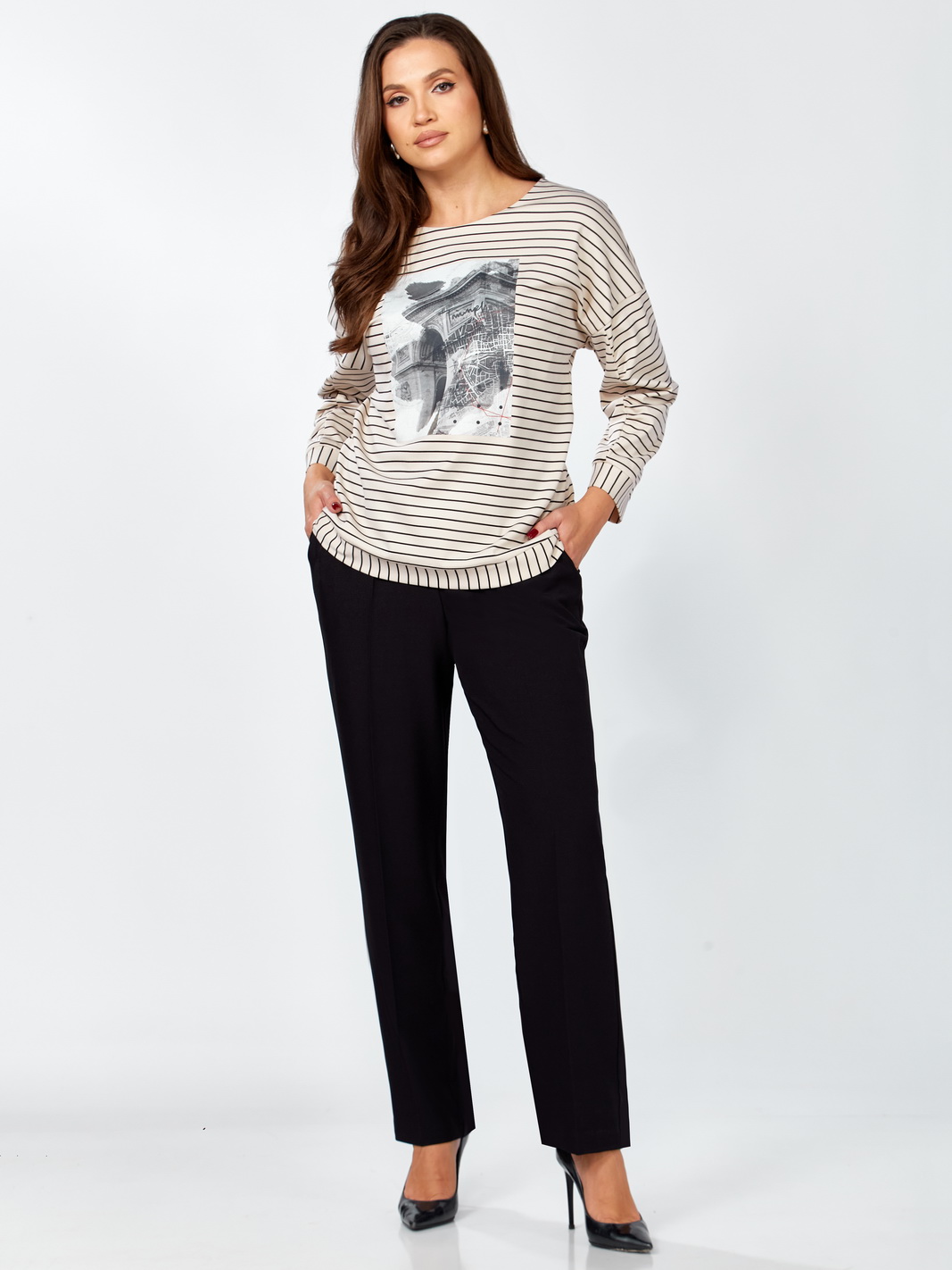 Описание: Комплект женский , двух предметный состоящий из туники и брюки. Туника прямого силуэта выполнена из трикотажного полотна « в полоску» . Горловина переда обработана обтачкой. Линия плеча спущена . По переду авторская термопечать. Рукав втачной, двухошовный, по переднему шву рукава сборка. По низу изделия и рукава приточная манжета. Длина изделия по спинке- 63 см, длина рукава от горловины – 64 см. Брюки прямого силуэта на притачном поясе, с застежкой на тесьму- молнию и 1 пуговицу и петлю, с боковыми наклонными карманами на передних половинках брюк . По передним и задним половинкам брюк заутюжен кант. Для лучшего прилегания брюк в области талии в поясе по бокам вставлена резинка.