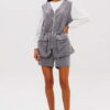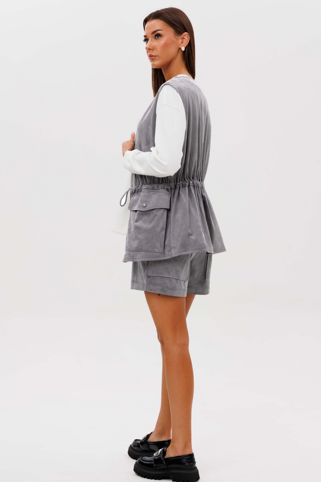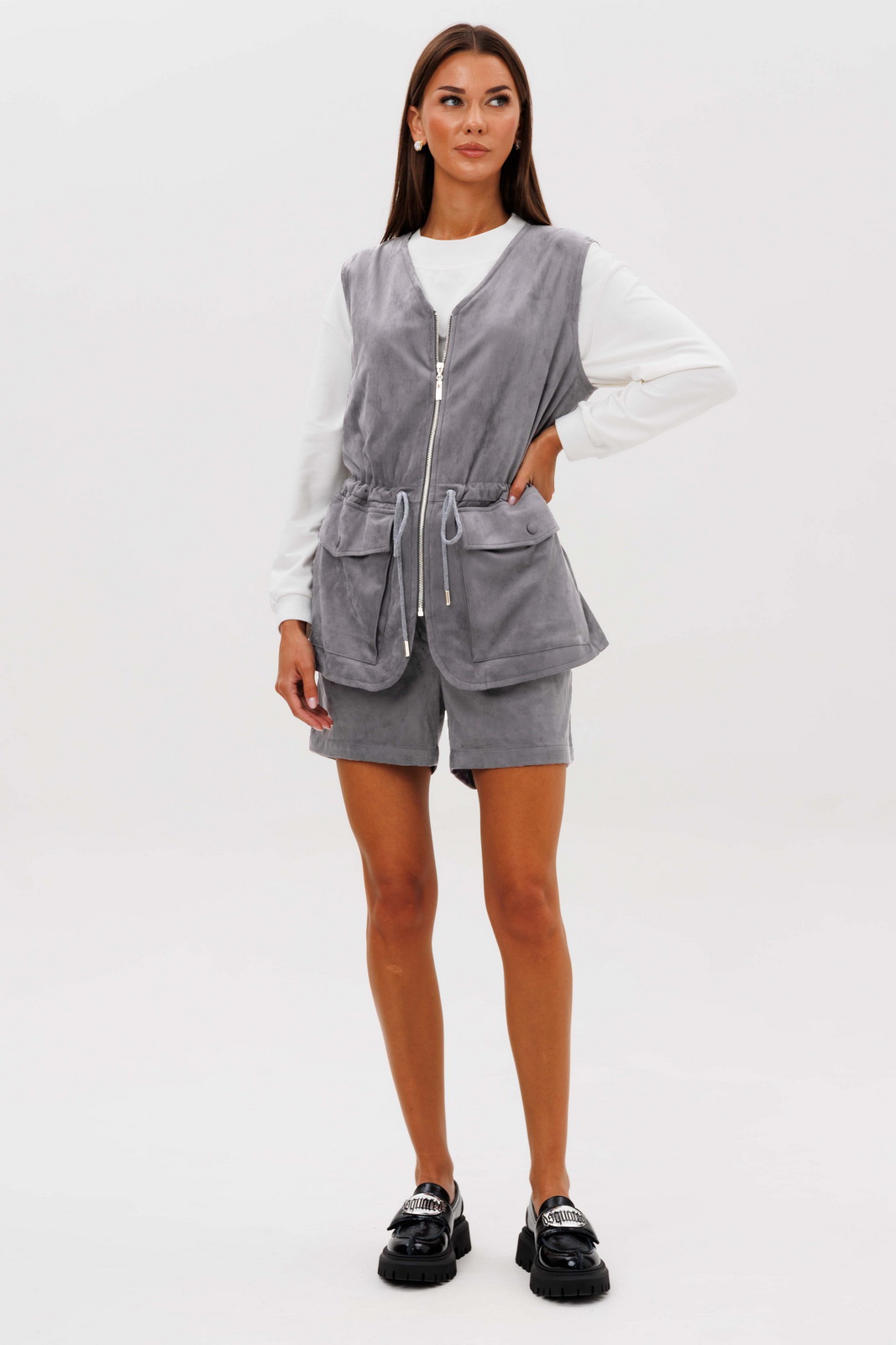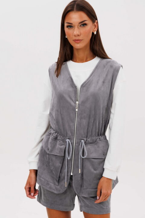 Образ, который говорит сам за себя, смелый и дерзкий, и в то же время очень комфортный. Нестандартный жилет с накладными карманами-пеналами с клапаном. Регулирующая кулиса, подчеркивающая талию. Свободный силуэт, центральная застежка на тесьму молнию, фигурная линия низа. Жилет на подкладке.
