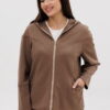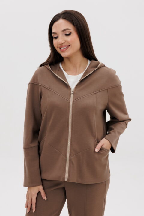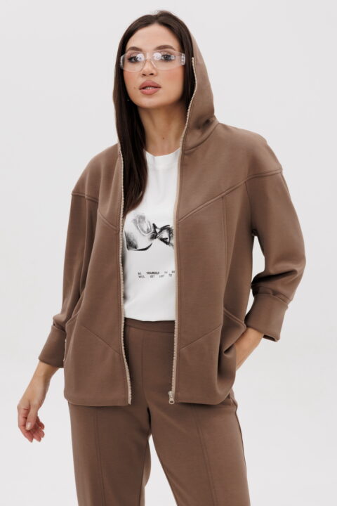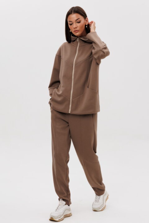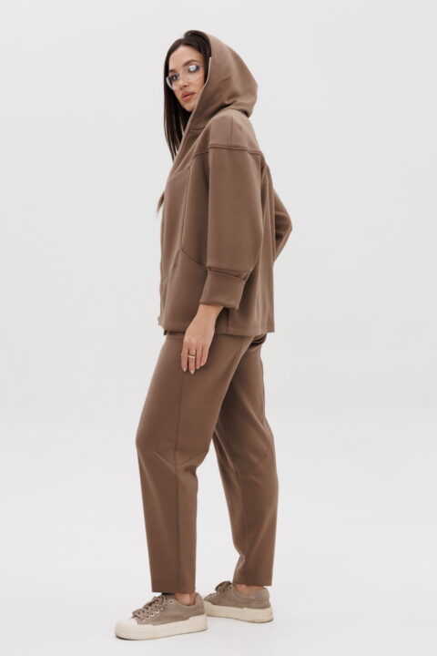 Свободный силуэт, комбинированный покрой, центральная застежка на тесьму-молнию, капюшон рукав-частичный реглан с отрезной широкой манжетой и мягкой складкой в области локтя. Полочка с отрезной кокеткой и фигурным рельефом, переходящим в карман. Спинка с отрезной кокеткой. Брюки свободные, на эластичном поясе в области спинки, с фигурными вертикальными рельефами по центру передних и задних половинок, вытачками в области колена и боковым наклонным карманом.