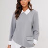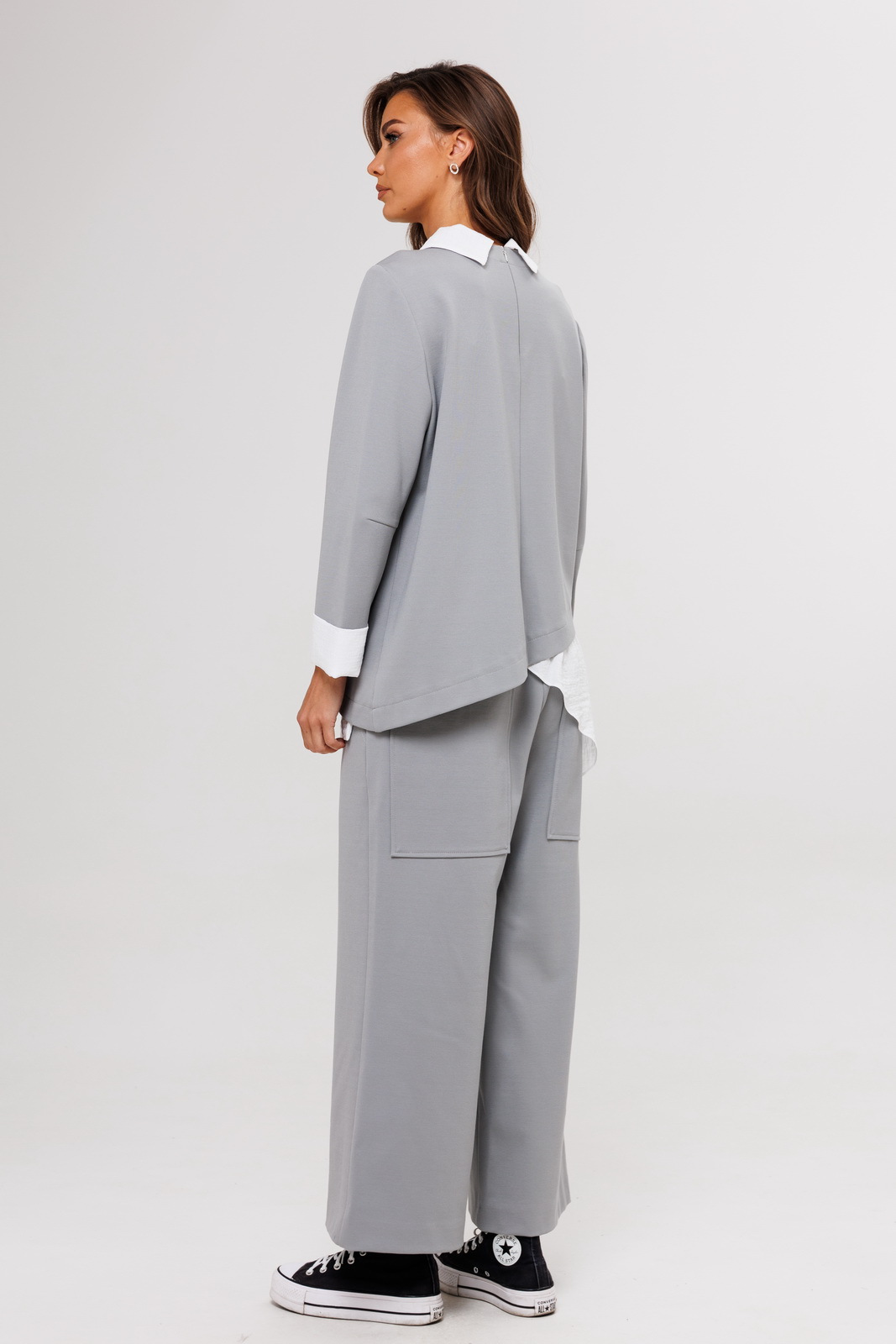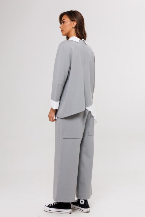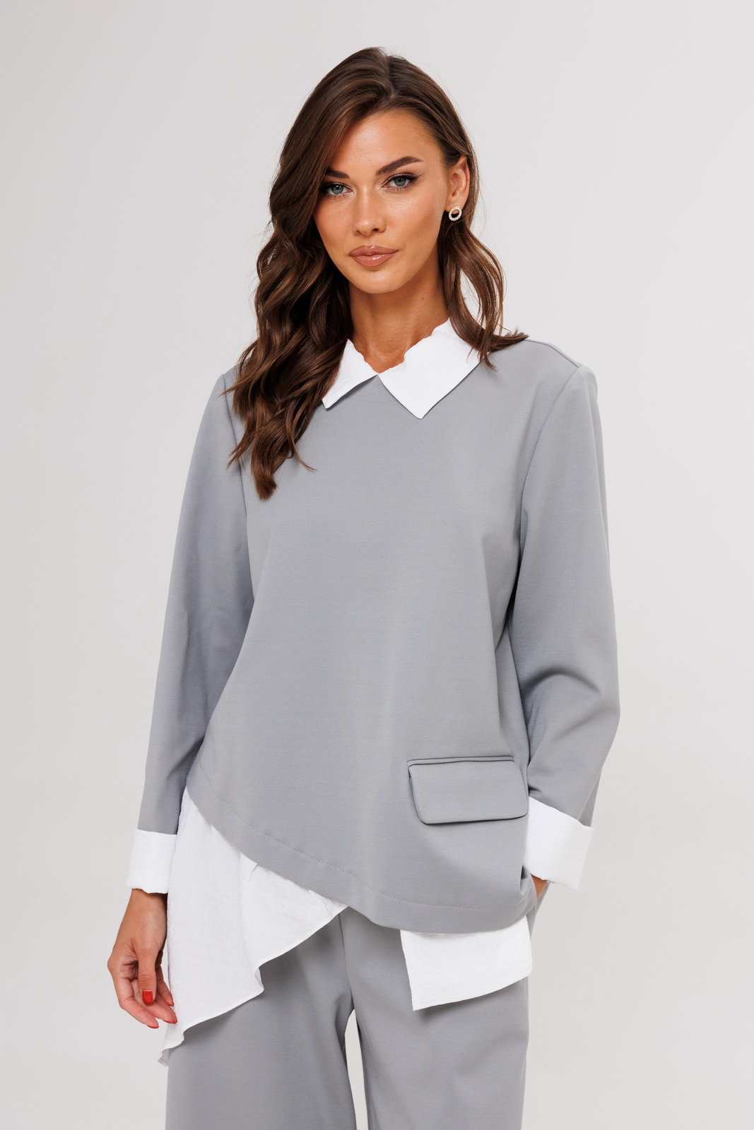 Верх: асимметричный джемпер с контрастным белым воротником и вставками, создающий эффект многослойности. Декоративный карман добавляет акцента.
