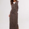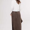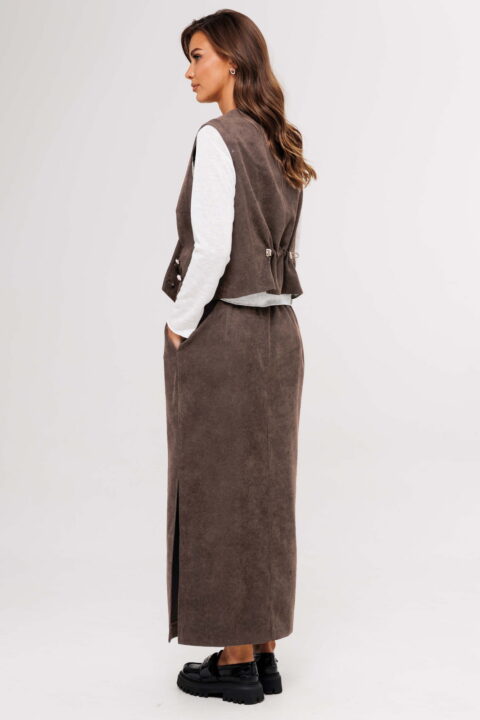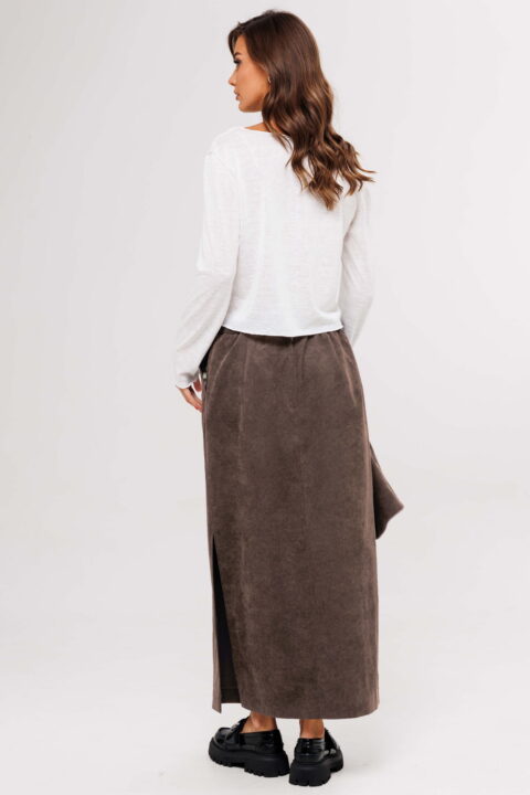 Юбка прямая с застёжкой и боковыми карманами по переднему полотнищу, и разрезом сбоку, из текстильного трикотажного полотна эффекта “вельвет”. Пояс эластичный в области спинки.