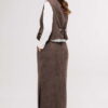 Жилет полуприлегающего силуэта с асимметричной застёжкой, фигурной линией низа и регулирующийся кулисе по спинке. Полочки с отрезным бочком и нагрудными вытачками, спинки – с центральным швом, отрезным бочком и регулирующийся кулисой с фиксаторами.