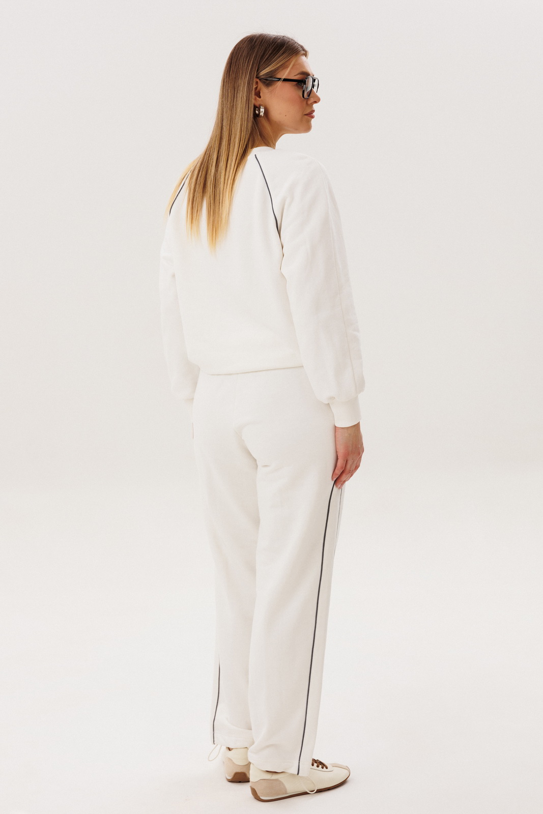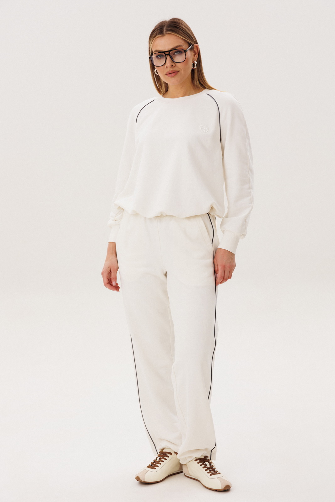 Описание: Спортивный костюм не предназначенный для занятия спортом, эдакая разновидность спортивной одежды в современной моде, выражающая характерную для спорта эстетику с помощью динамического кроя и отделки. Свободный свитшот покроя реглан с отделочными контрастными кантами по линии притачивая рукава и брендовой вышивкой на полочке.