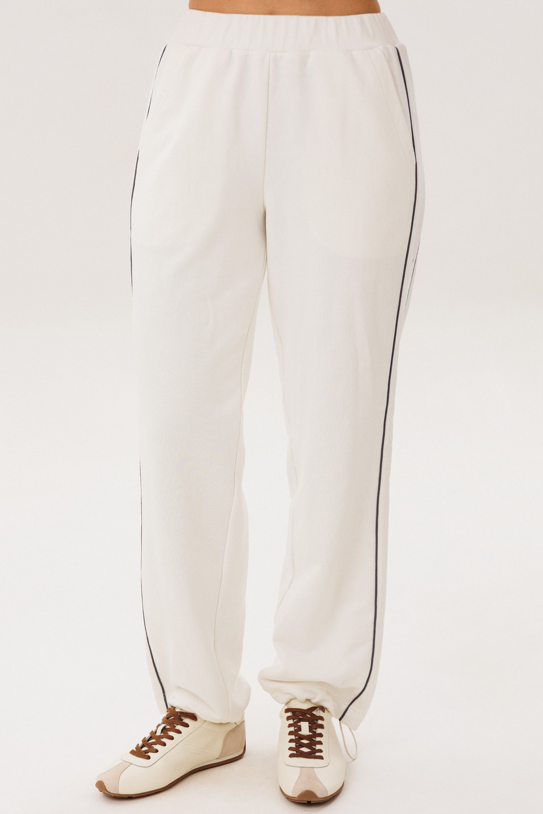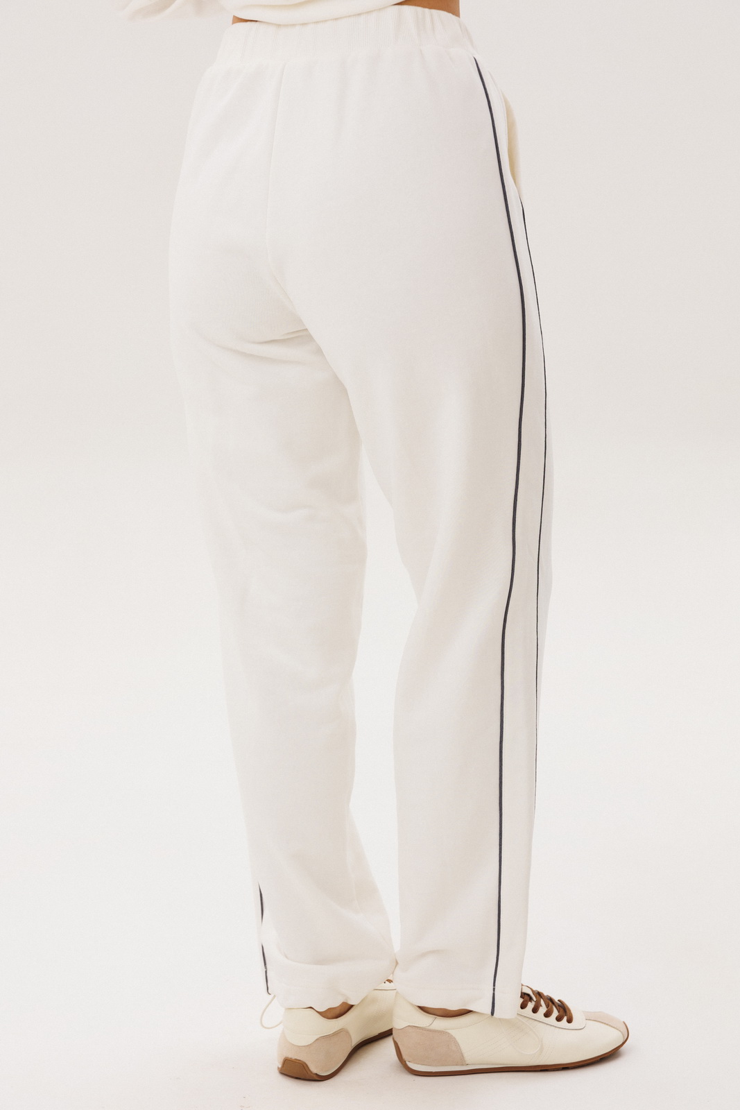 Брюки свободные, расслабленные, на эластичном поясе, с отрезным лампасом, декорированным отделочным кантом. По низу брюк-кулиса с эластичной тесьмой и фиксатором эффектно меняющая стиль брюк с прямого в ” алладины”.