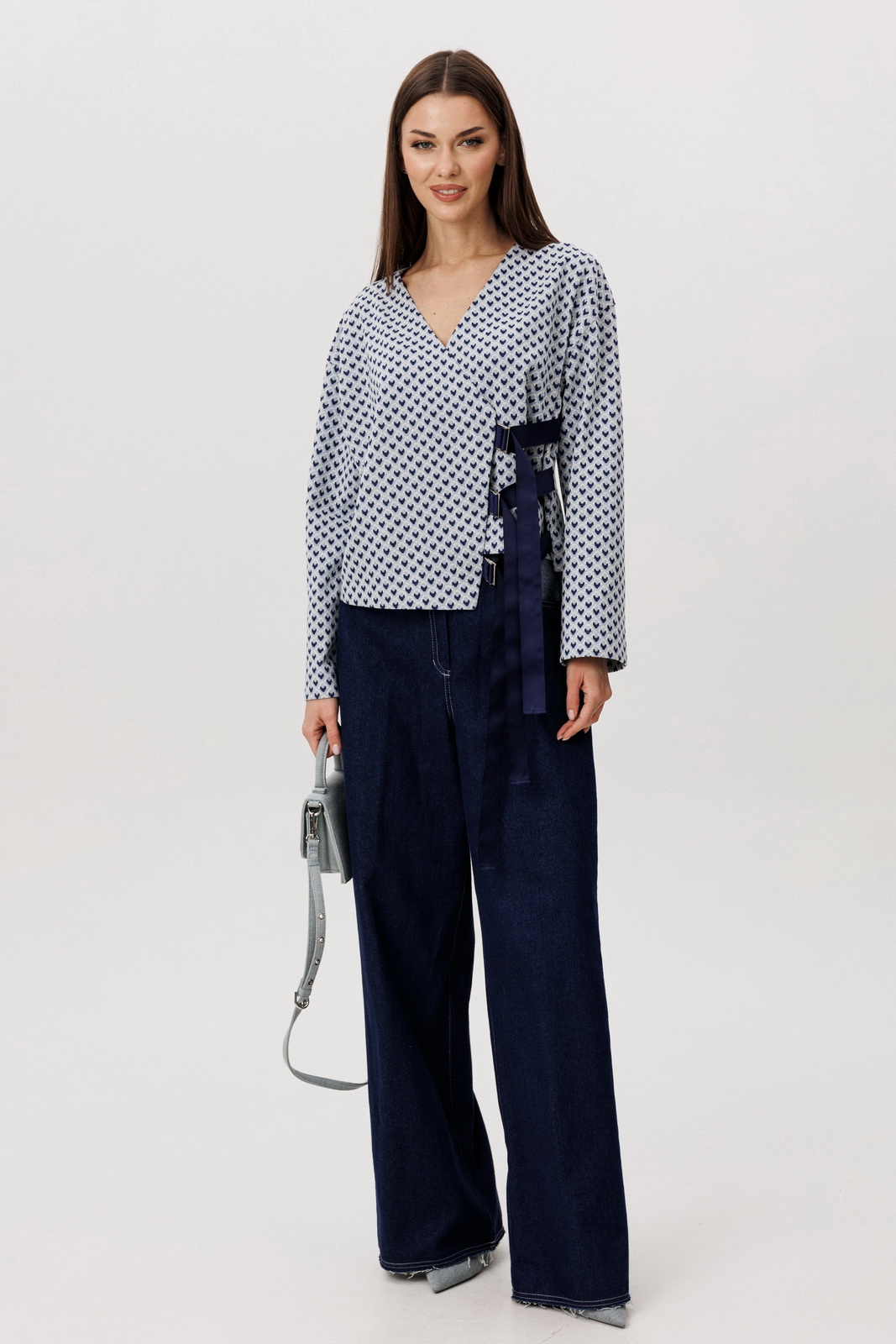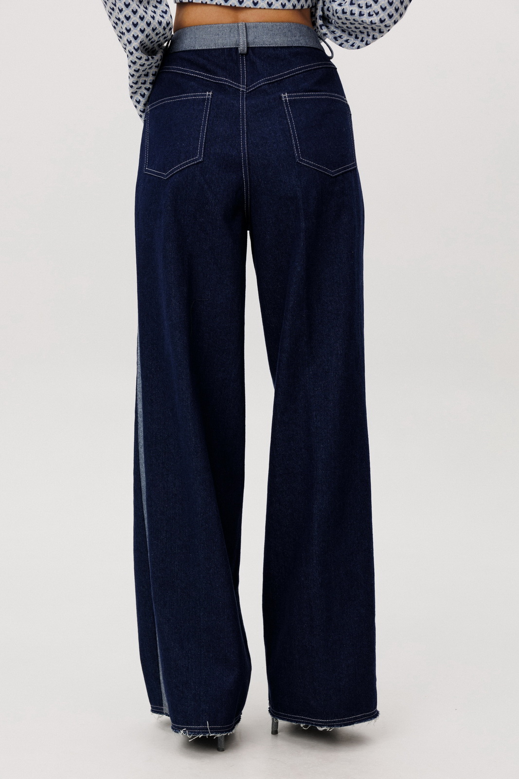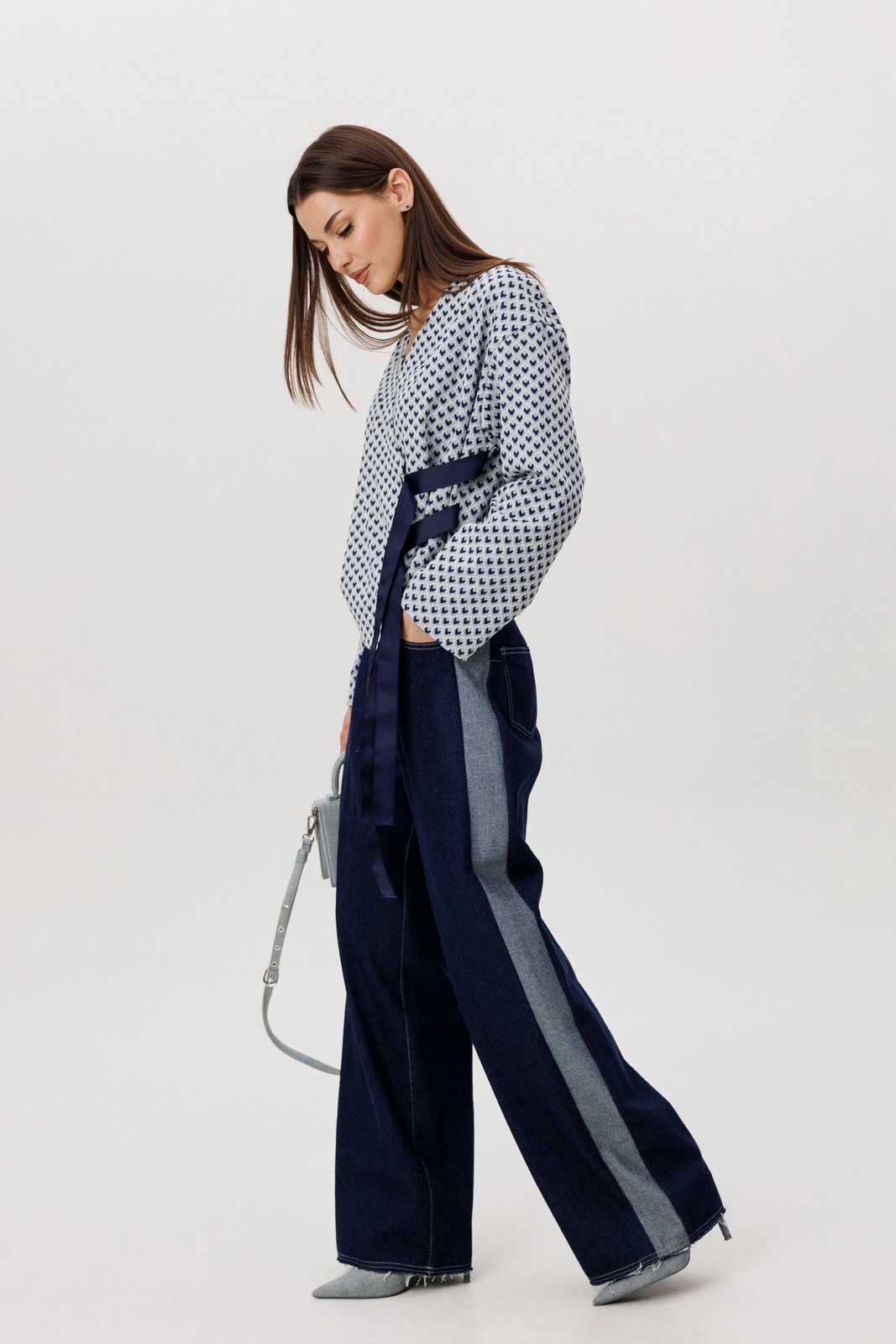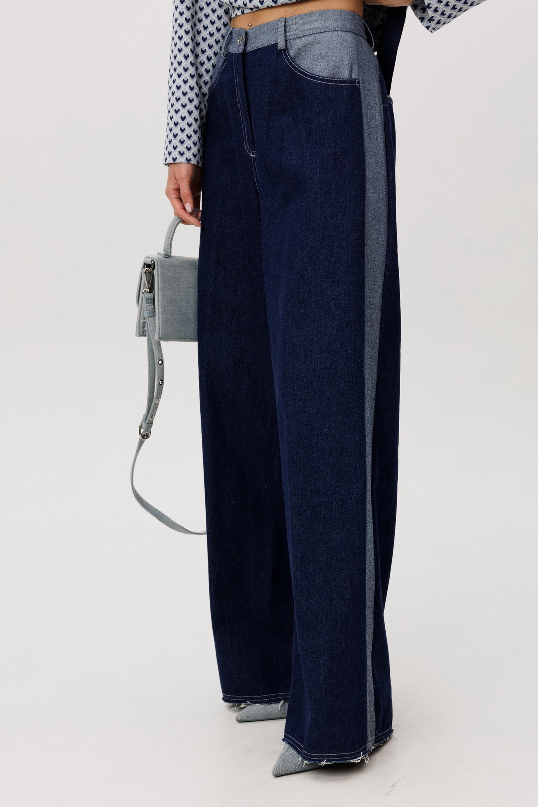 Брюки — широкие джинсовые с высокой посадкой. Плотный деним хорошо держит форму, формируя выразительный силуэт. Расширенный крой от бедра создаёт эффект удлинённых ног и придаёт образу современный характер.