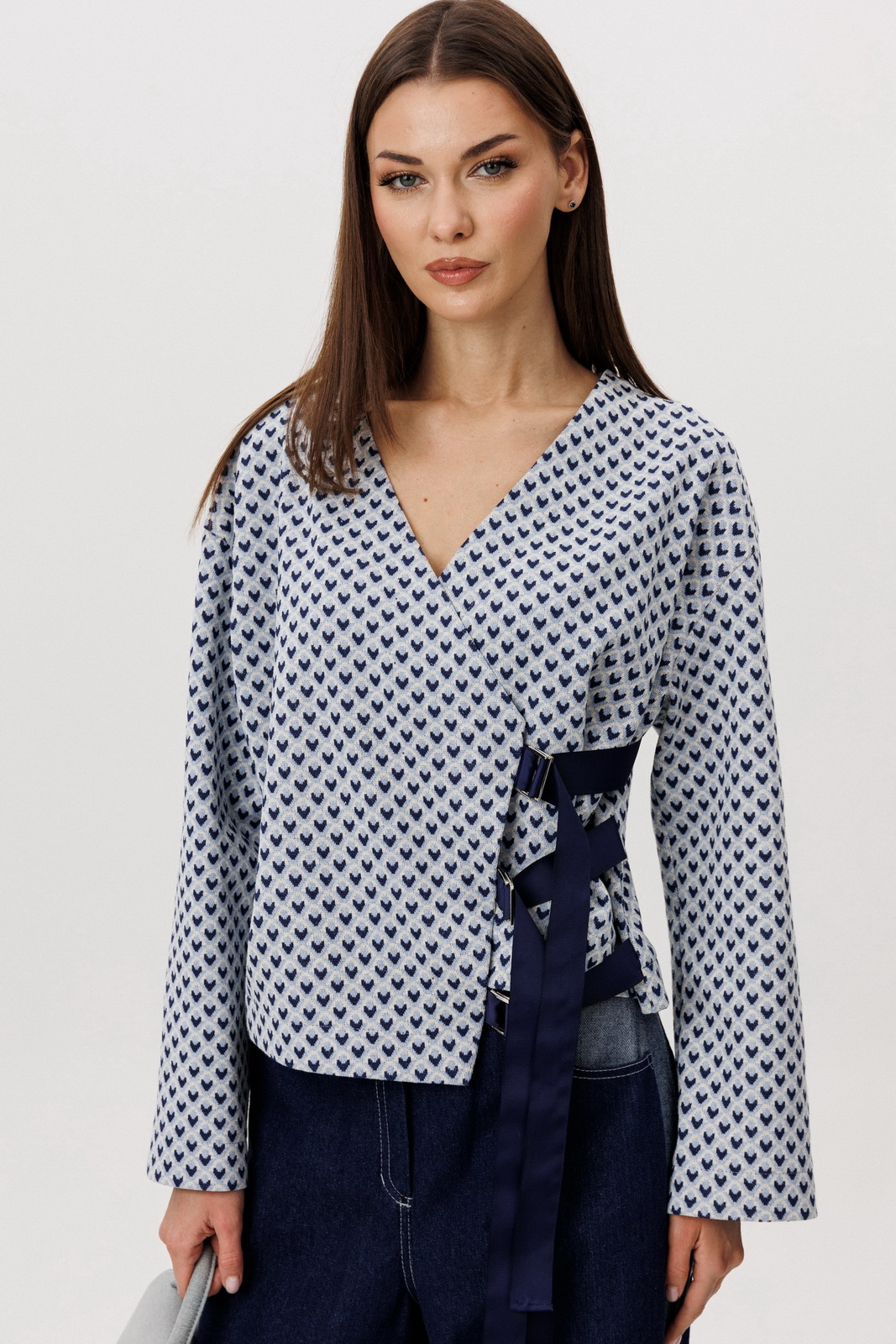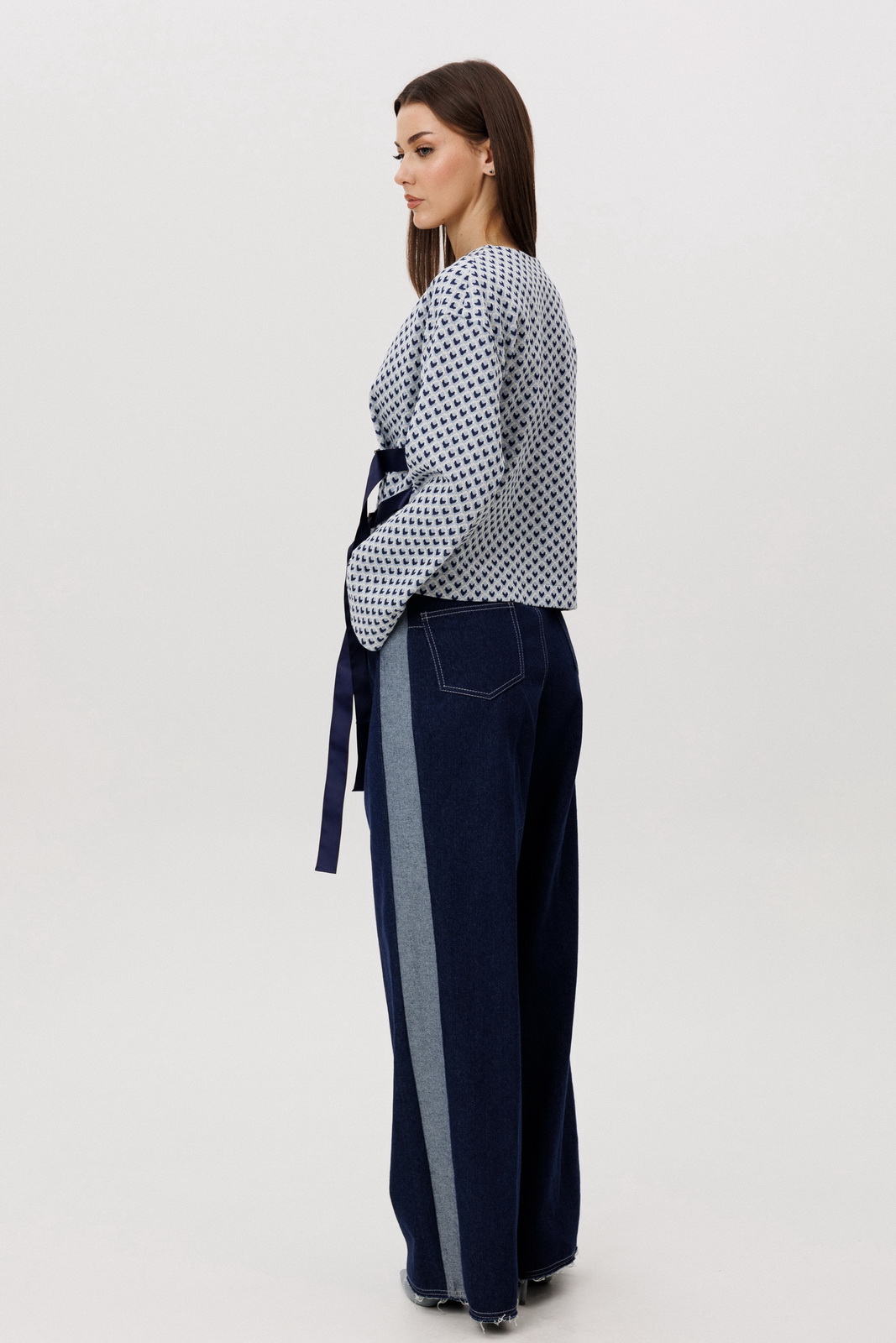 Описание: Современный брючный комплект, в котором гармонично сочетаются комфорт трикотажа и выразительность денима. Идеальное решение для повседневного гардероба в стиле smart casual. Джемпер выполнен из мягкого трикотажного полотна. Лёгкая фактура и свободный крой обеспечивают комфортную посадку и свободу движений. V-образный вырез визуально вытягивает силуэт, а лаконичный геометричный принт добавляет образу динамики и актуальности.