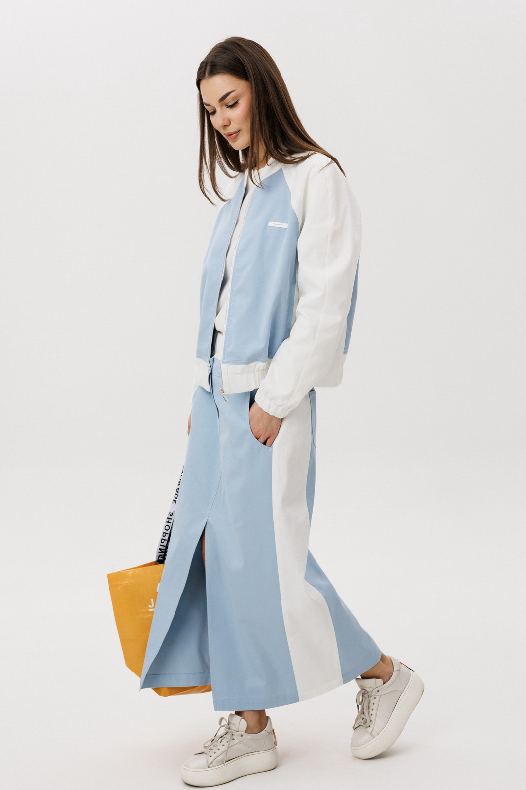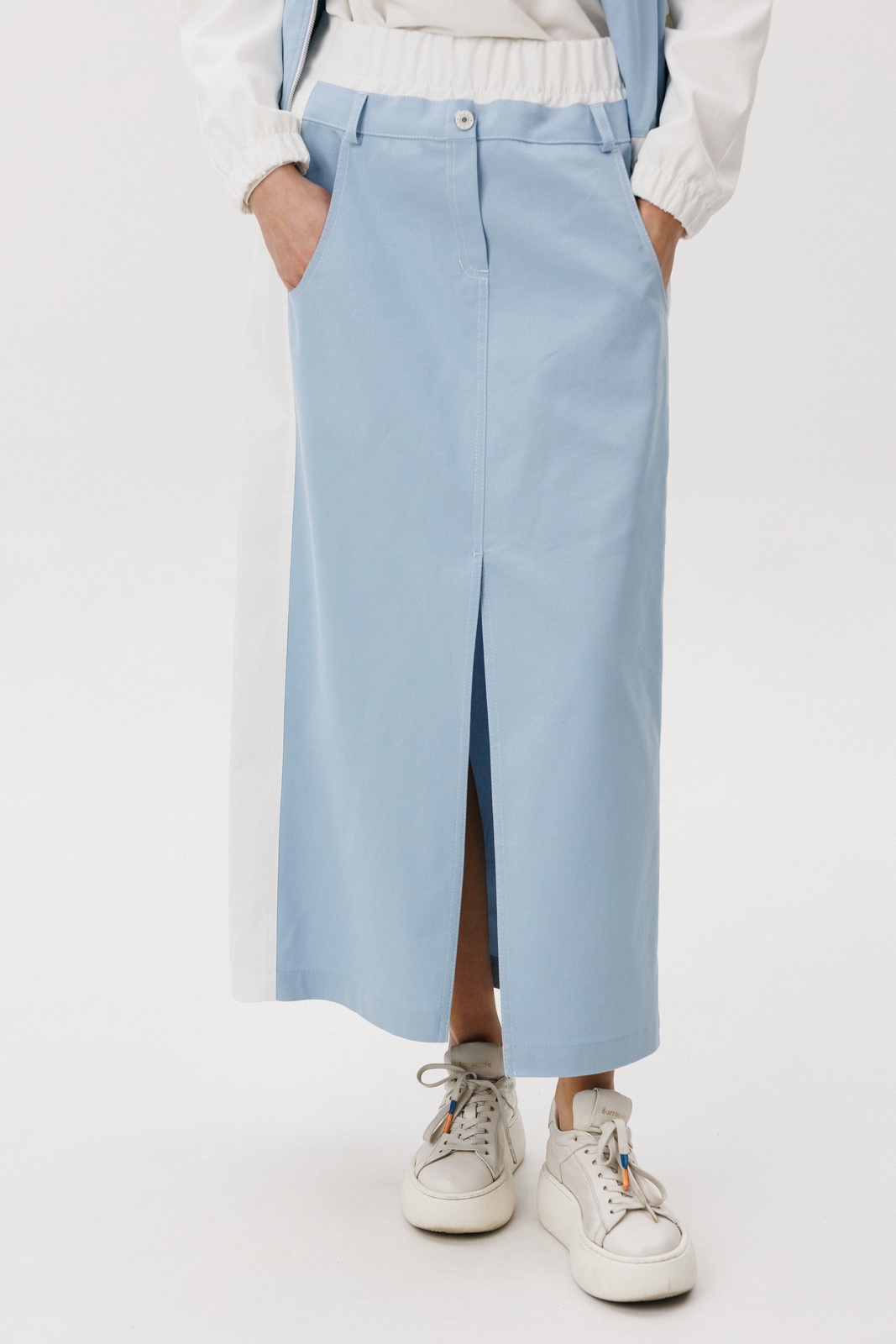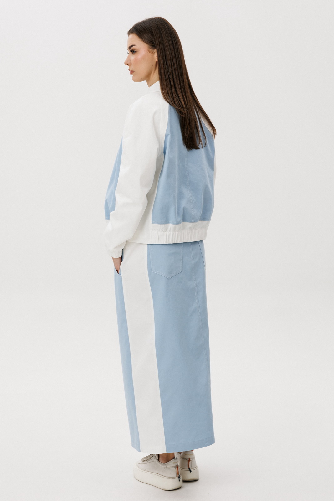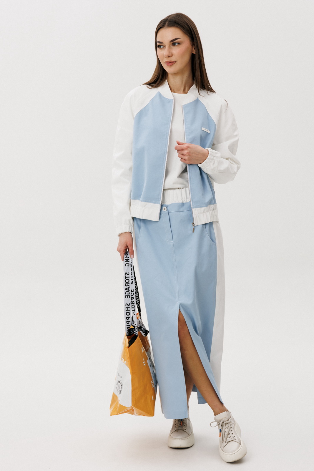 Особенности модели: Юбка миди прямого кроя с аккуратным разрезом спереди Комфортная посадка по талии Лёгкая куртка на молнии с контрастными белыми рукавами