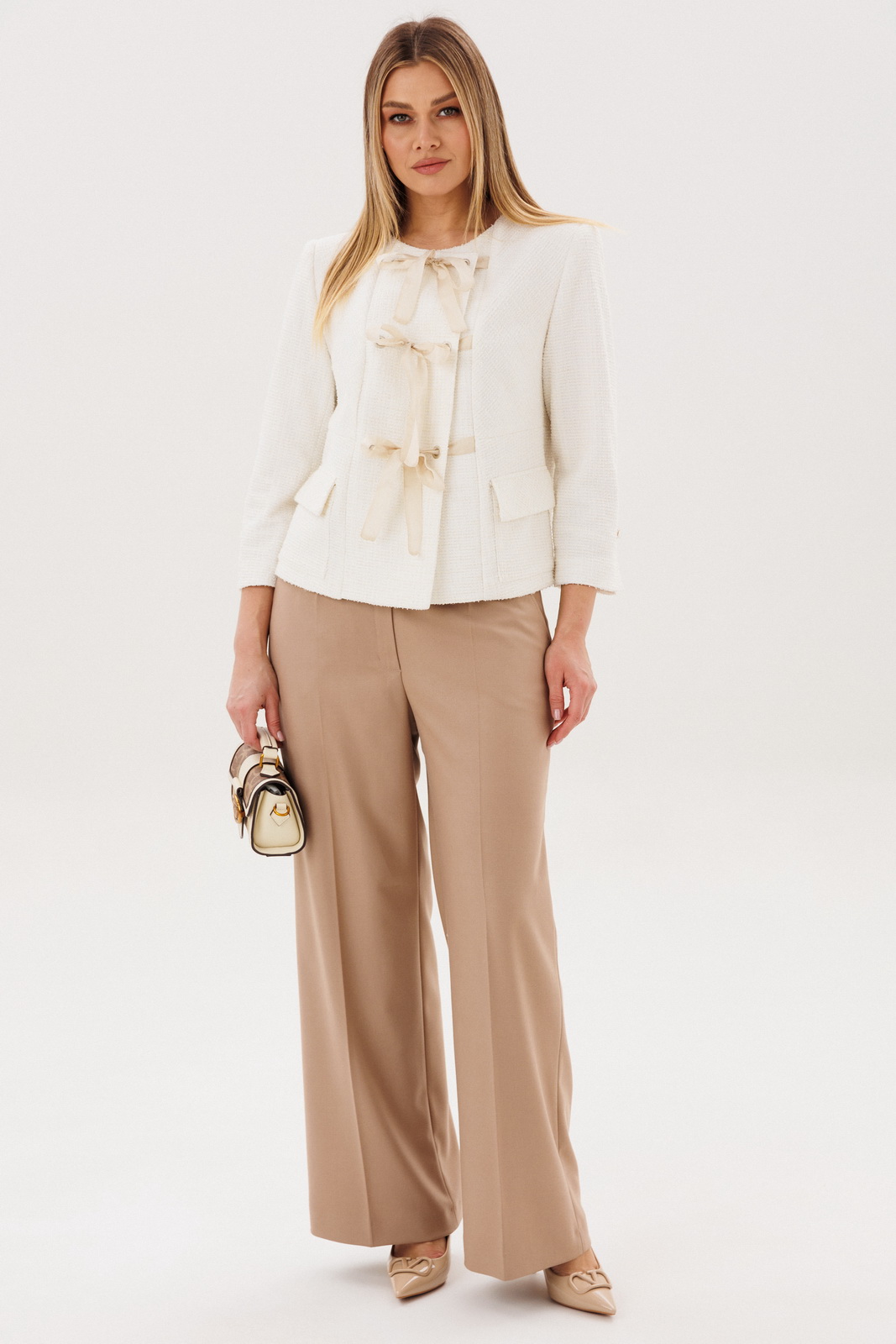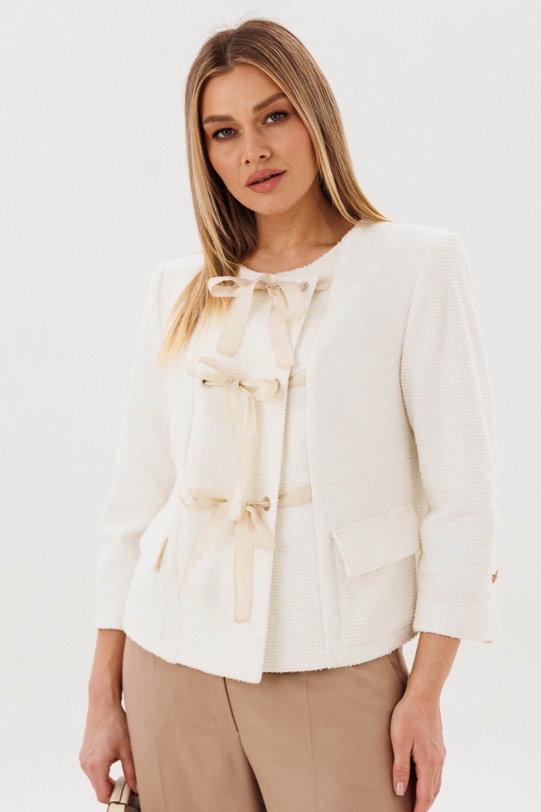 Жакет молочного оттенка выполнен в утончённом стиле и украшен декоративными бантами-завязками, которые придают образу лёгкость и романтичность. Аккуратный крой подчёркивает силуэт, а минималистичные карманы добавляют практичности.