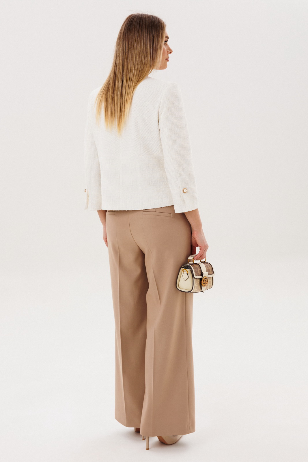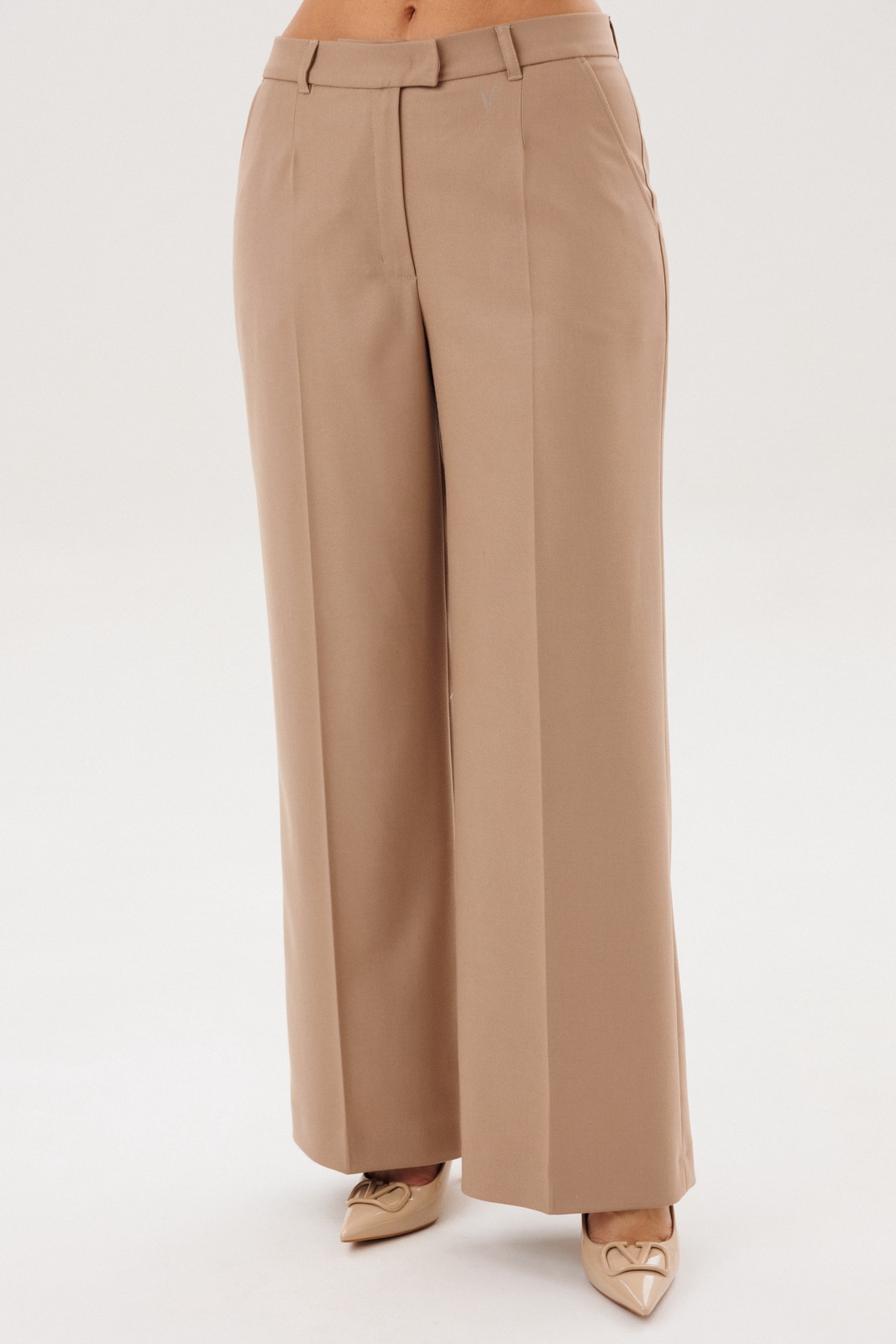 Брюки прямого кроя в благородном бежевом оттенке визуально вытягивают силуэт и создают гармоничное сочетание с жакетом. Комфортная посадка обеспечивает удобство в течение всего дня и делает модель универсальной для разных типов фигуры.