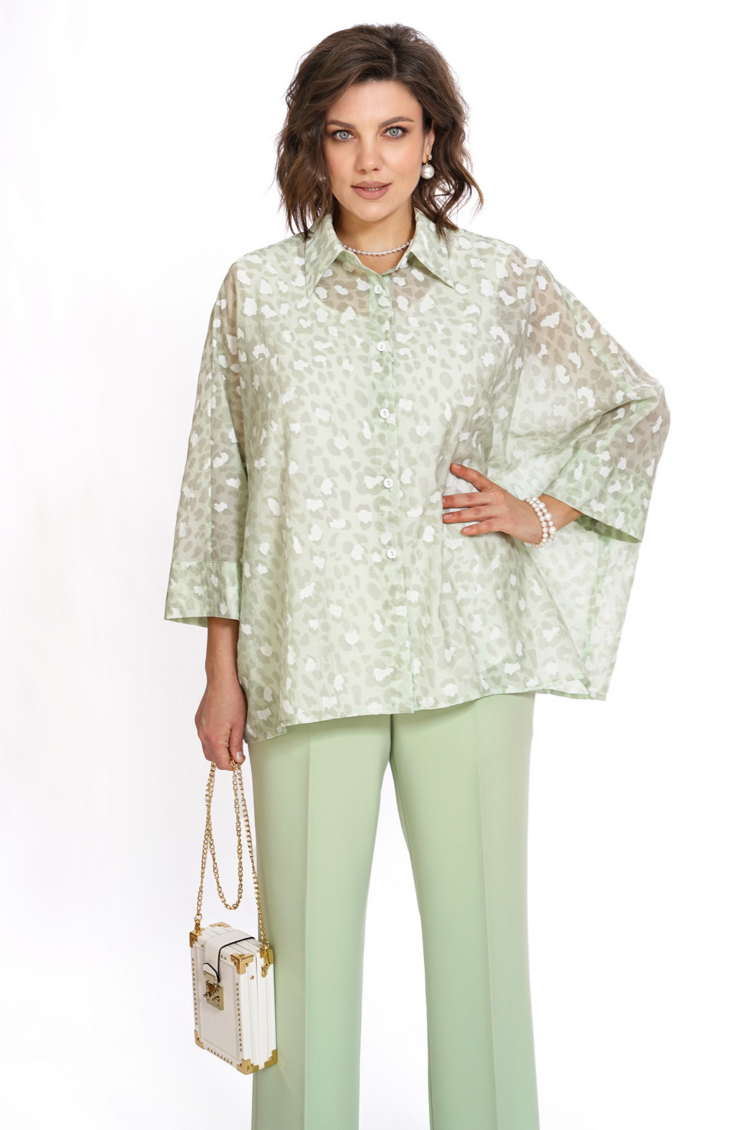 Блуза полуприлегающего силуэта, с фигурной линией низа. Перед с нагрудными выточками.