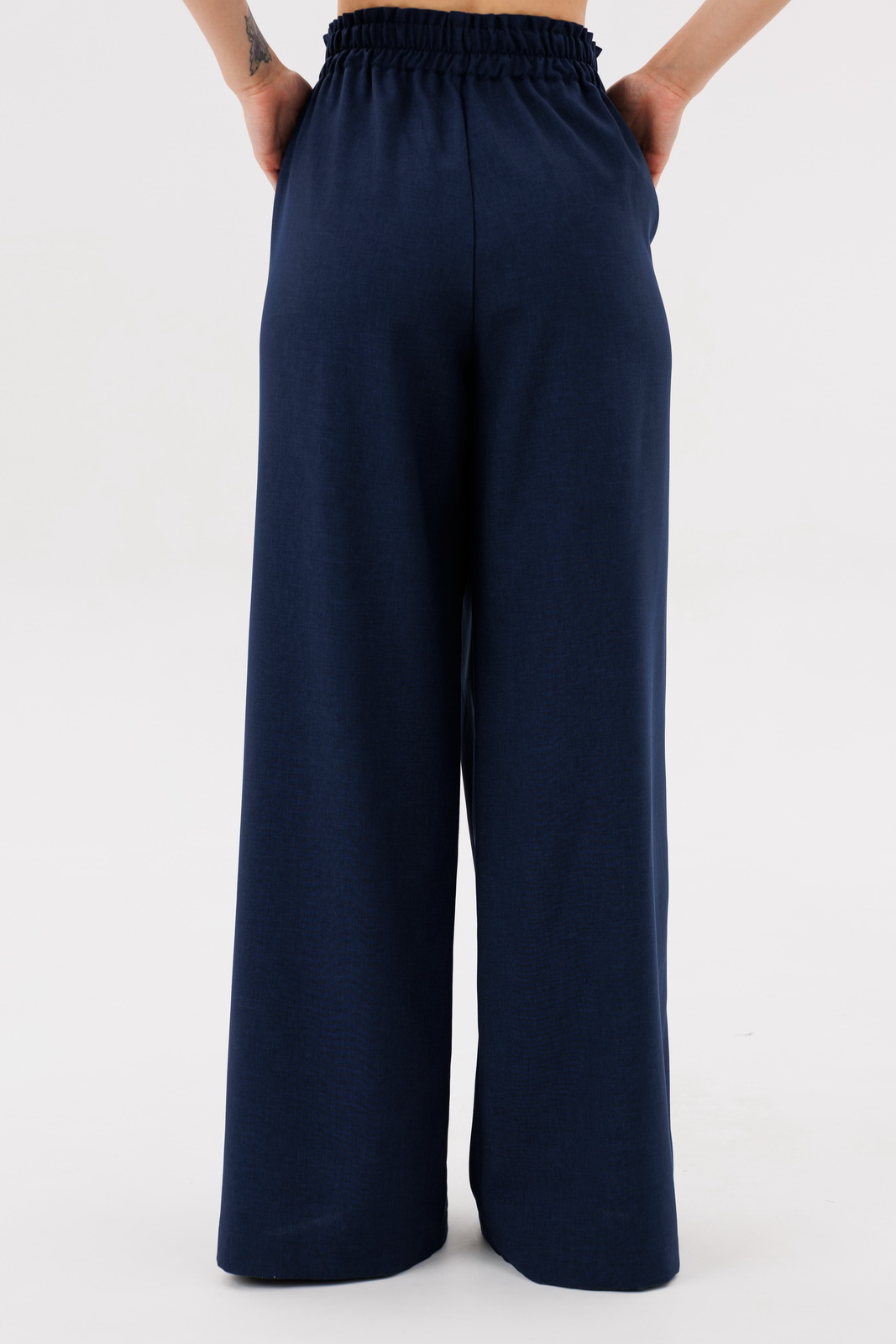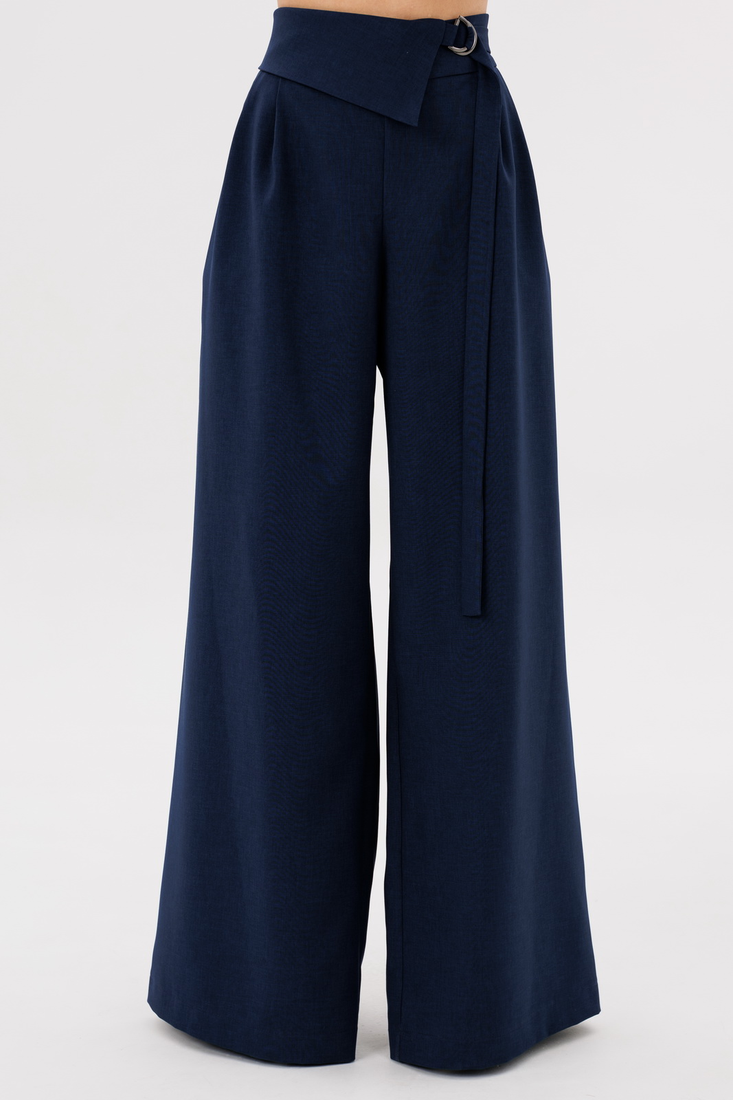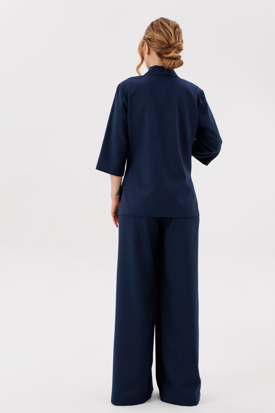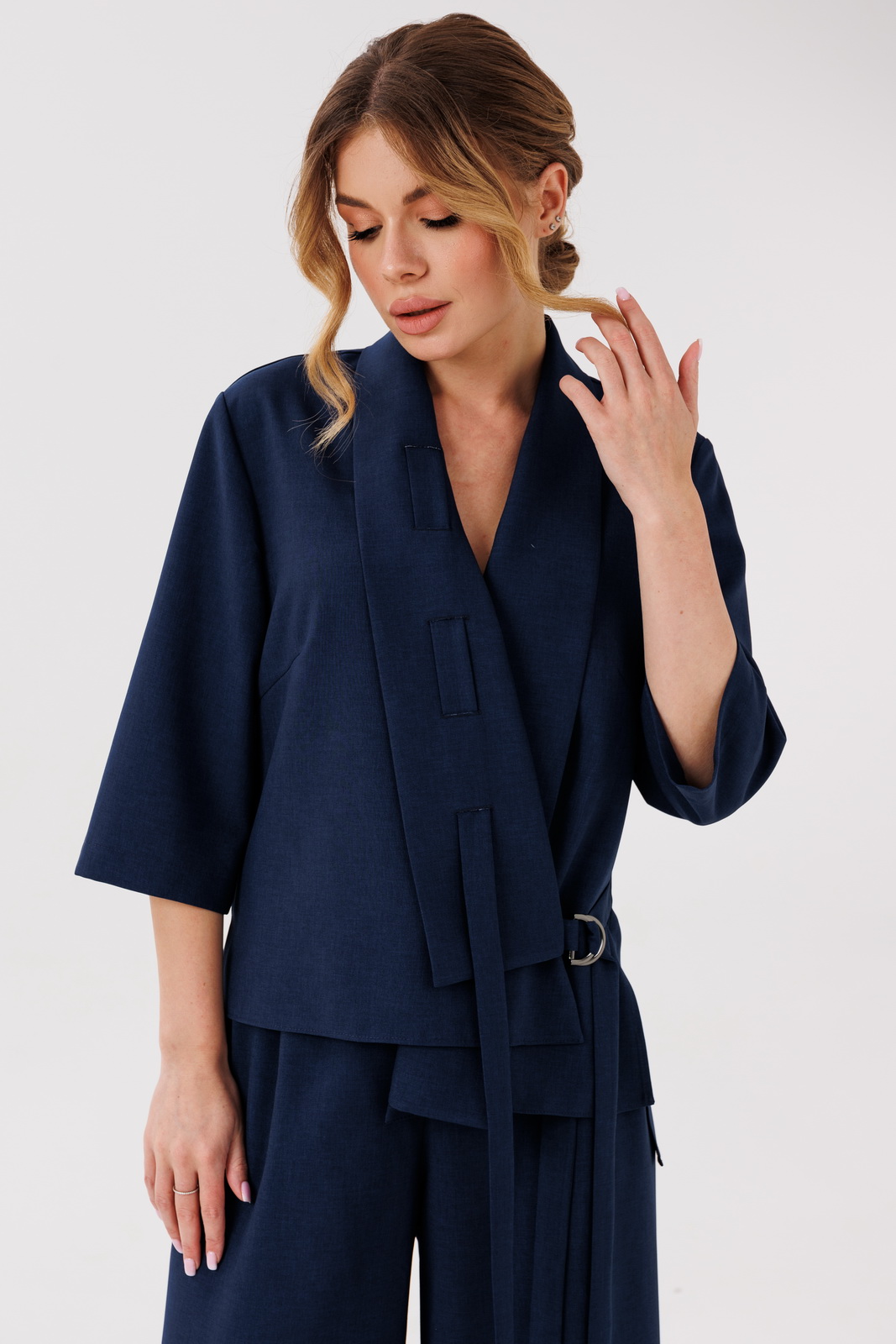 Описание: Жакет женский прямого силуэта, с декоративным воротником и ассиметричным низом.Рукав 3/4. застежка пояс с пряжкой. Брюки палаццо свободного кроя с поясом на резинке. По переду декоративная деталь с пряжкой, иммитация застежки. Вбоковых швах брюк карманы.